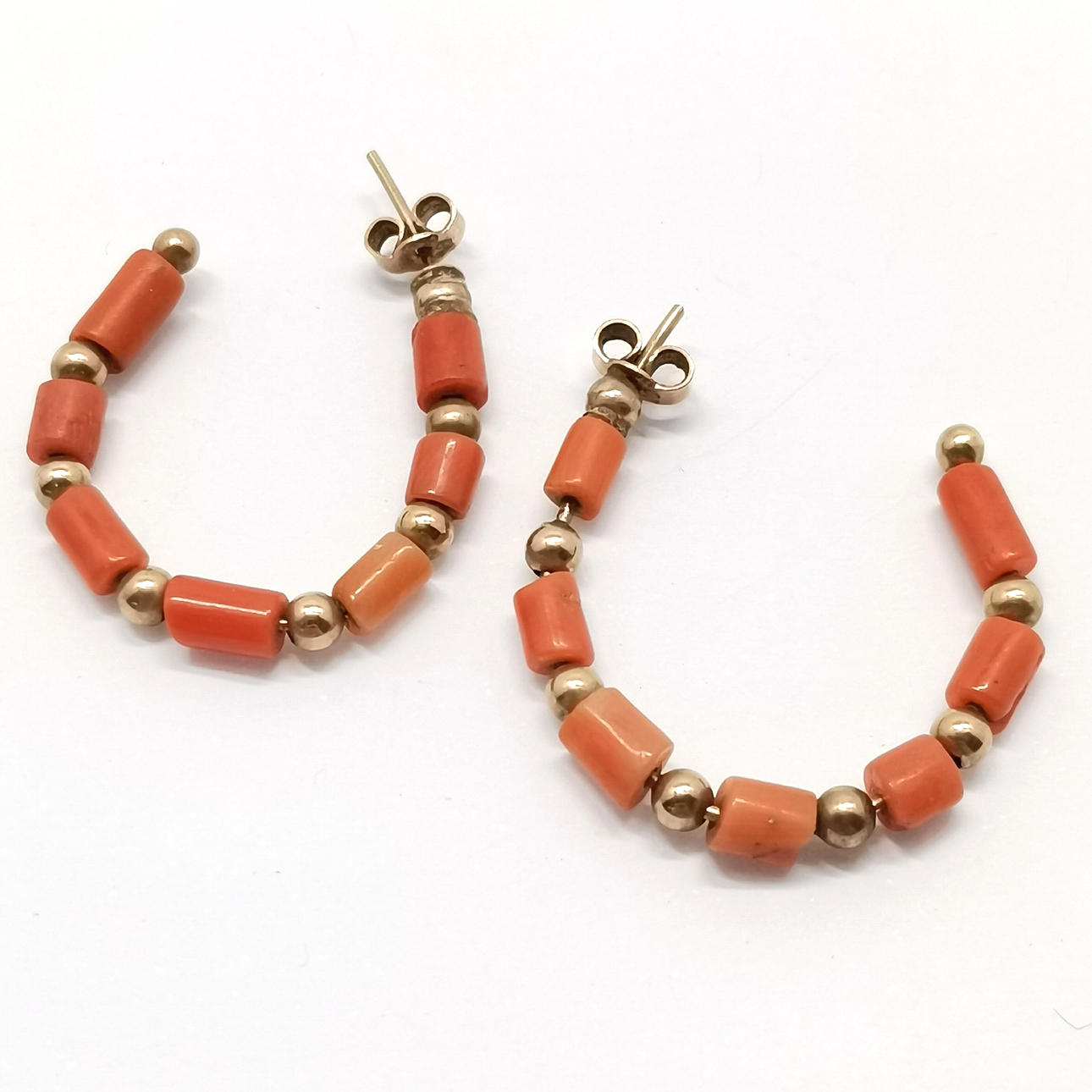 9ct gold & coral hoop earrings - 2.5cm across & 3.7g total weight.