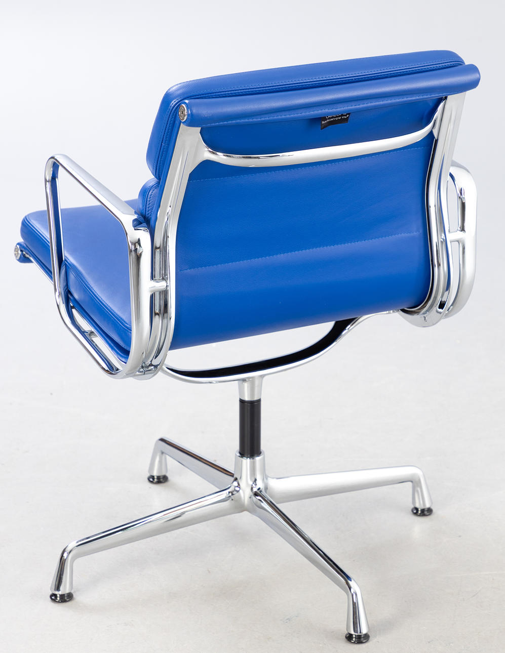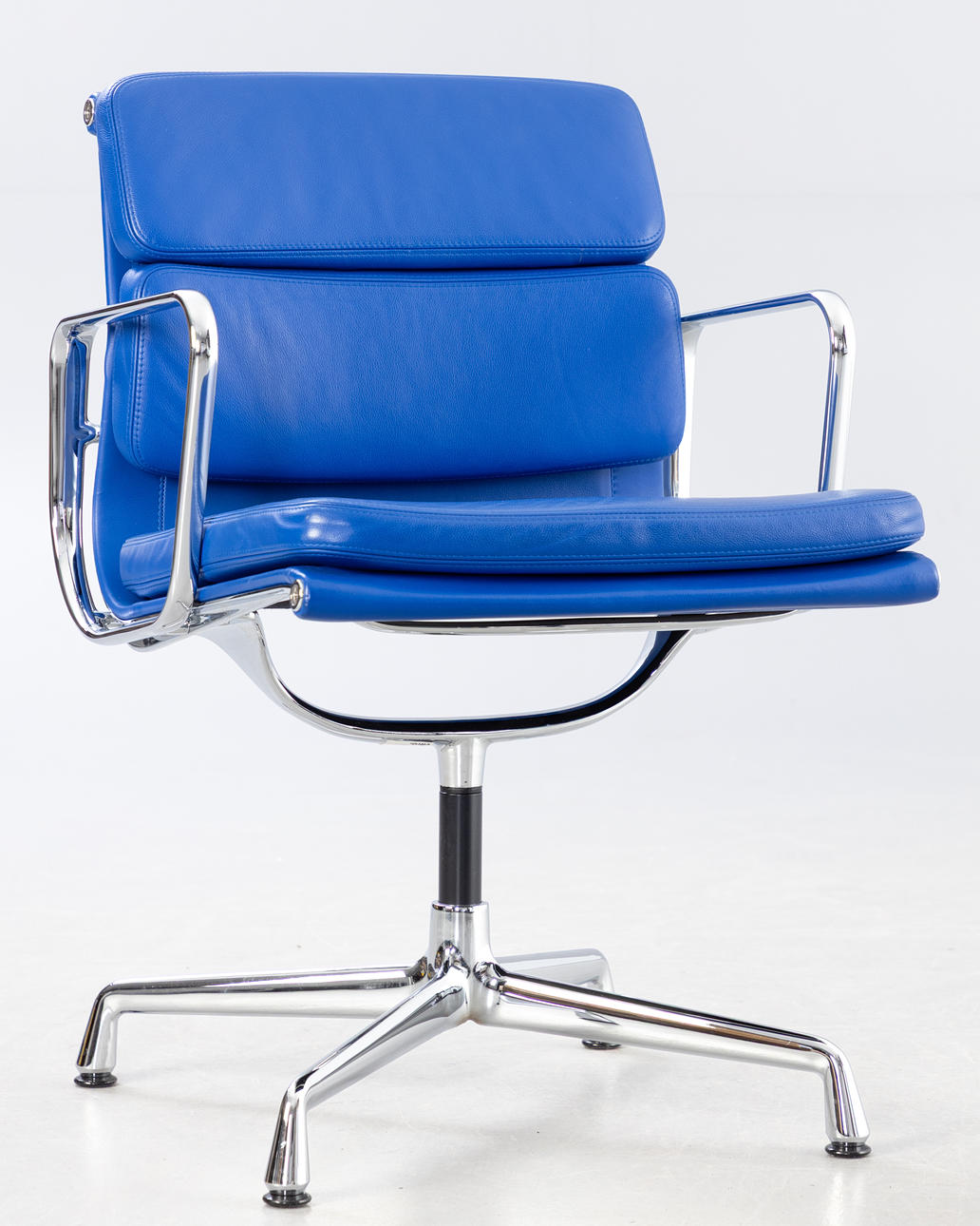 Design: 1969. Execution: 2004. Swivel. Medium-high back. Chrome-plated base and armrests. Blue leather upholstery. Marked with label. approx. H. 84 cm x SH. 43 cm.