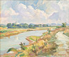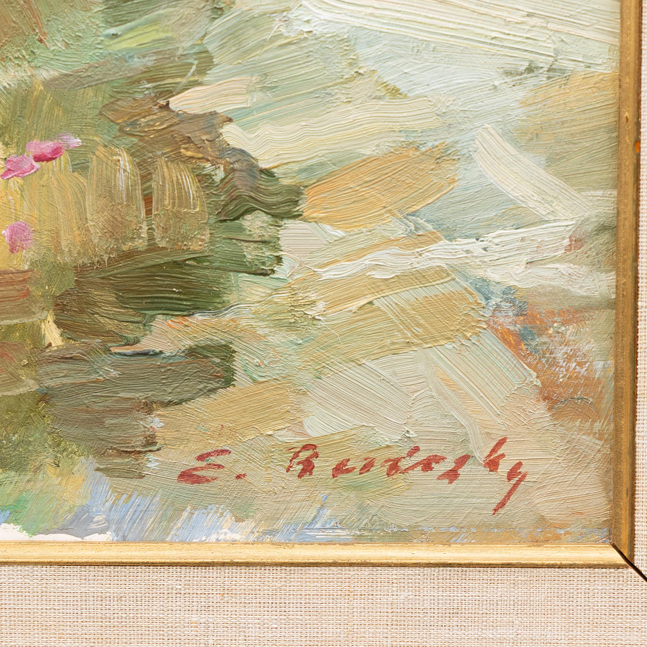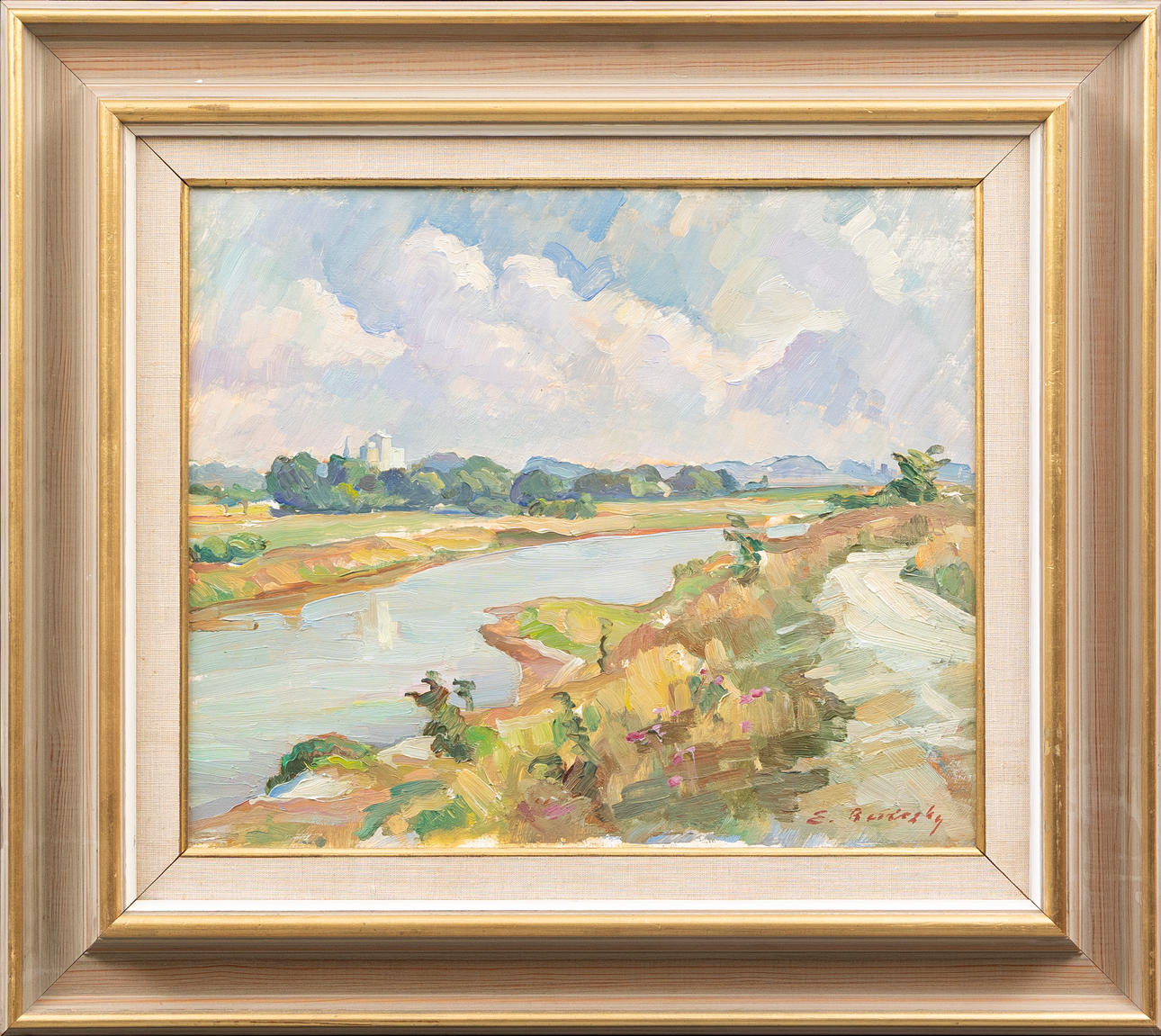 5010850. OIDENTIFIERAD KONSTNÄR. Summer landscape, oil on panel, indistinctly signed E Ber... sky.