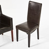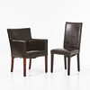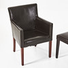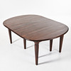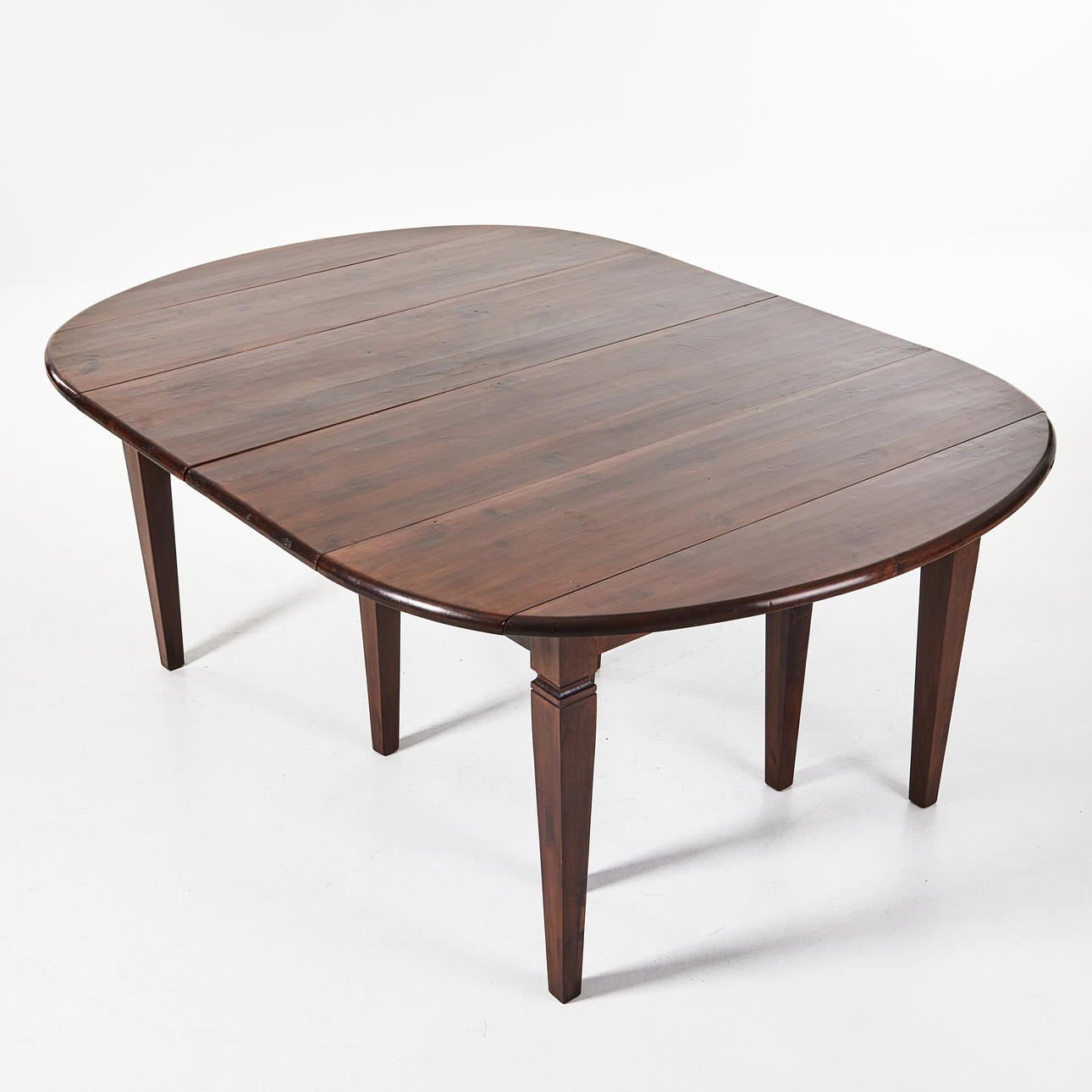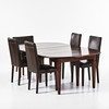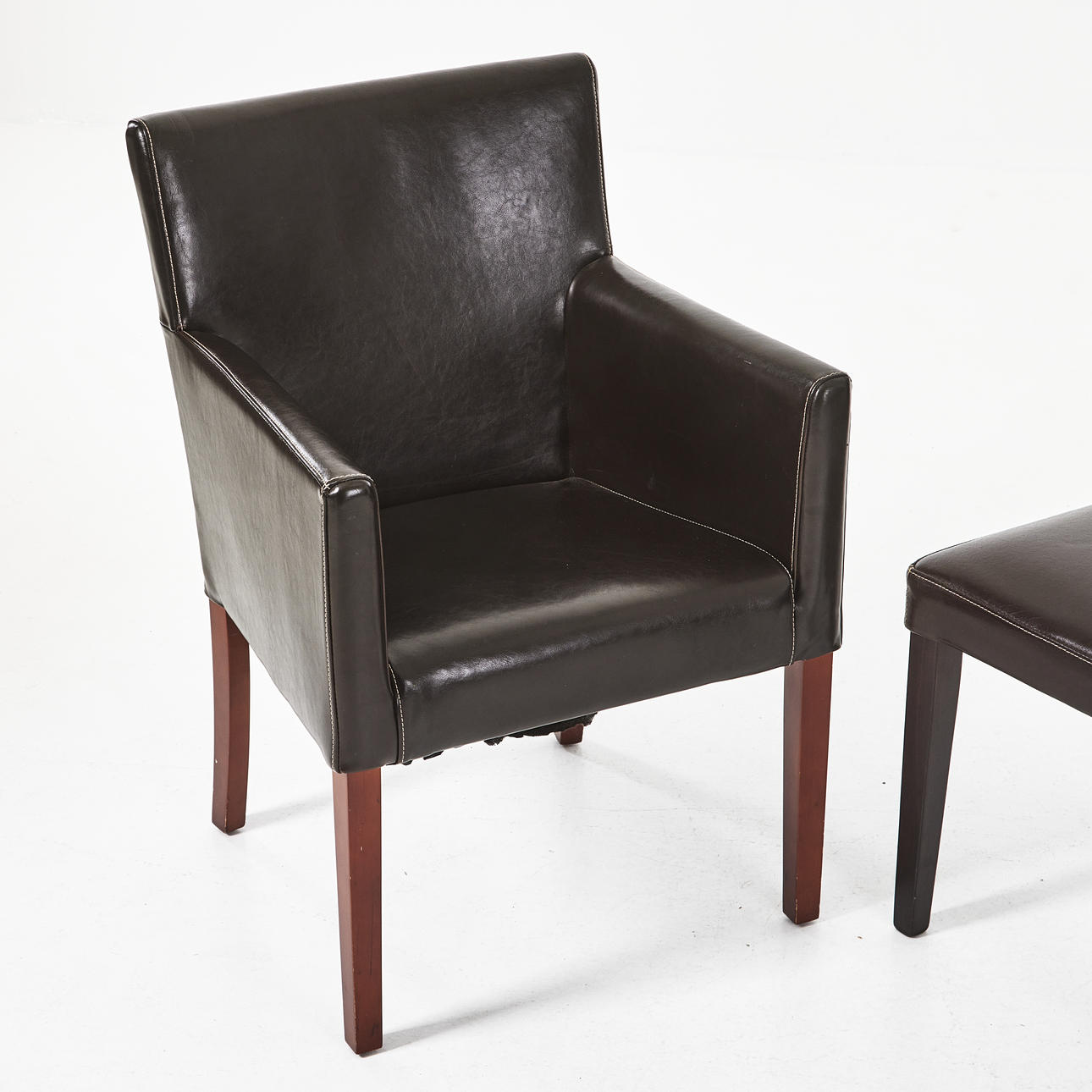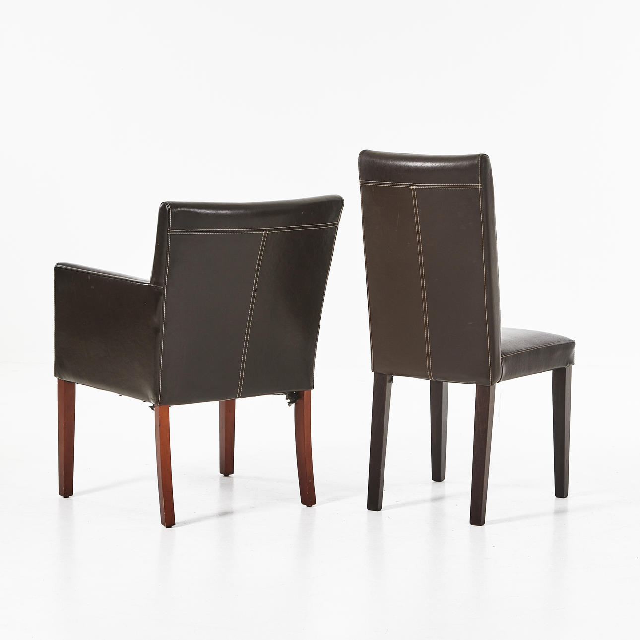 Consisting of 4 chairs and an armchair model “Boston”, leather-upholstered seats, seat height 46, back height 102, dining table “Osterville” dark stained wood, with 5 inserts à 39,5, height 76, dimensions with folded flaps 135x109,5, unfolded 148x135, max length 332 cm.
