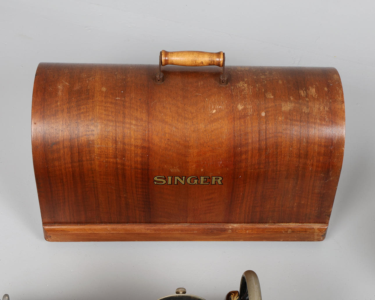 Early 20th Century Singer Model 28K sewing machine, later converted by Singer with an electric motor, No. K7063729, in a carry case, W.50.5cm, and a 15K sewing machine, No. F3932610, cased, W.44cm. (2).