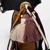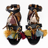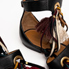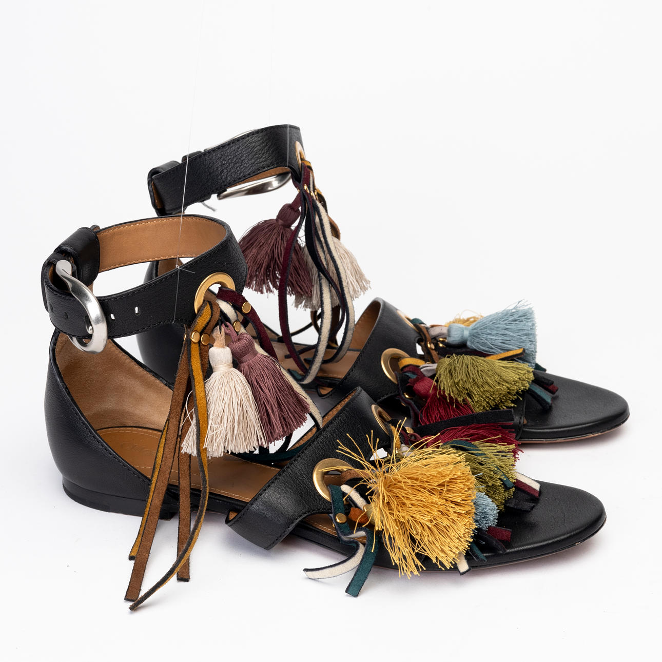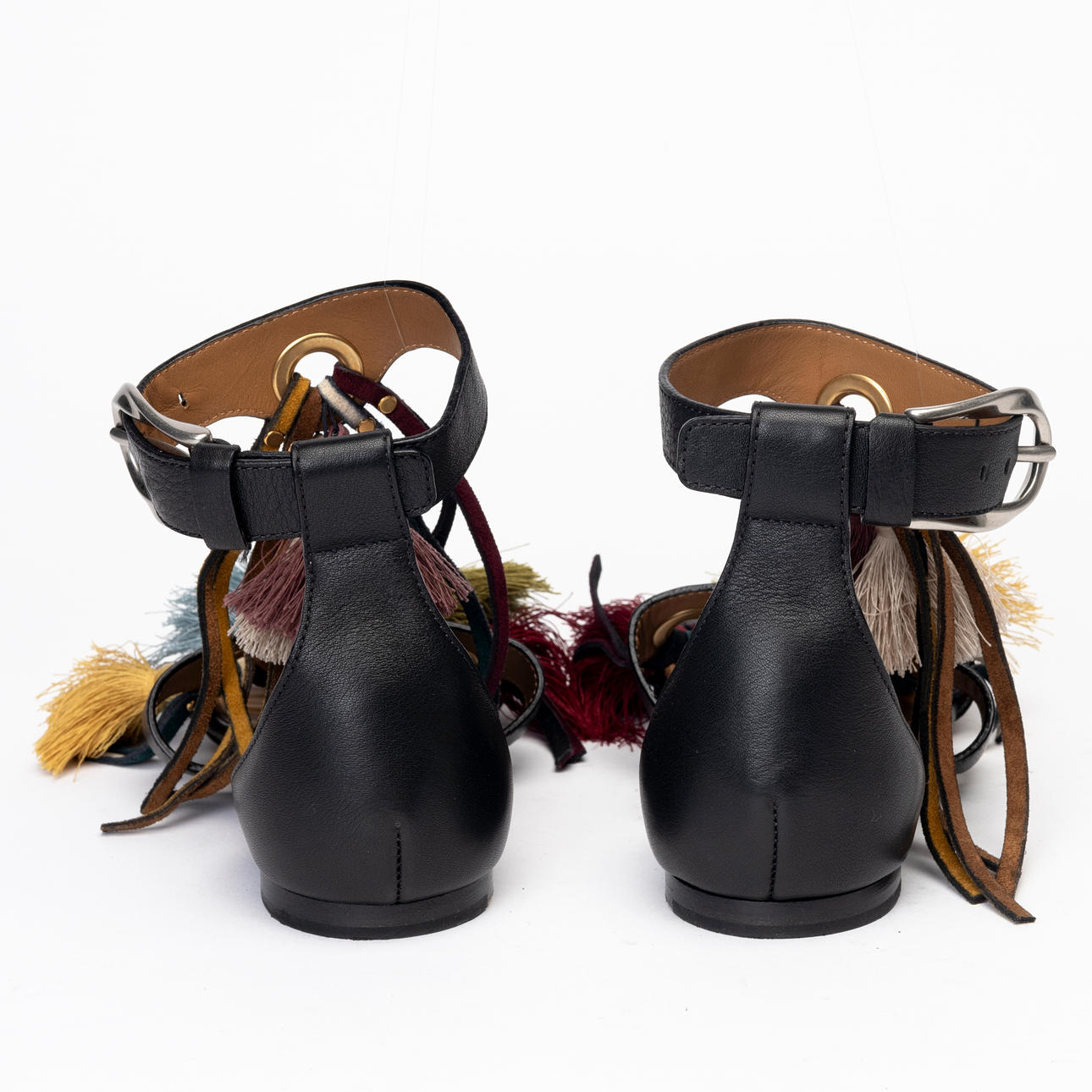 Black leather with decorative multi-colored tassels and leather straps. Wide ankle straps with silver buckles. Leather lined, marked “Chloé”.