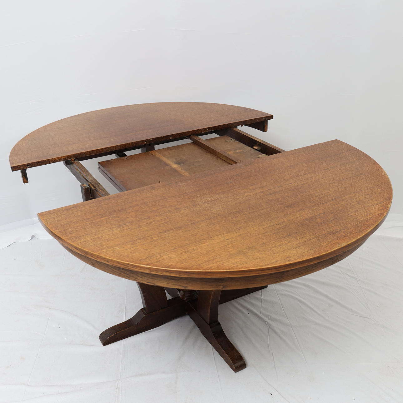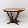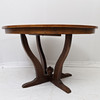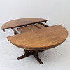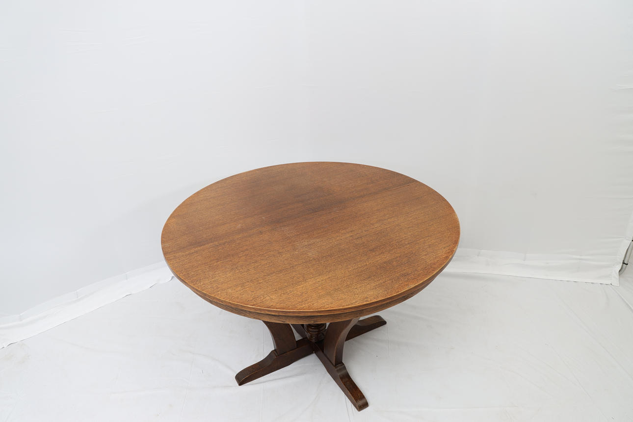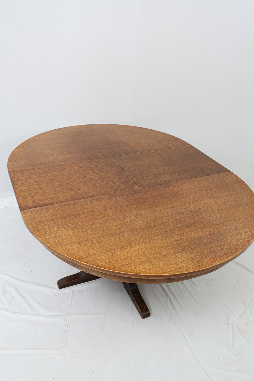 Oak, with two insert boards of 40cm. Four-piece foot. Height 74cm Diameter 121cm.
