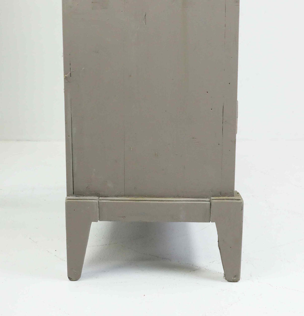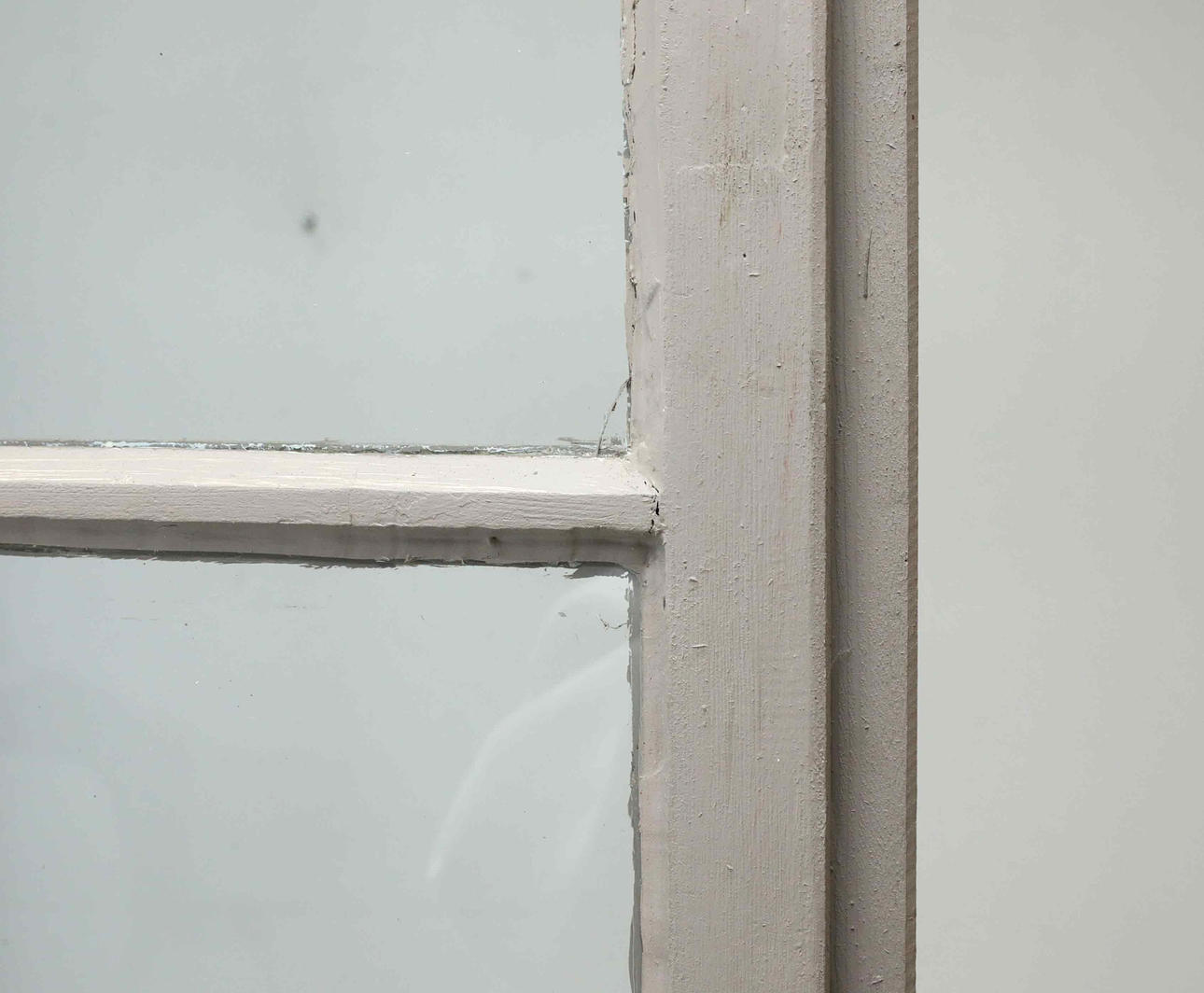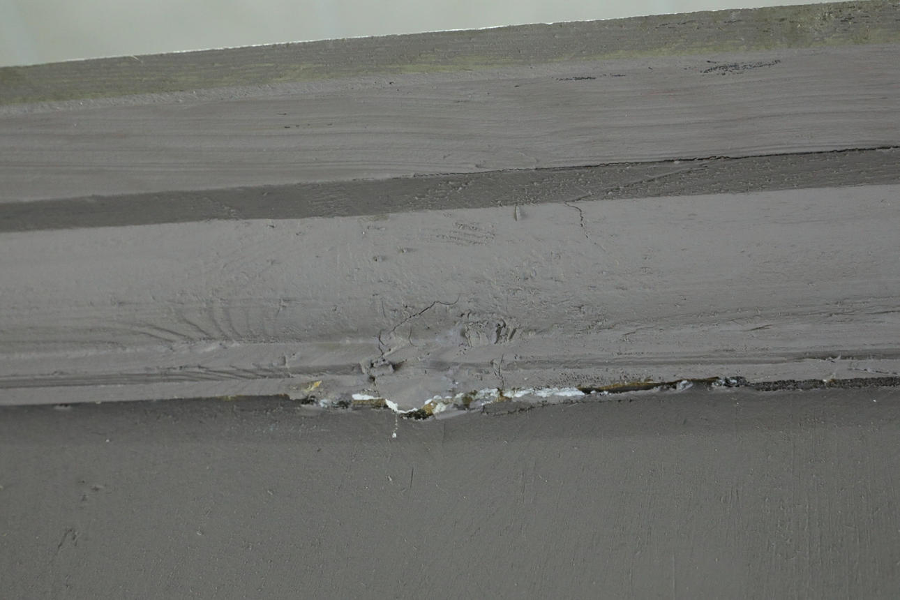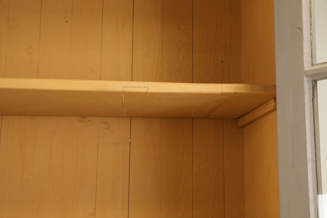 A shelf renovated/glued, there is wear and tear, cracks/holes/chips/scratches/dirt/stains/rust. Crack into a glass.