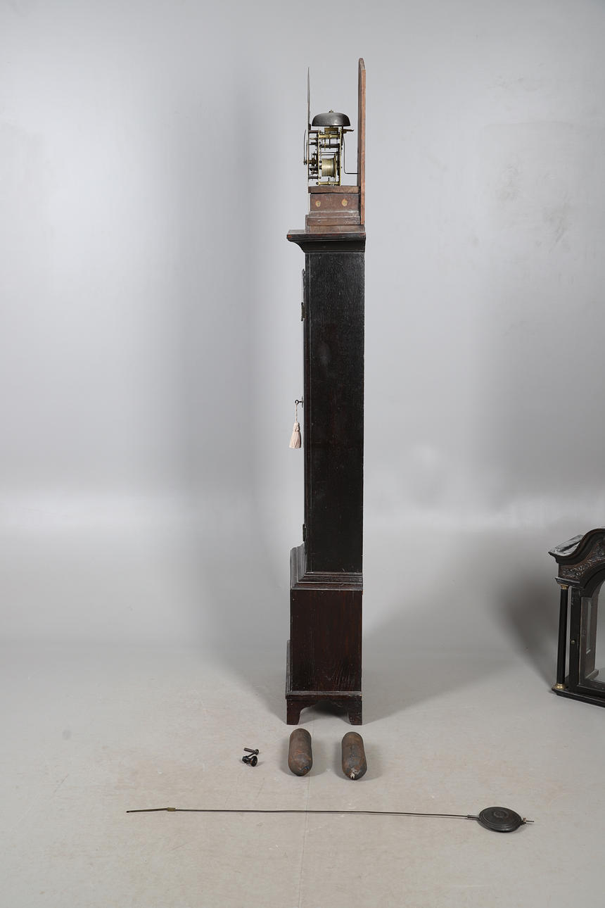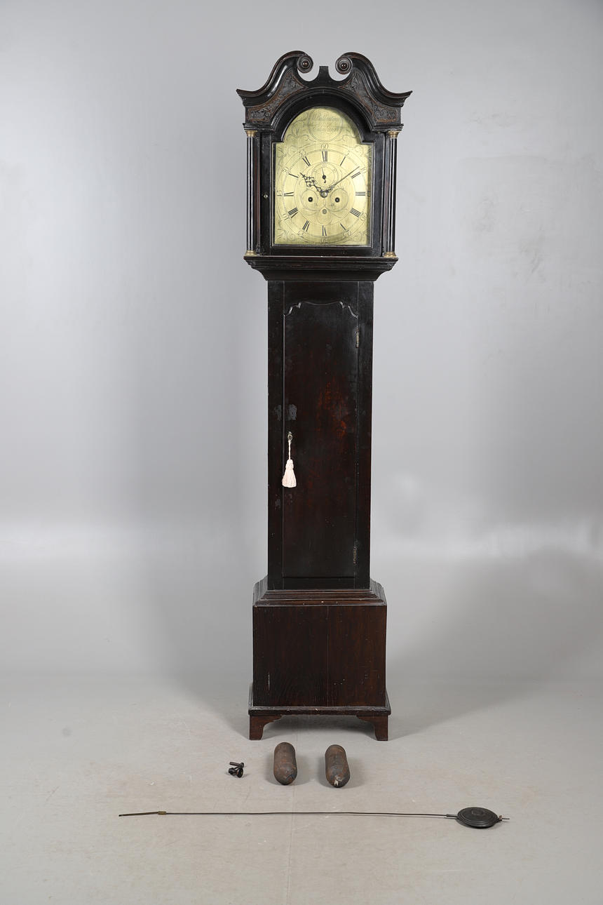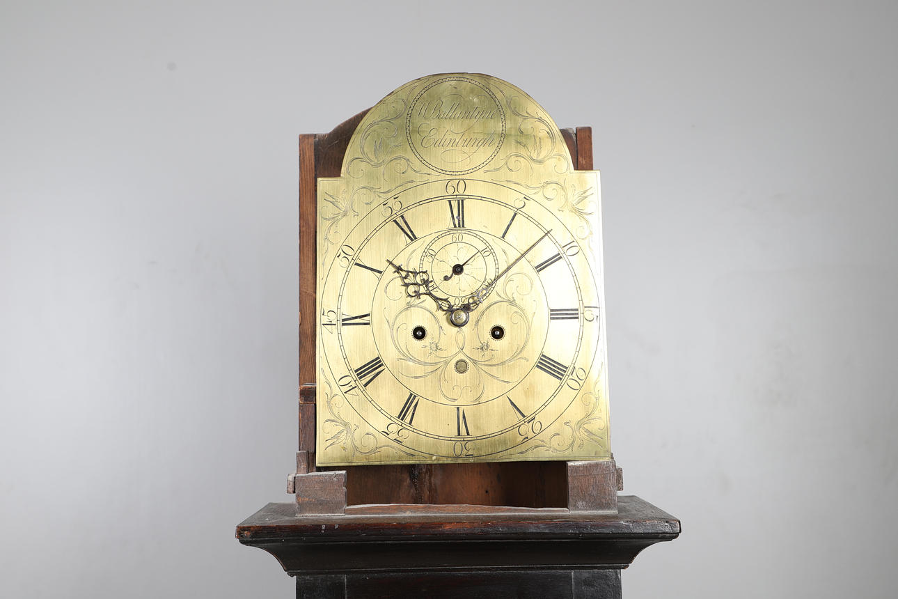 The 12" dial with bird and floral etchings, seconds dial and date aperture, to a two train movement striking hourly to a bell, engraved by W. Ballantyne, Edinburgh, the case hood with two columns, and a trunk door with a case key, pendulum, winder and two weights. Approx. height 211cm.
