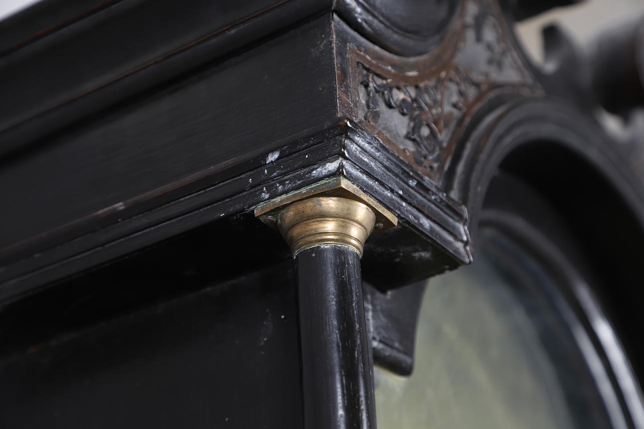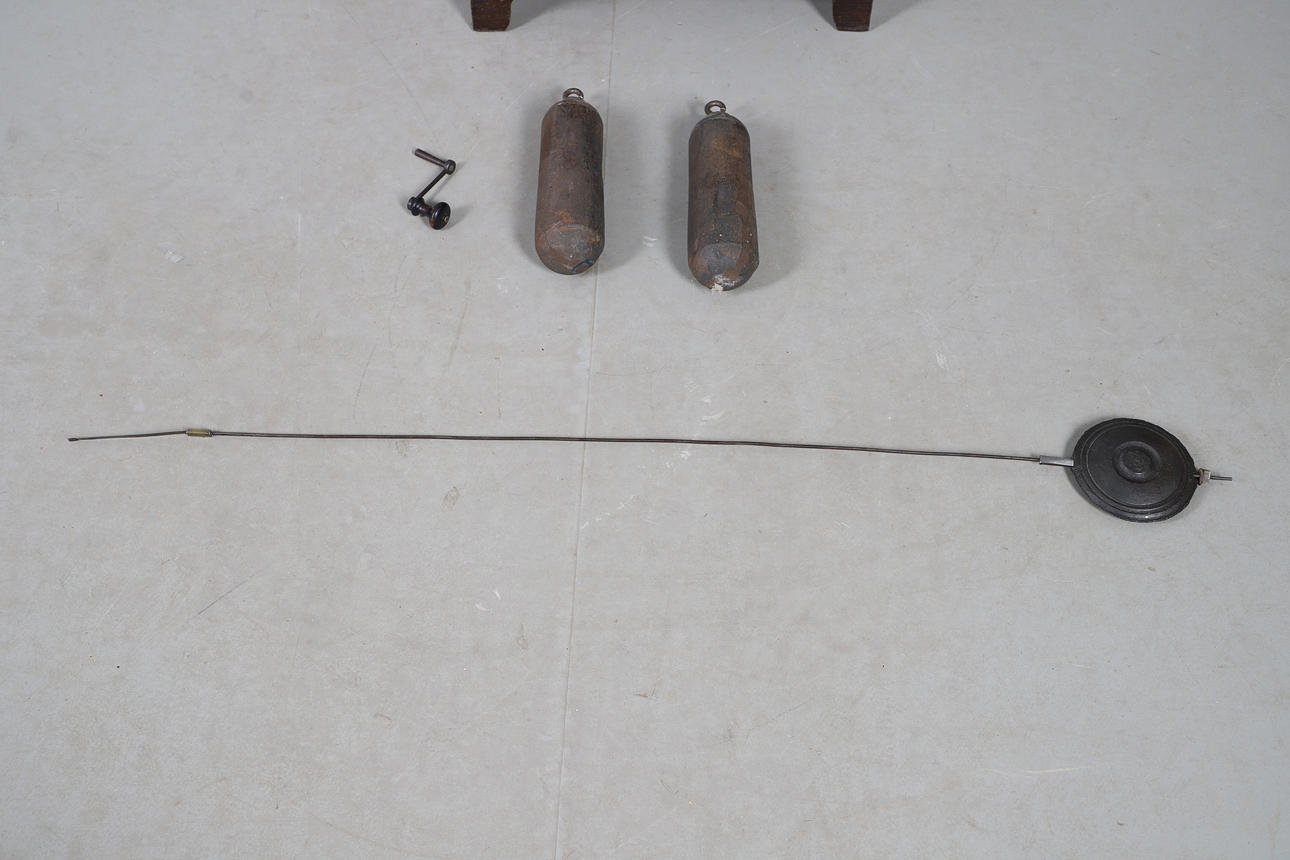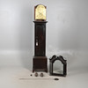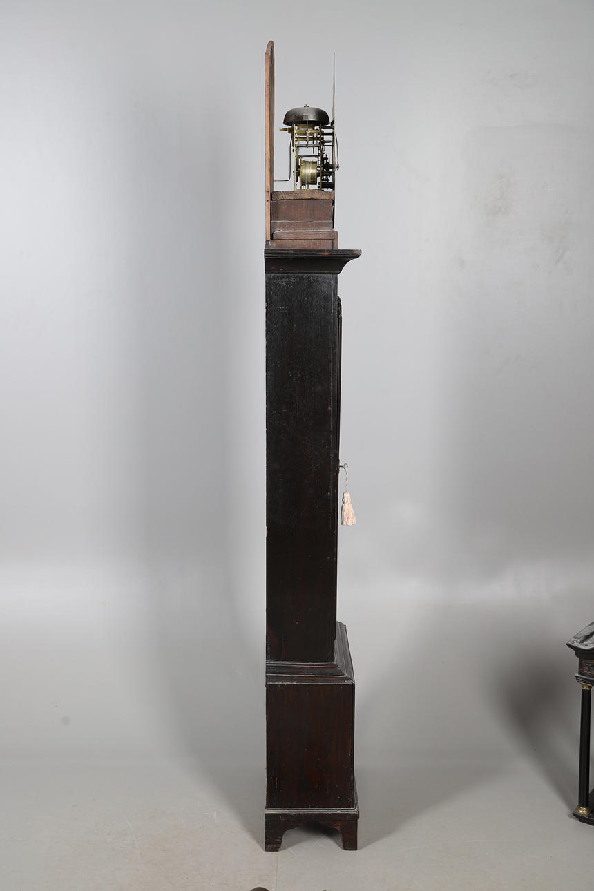 The 12" dial with bird and floral etchings, seconds dial and date aperture, to a two train movement striking hourly to a bell, engraved by W. Ballantyne, Edinburgh, the case hood with two columns, and a trunk door with a case key, pendulum, winder and two weights. Approx. height 211cm.