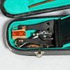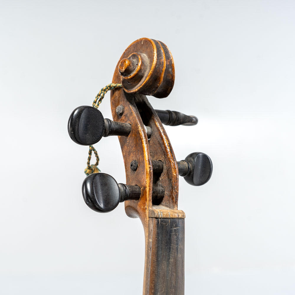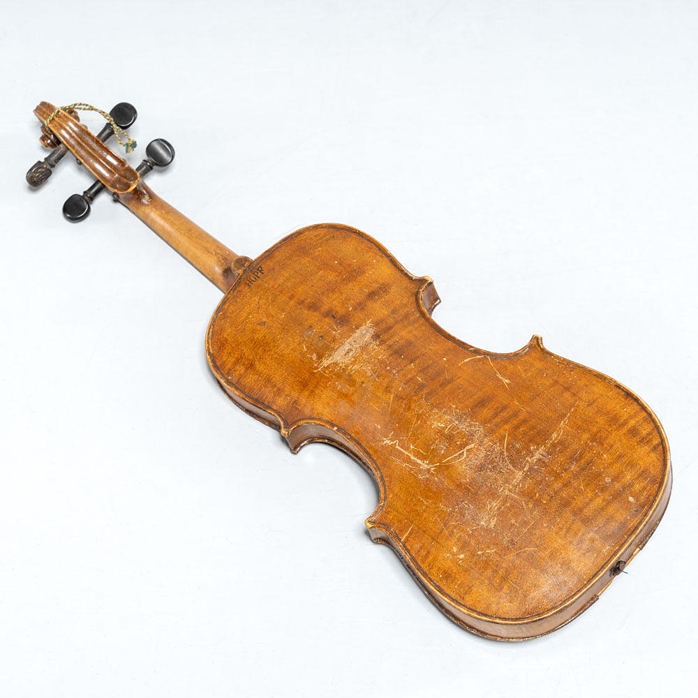 Violin marked “HOPF”. Traditional model with brown lacquered body, blackened fretboard and wood tuning screws. Included is a violin case as well as three string holders and a broken string.