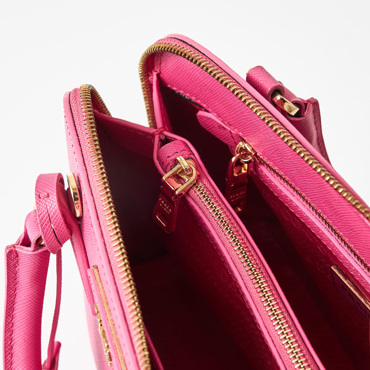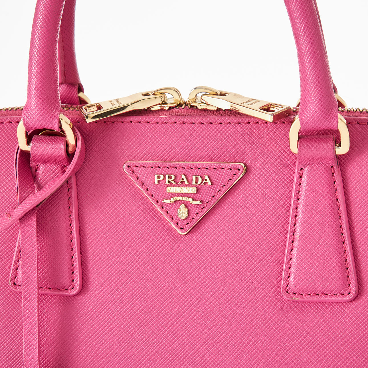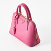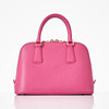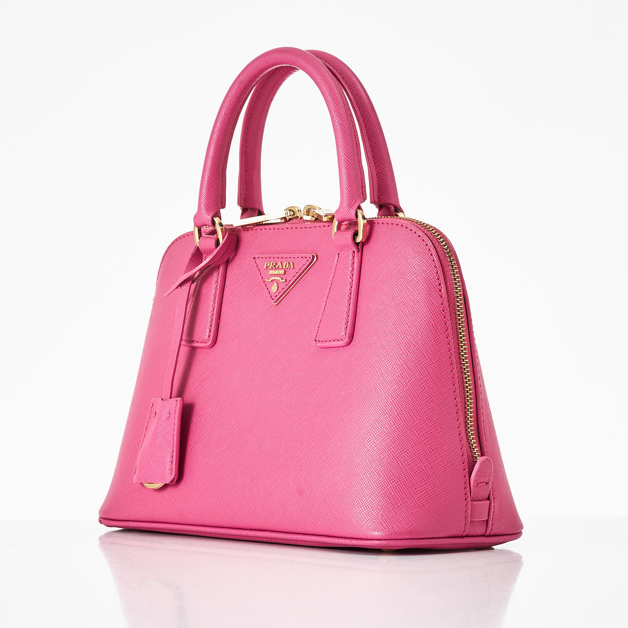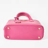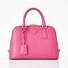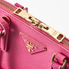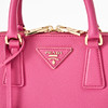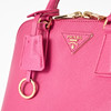 Top handle model in hot pink Saffiano leather, detachable crossbody strap, gold-tone metal hardware, with clochette for key ring at the front, lined in matching logo-patterned textile, interior with two compartments, several small zip pockets, marked "Prada Milano", dimensions approx. 26 x 19 x 11 cm.
