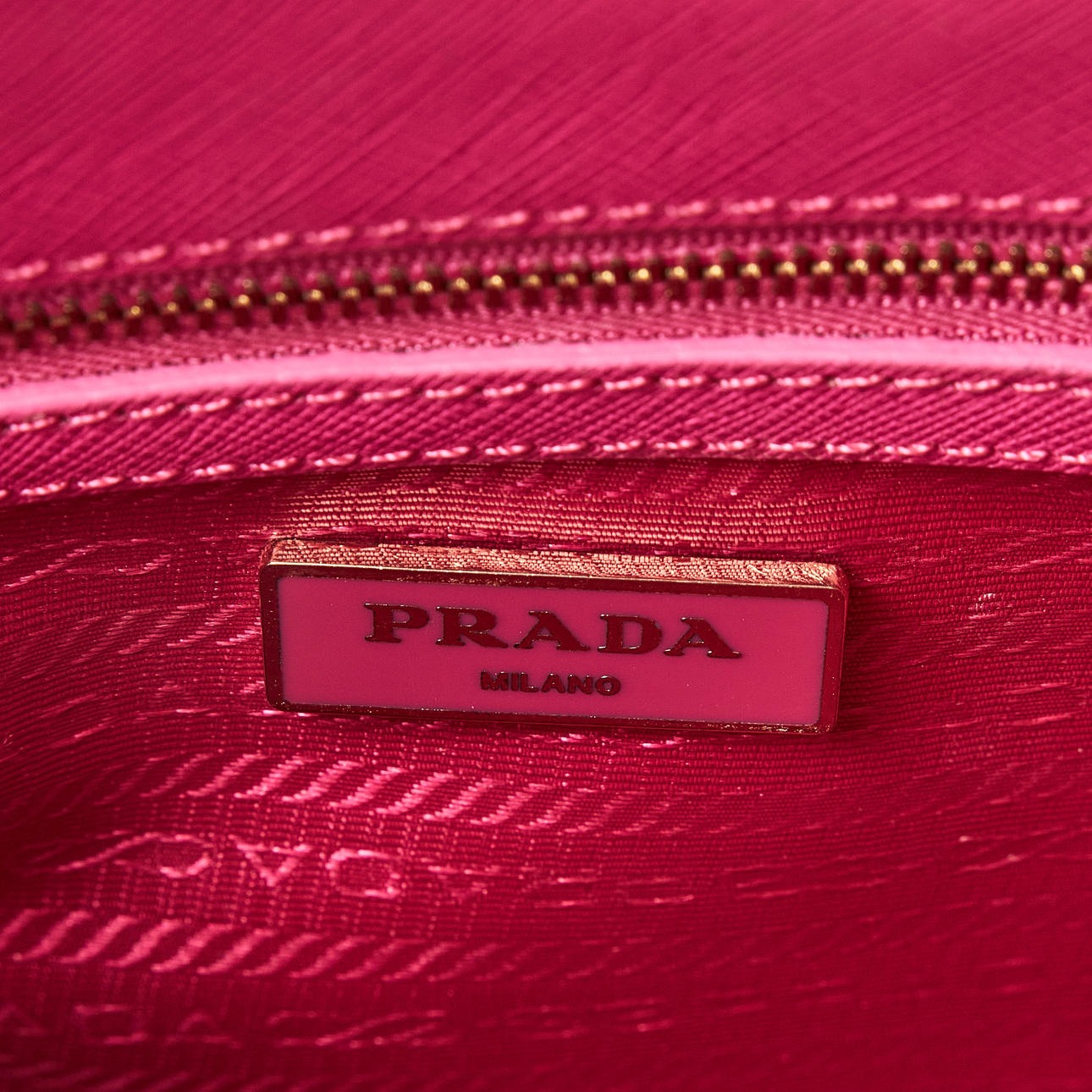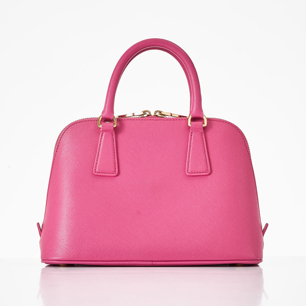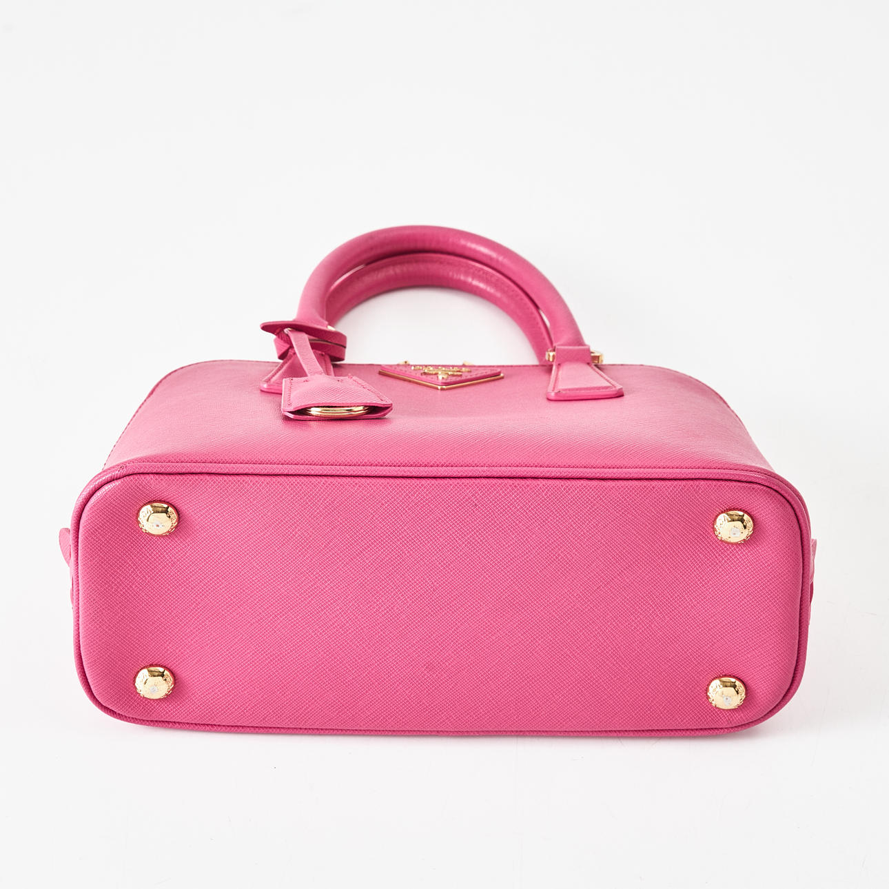 Top handle model in hot pink Saffiano leather, detachable crossbody strap, gold-tone metal hardware, with clochette for key ring at the front, lined in matching logo-patterned textile, interior with two compartments, several small zip pockets, marked "Prada Milano", dimensions approx. 26 x 19 x 11 cm.