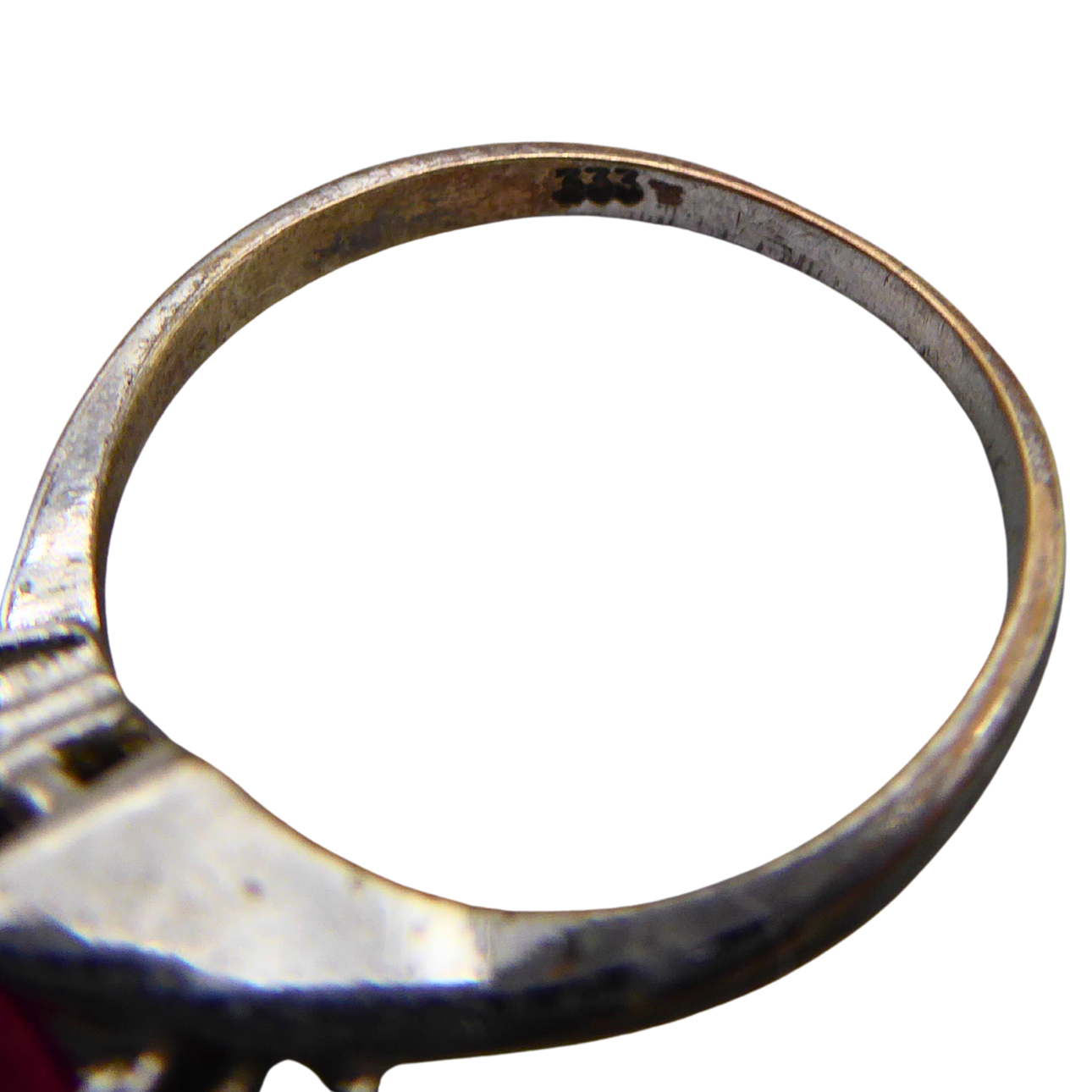 333 WHITE GOLD RING WITH A NATURAL RUBY IN CAP SETTING.