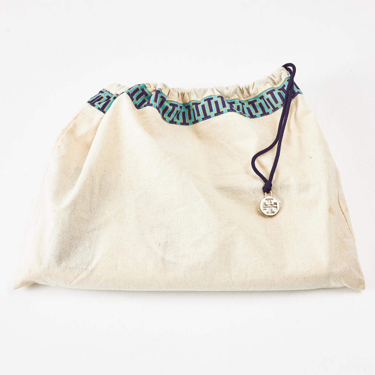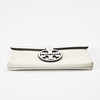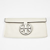 White leather, branding in carved wood on the front, magnetic closure, lined in white textile, one interior zip pocket, dimensions approx. 28 x 14 x 3 cm