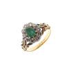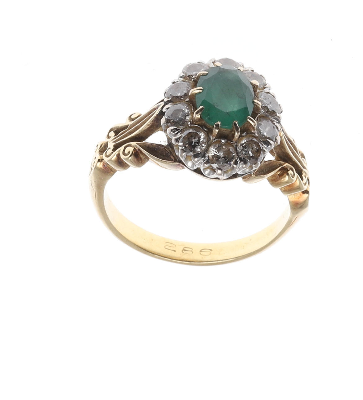 set with an oval emerald bordered by brilliant cut diamonds, no marks, tests as 18ct gold size O, 6.6g.