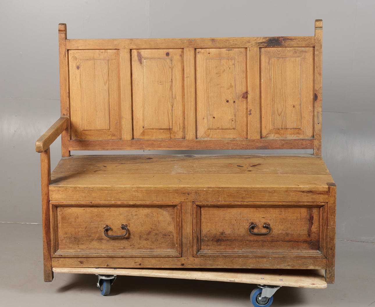Having four panels on the back, above two drawers to the base section, 126cm wide 109cm high, seat height 44cm.