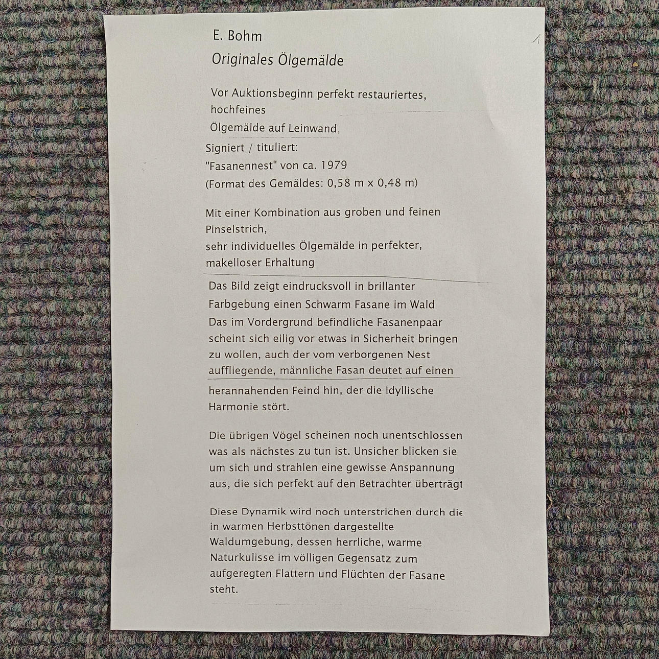 5012645. BOHM, E. Pheasant nest, ca. 1979, oil on canvas.