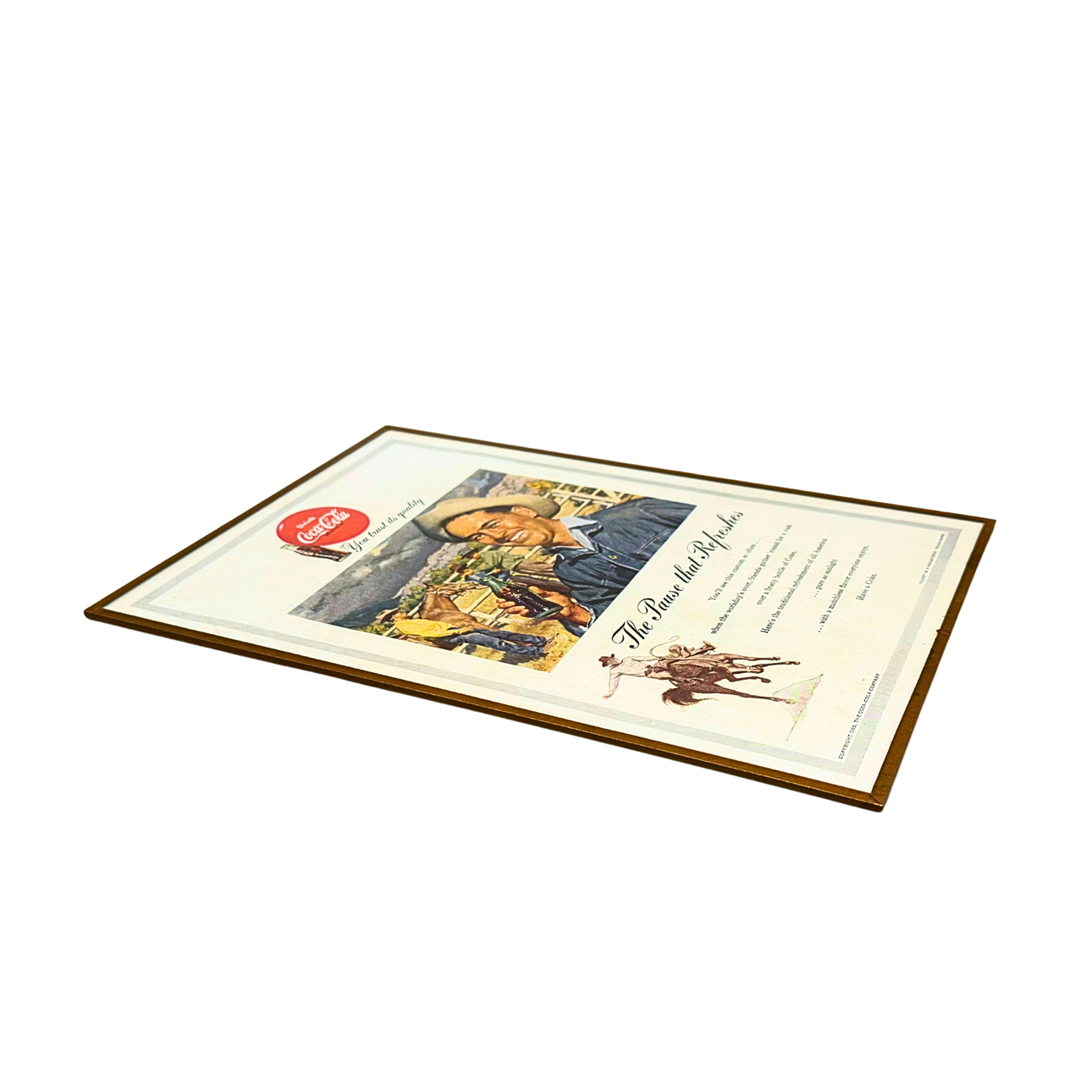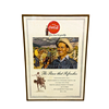 A Coca-Cola advertising sign from 1953, framed. The advertising sign shows a scene from a horse farm.