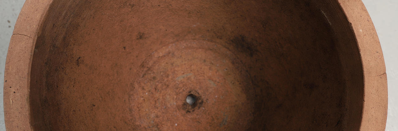 Weather and utility wear. Surface dirt. Two smaller cracks on the edge of the dark blue pot.