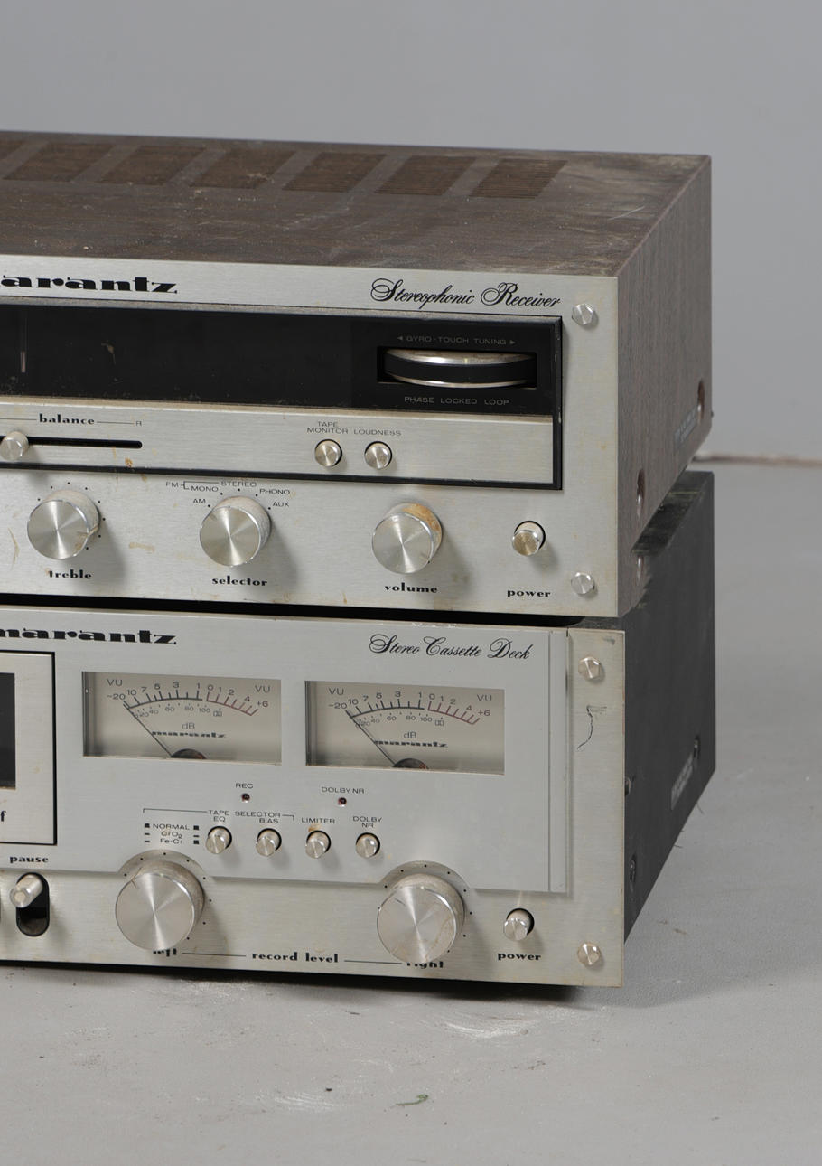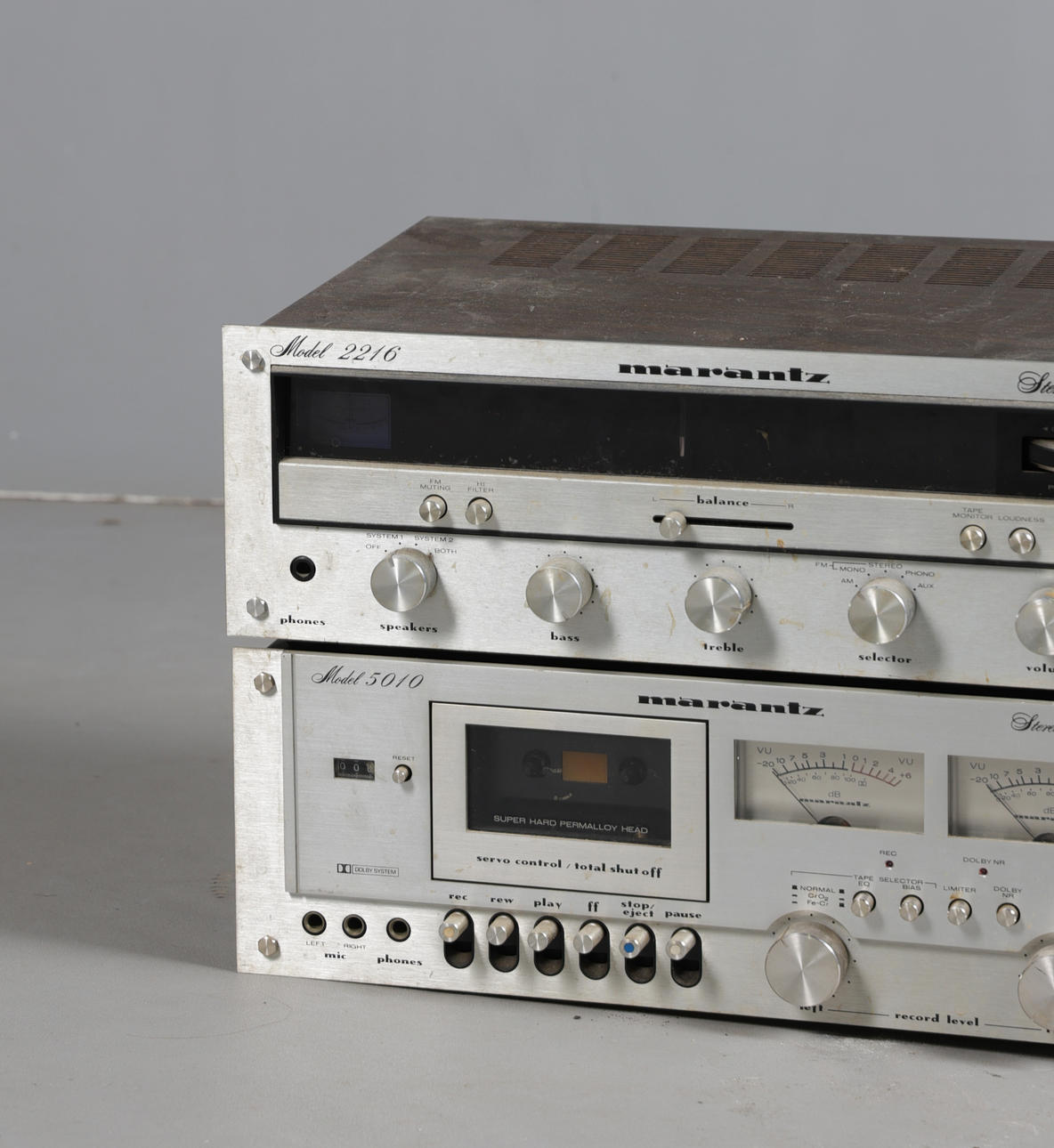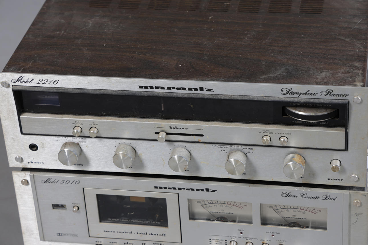 The Marantz Model 2216 Stereophonic Receiver, serial number E020756, together with a Marantz Model 5010 Stereo Cassette Deck, serial number 1010128, larger unit measuring 43cm x 30cm x 14.5cm. (2).