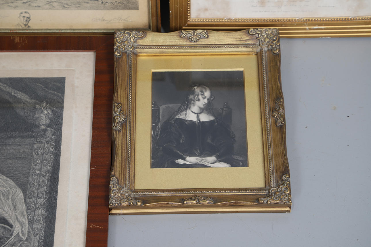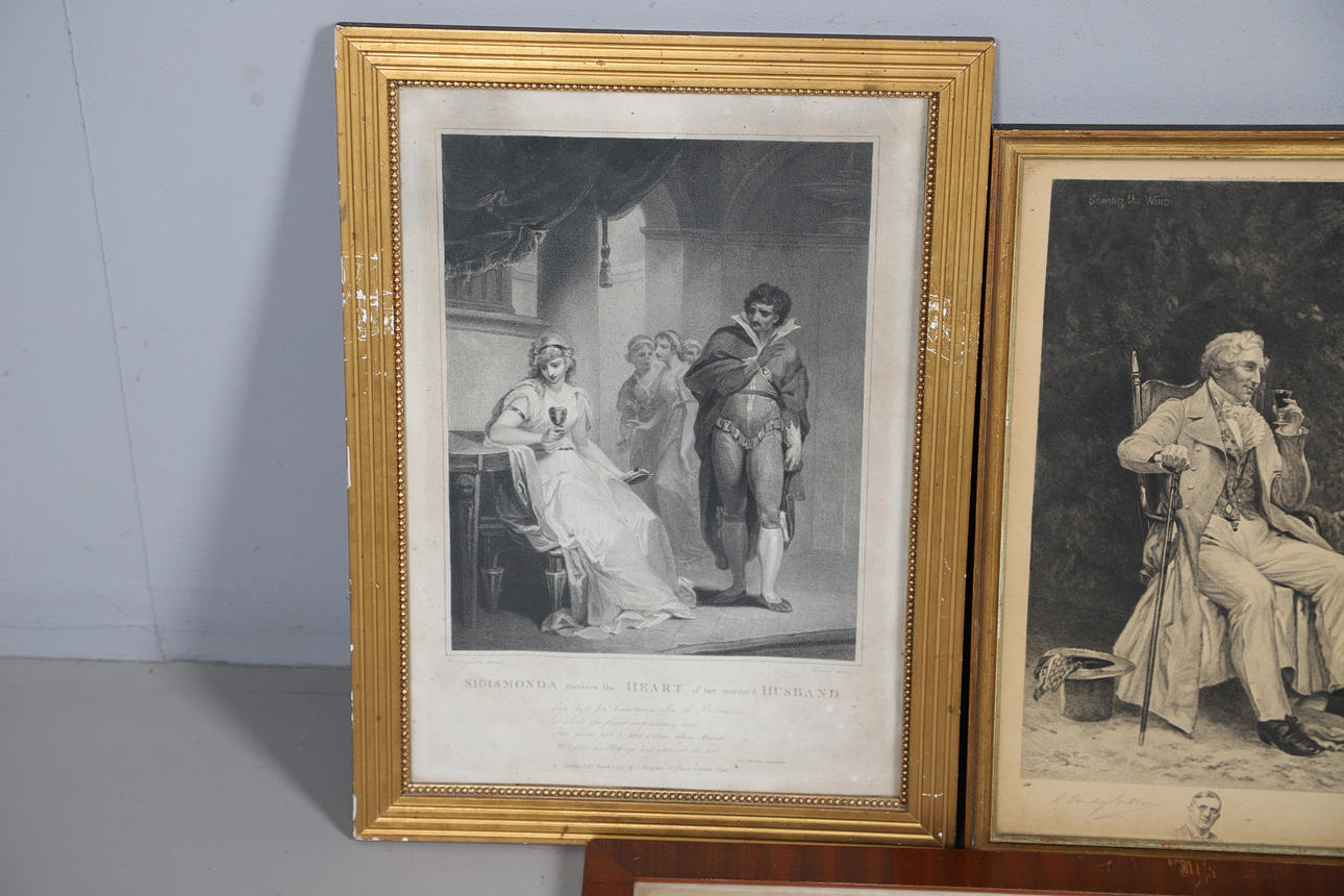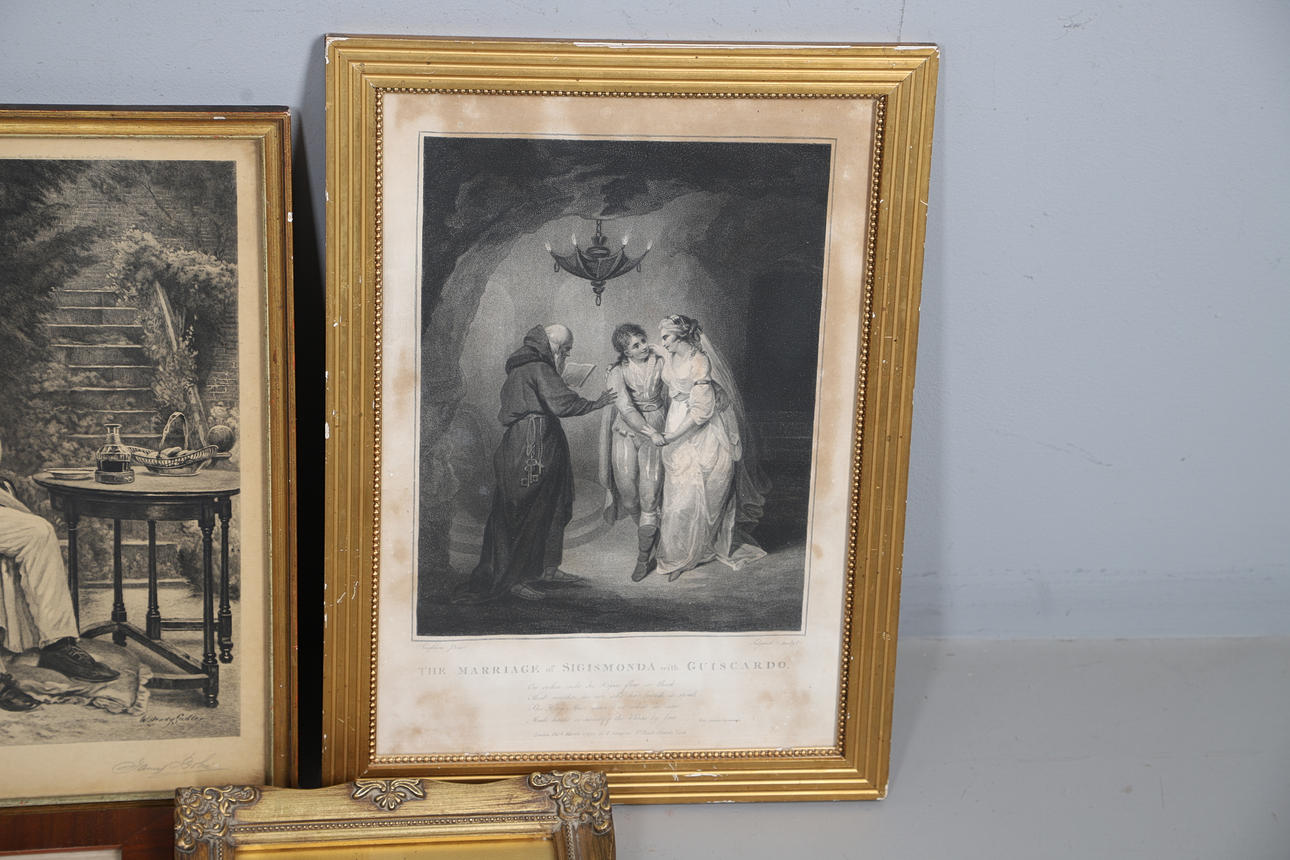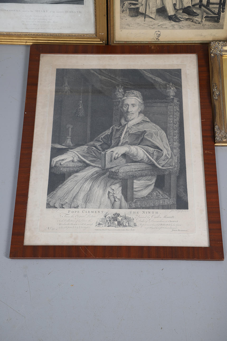 to include a portrait engraving of Pope Clement the Ninth by John Hall after Carlo Maratti, The Marriage of Sigismonda with Guiscardo and Sigismonda receives the Heart of her murder'd Husband published by T. Simpson, Sowing the Wind by Walter Dendy Sadler, and one other similar, each framed and glazed, the largest 50cm x 64cm overall (5).