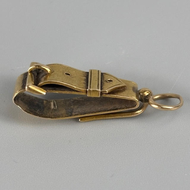 Antique yellow metal belt and buckle, possible scarf or napkin clip, approximately 3.7g.