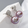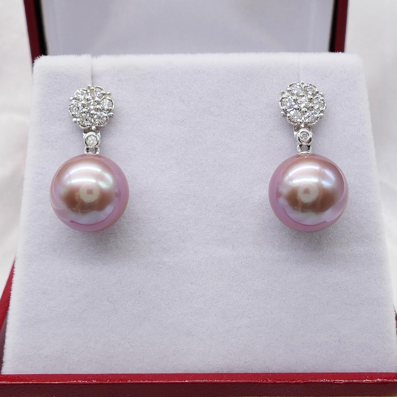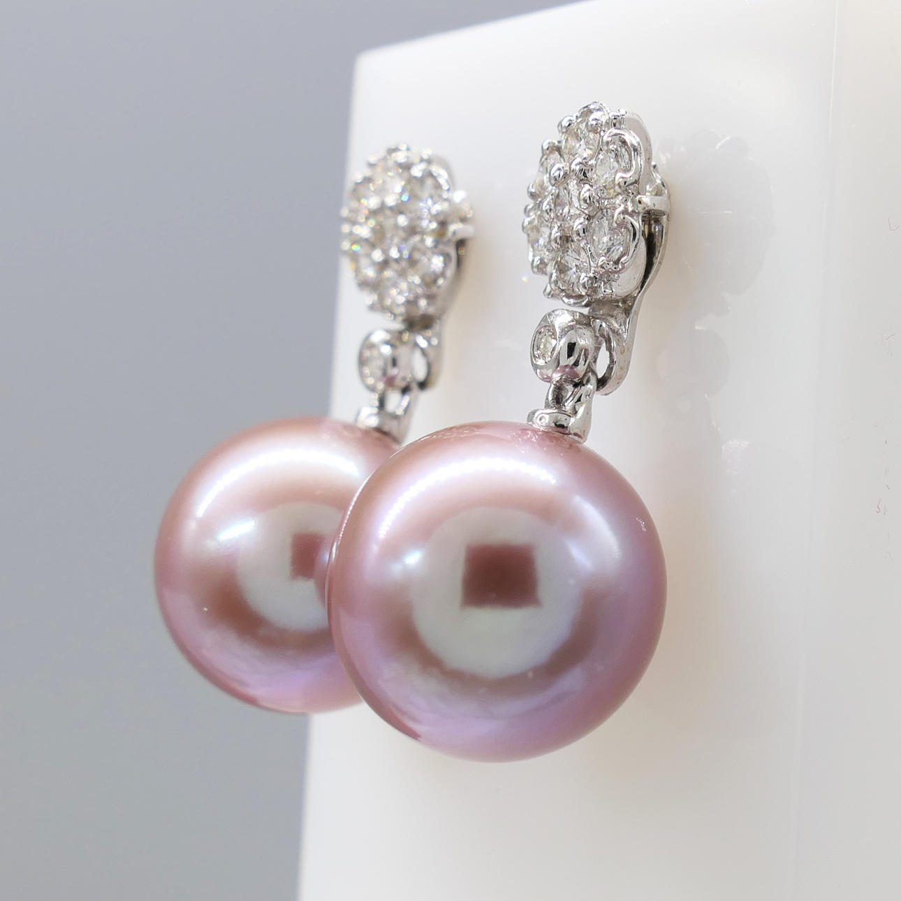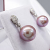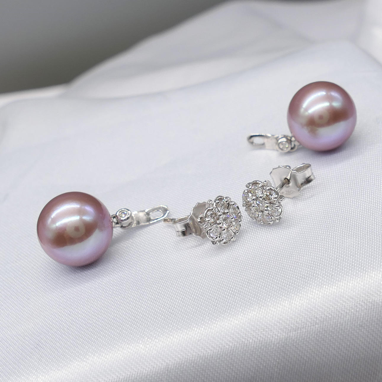 A pair of pinkish grey cultured Tahitian pearl earrings with detachable diamond daisy bales, in 18k white gold