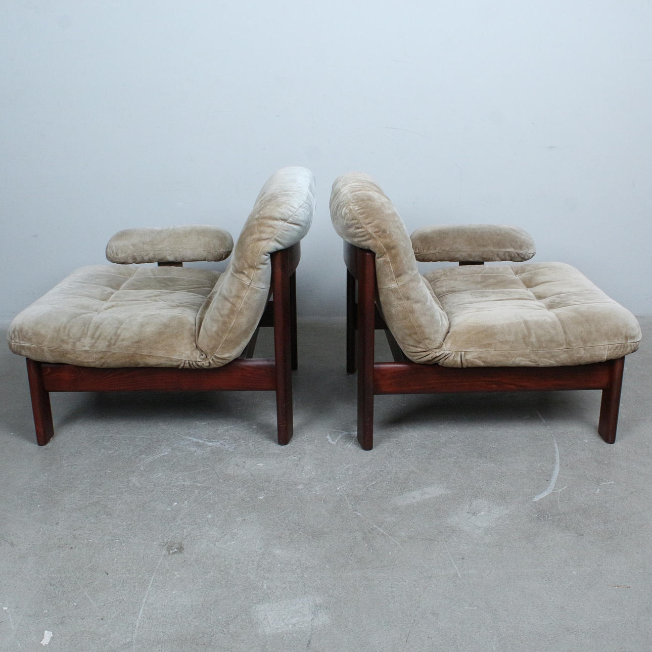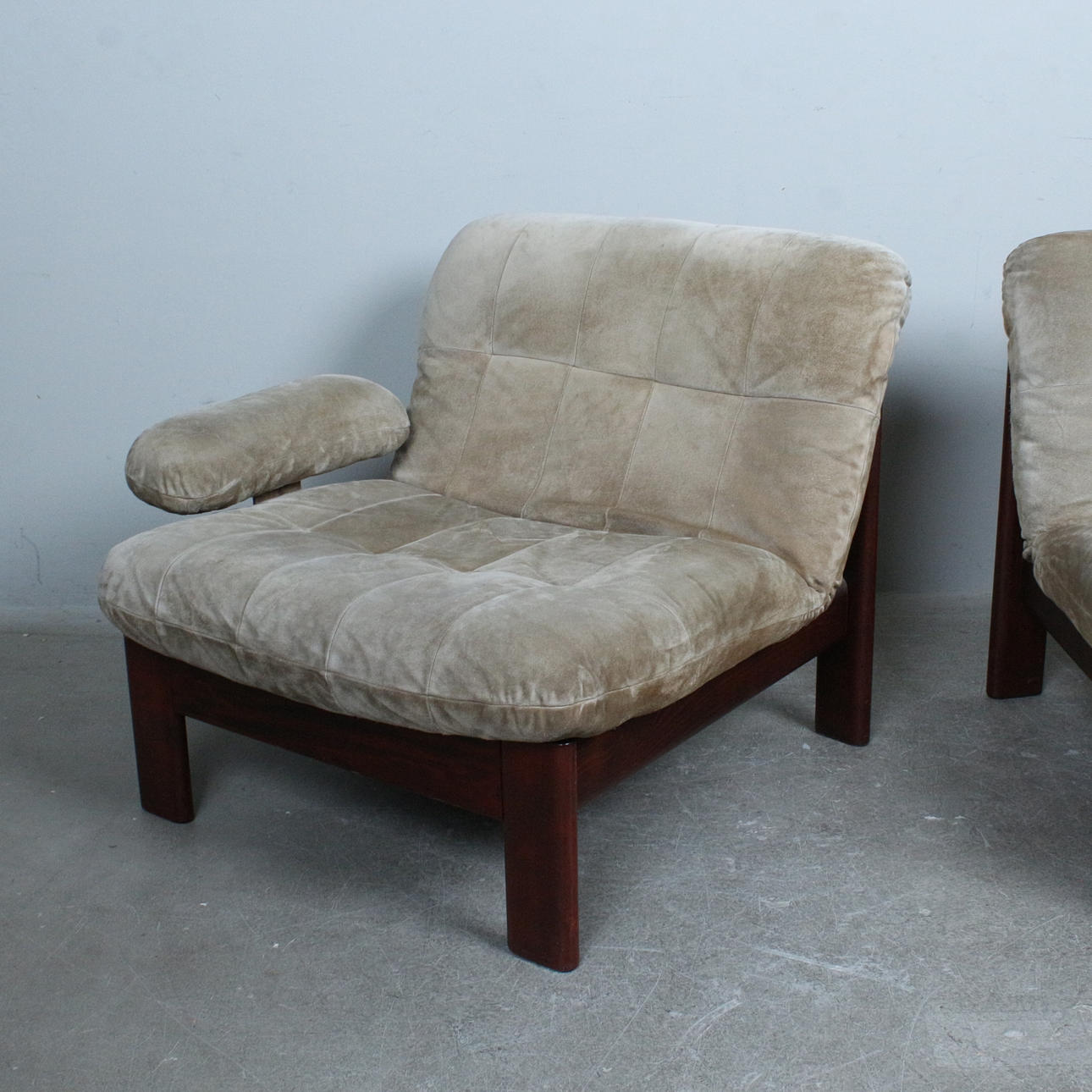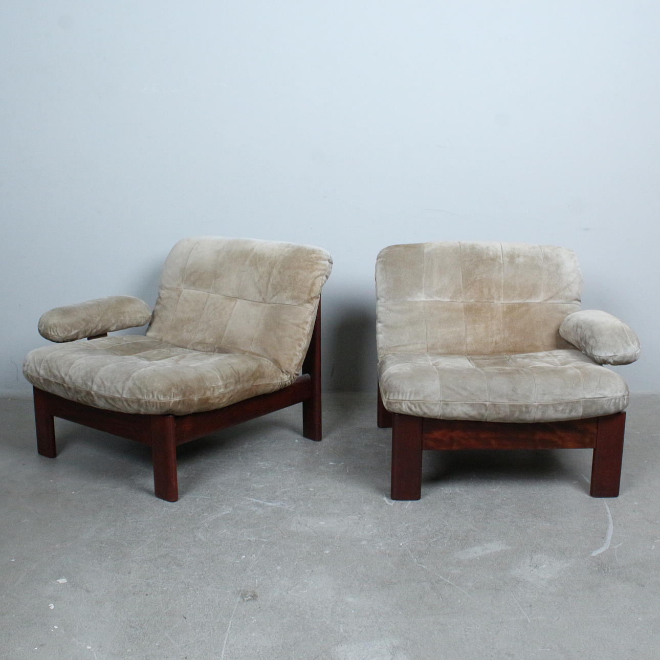 A pair of armchairs with a dark glazed wood frame with loose seat and back cushions covered with suede.