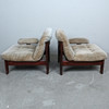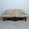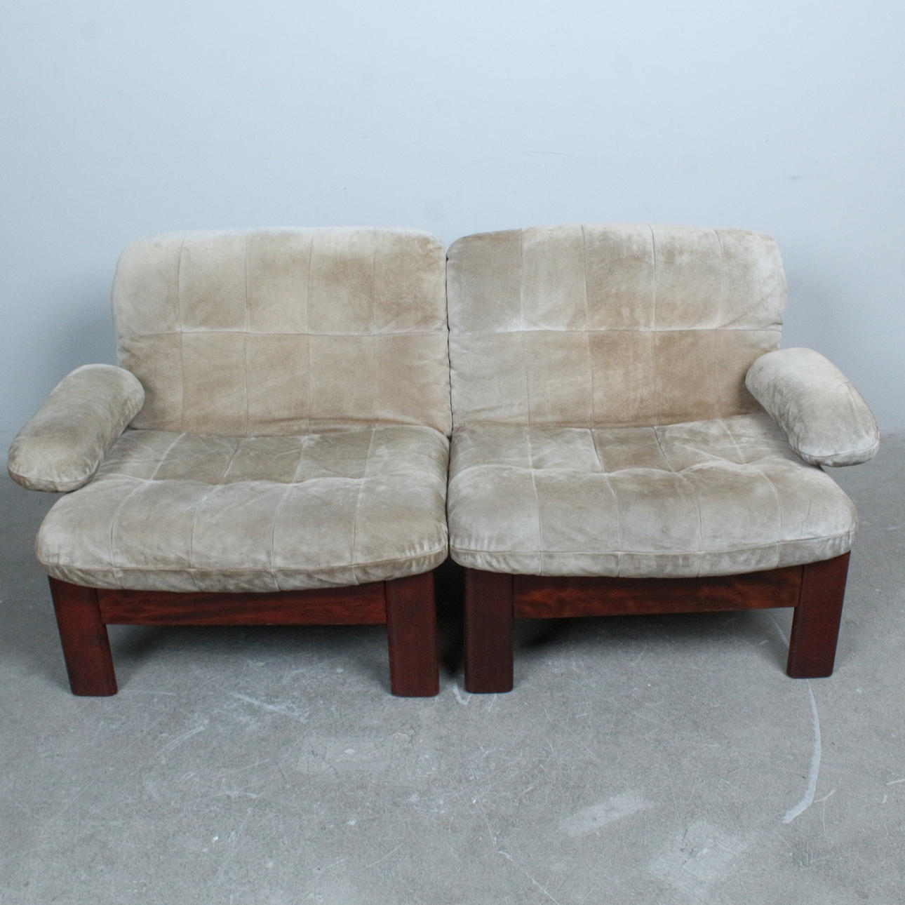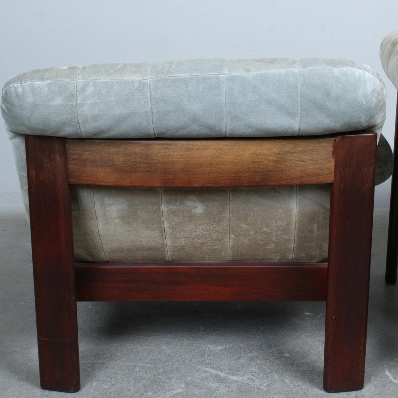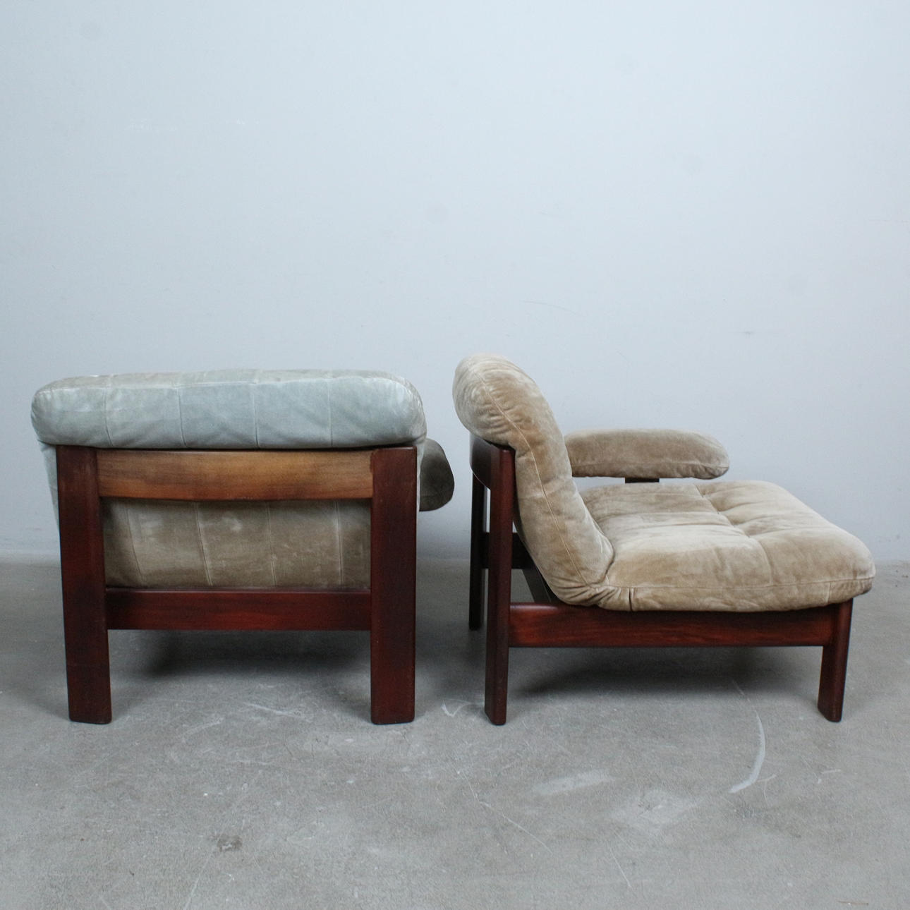 A pair of armchairs with a dark glazed wood frame with loose seat and back cushions covered with suede.