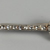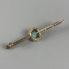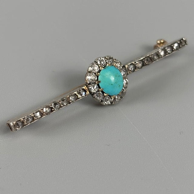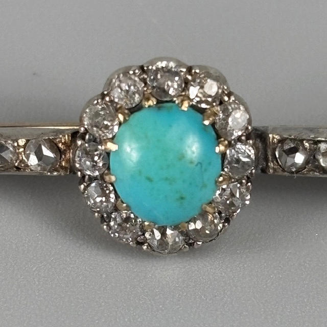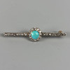 White metal bar brooch set with diamonds to its length, with central cluster of a single turquoise surrounded by diamonds, approximately 45mm, 3.2g total.