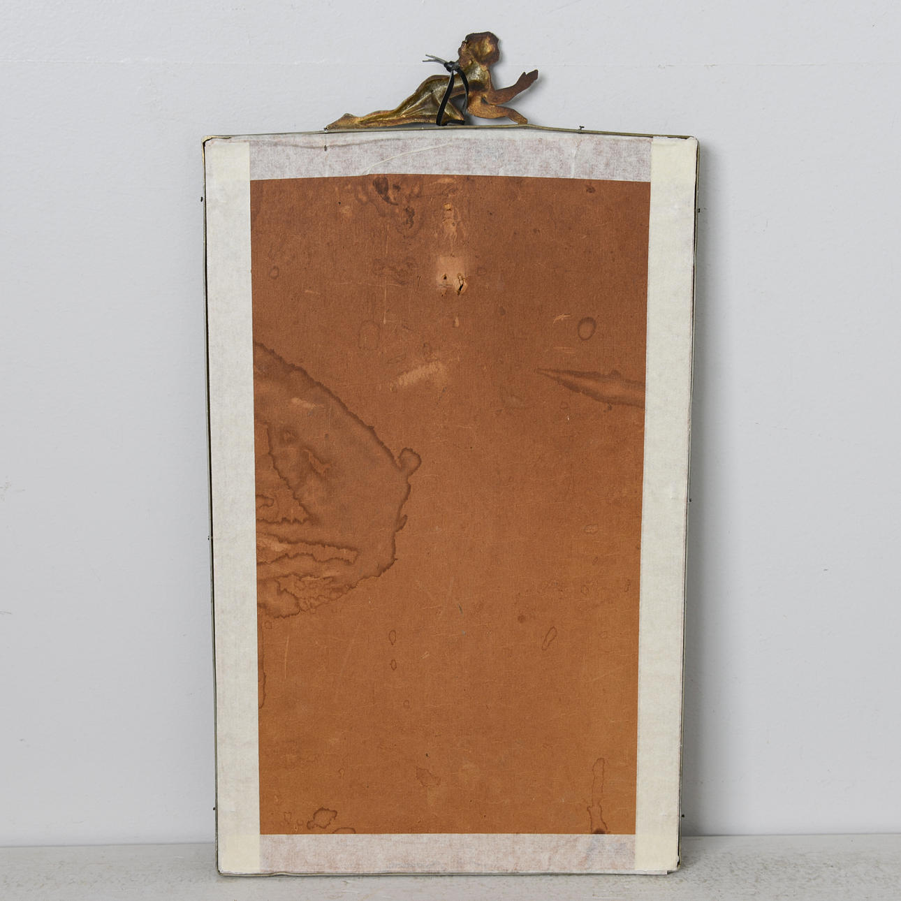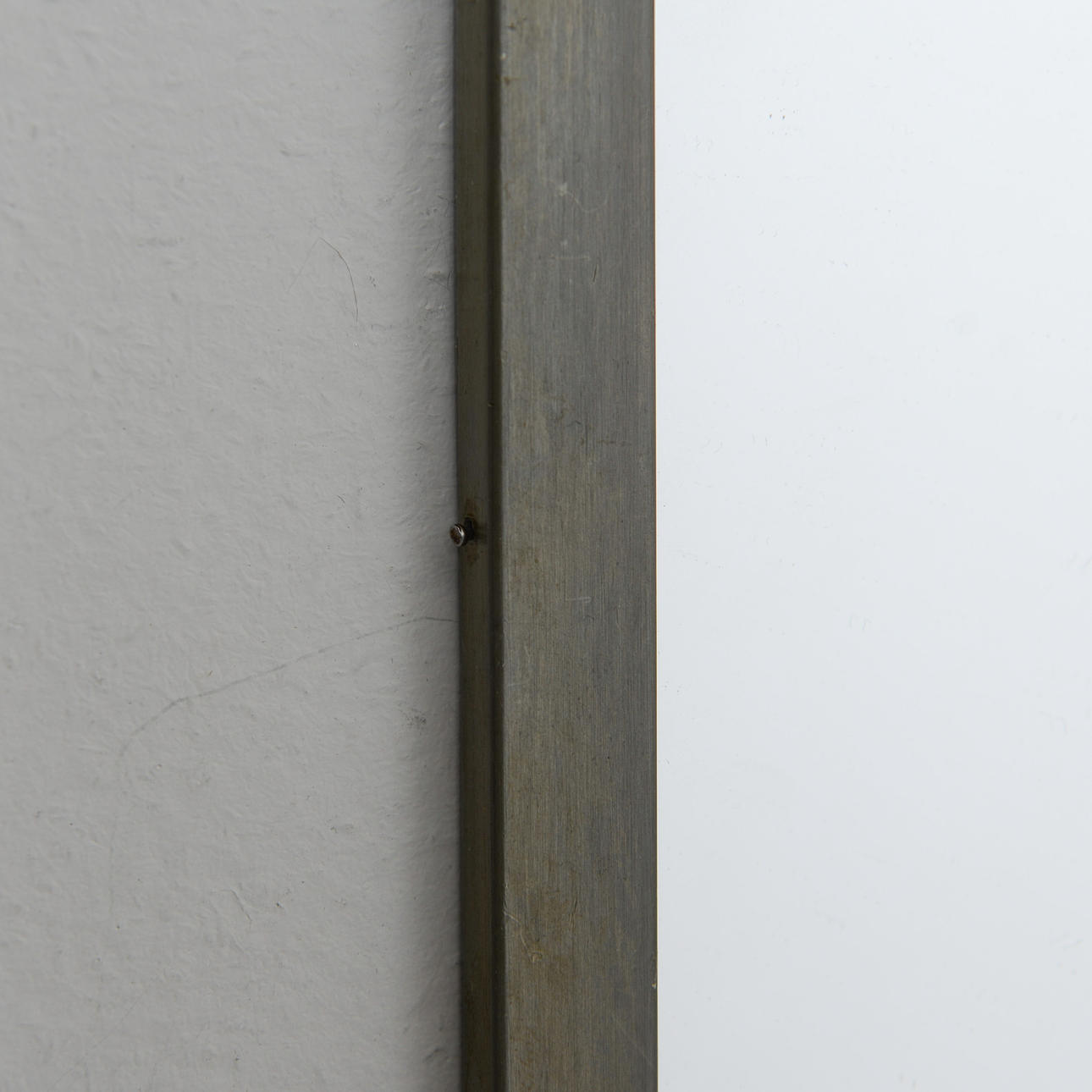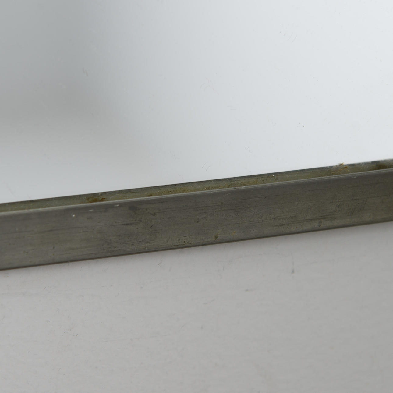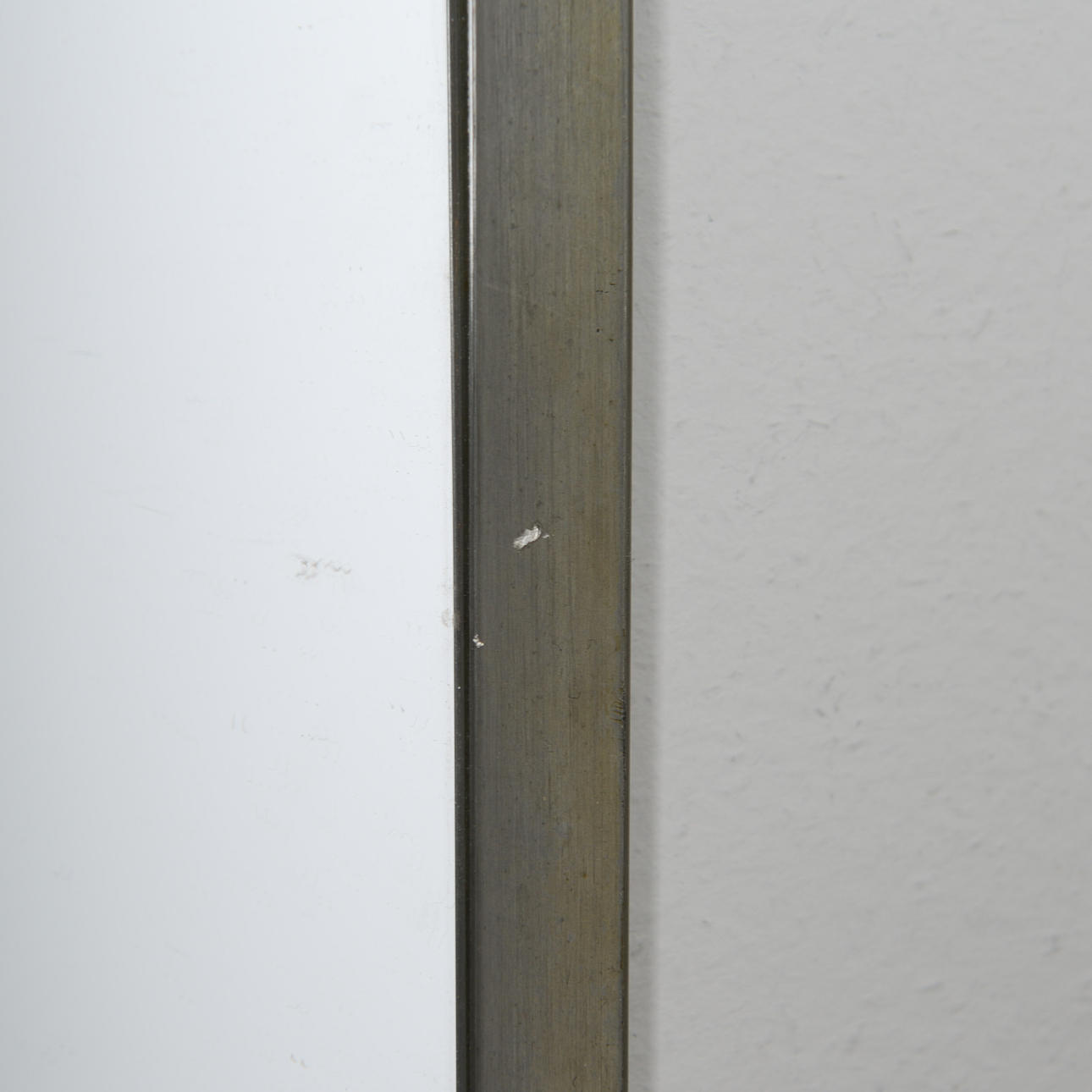 A dent along the upper edge of the frame. Mirror slightly loose in the frame.