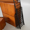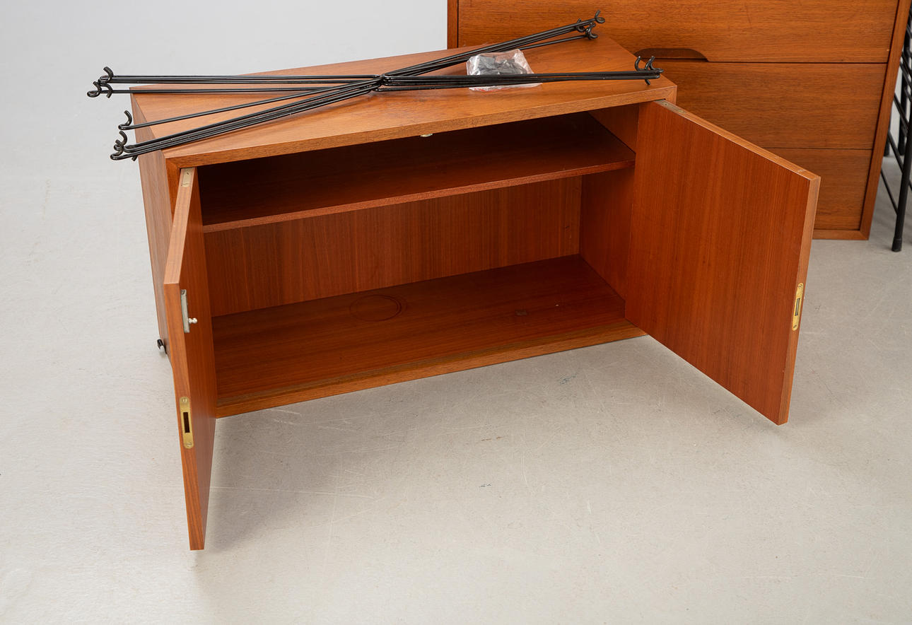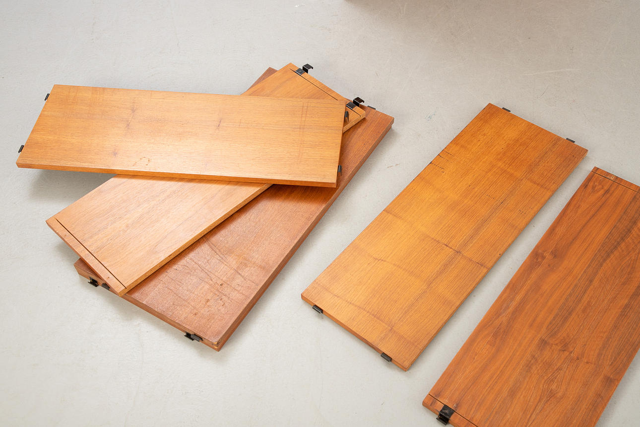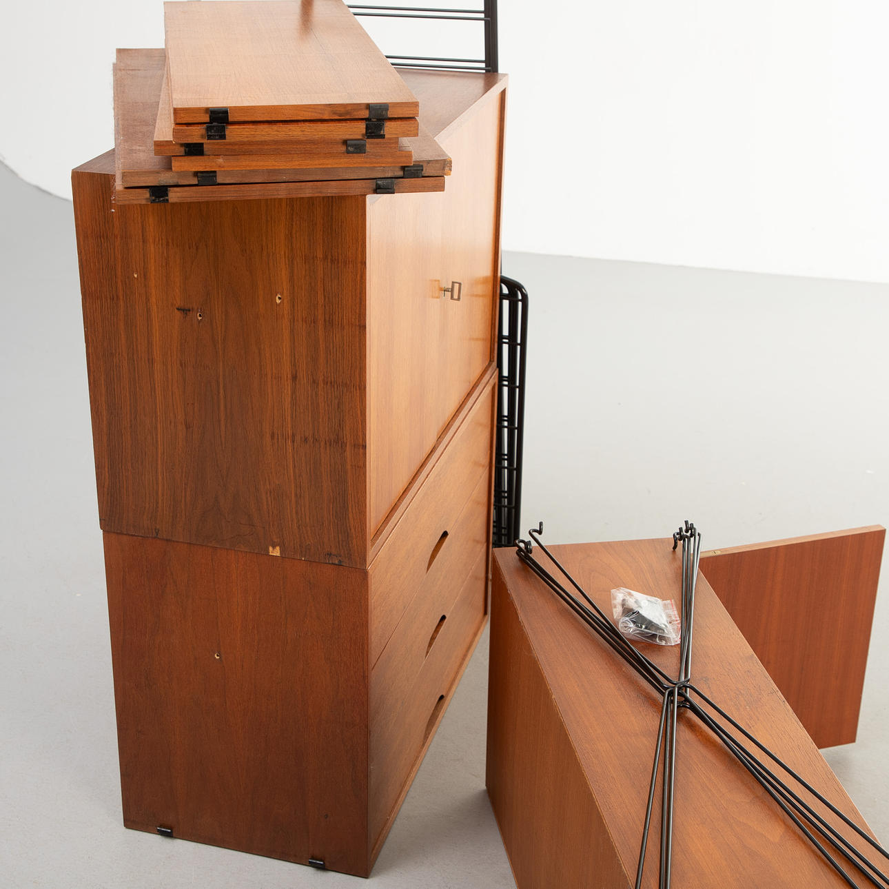 Teak veneer/metal Can be dismantled Modular shelving system consisting of black-painted metal ladders, 3 cabinets (approx. 48x71x36/40x71x26 cm, as well as 6 shelves in two sizes: 71x26 and 71x36 cm.