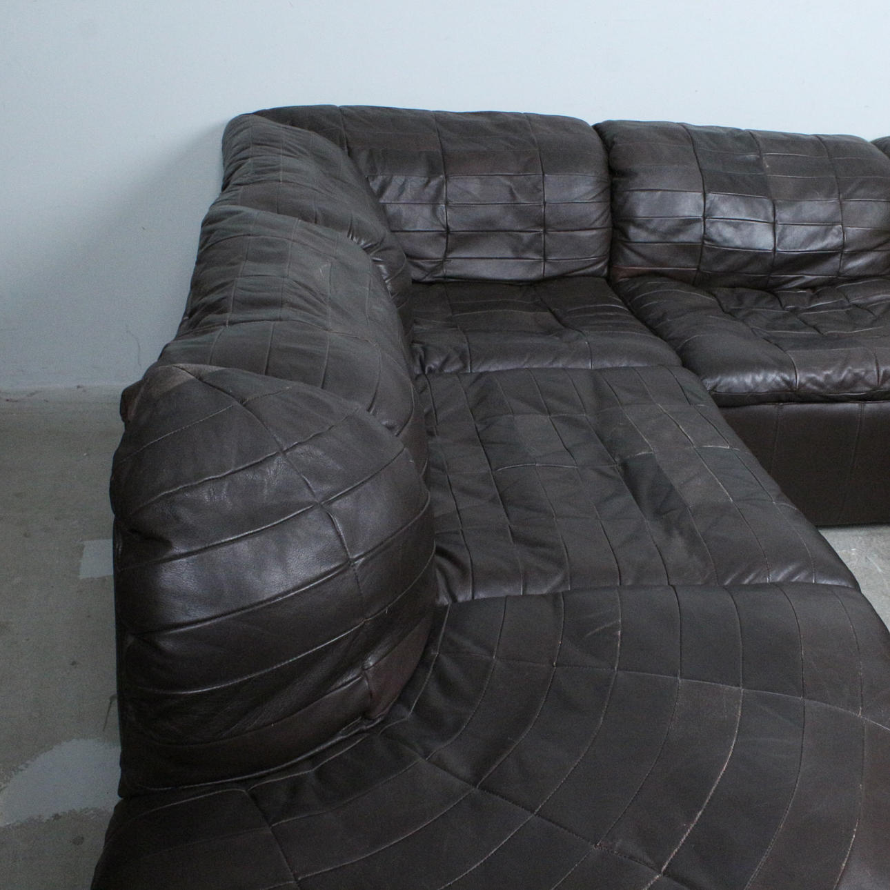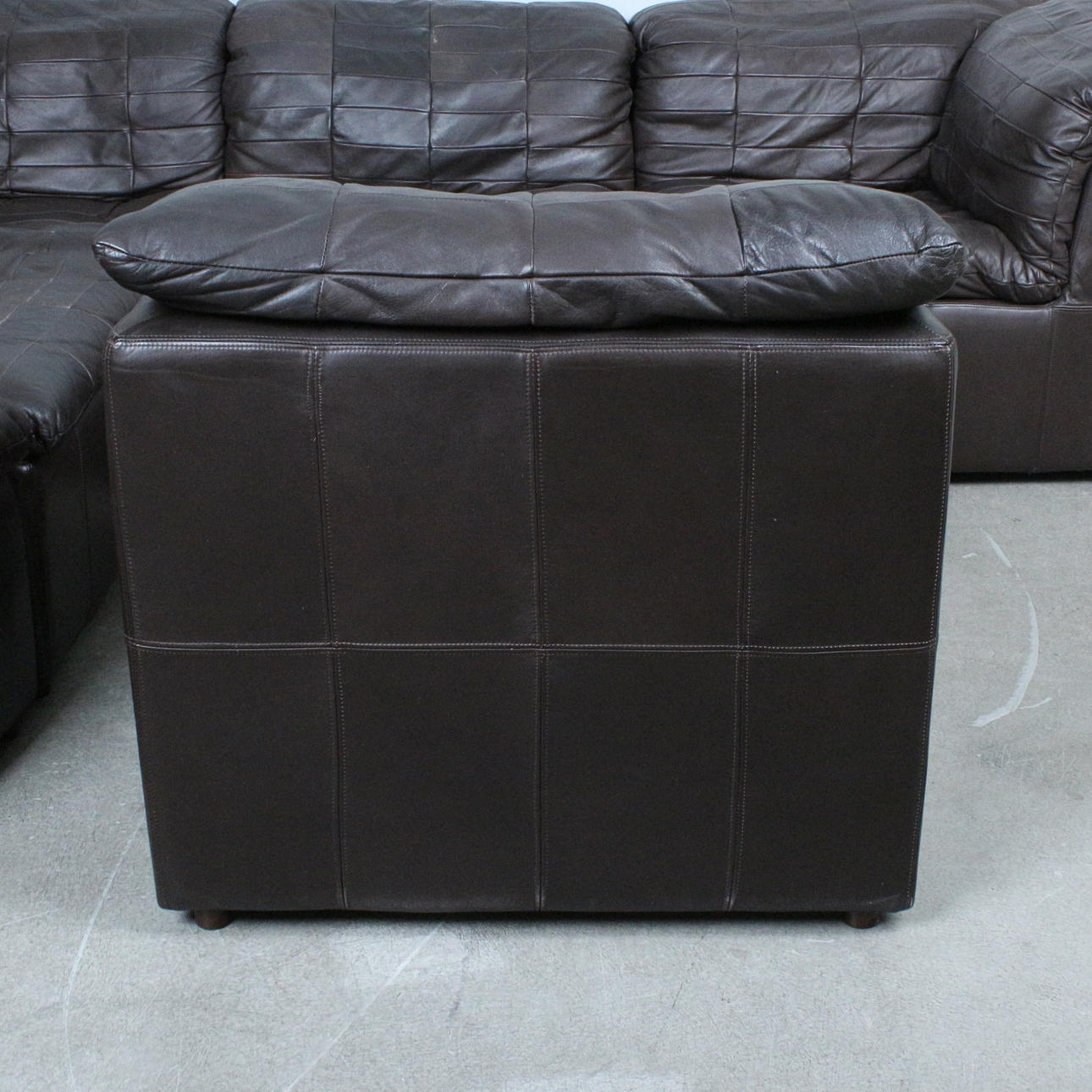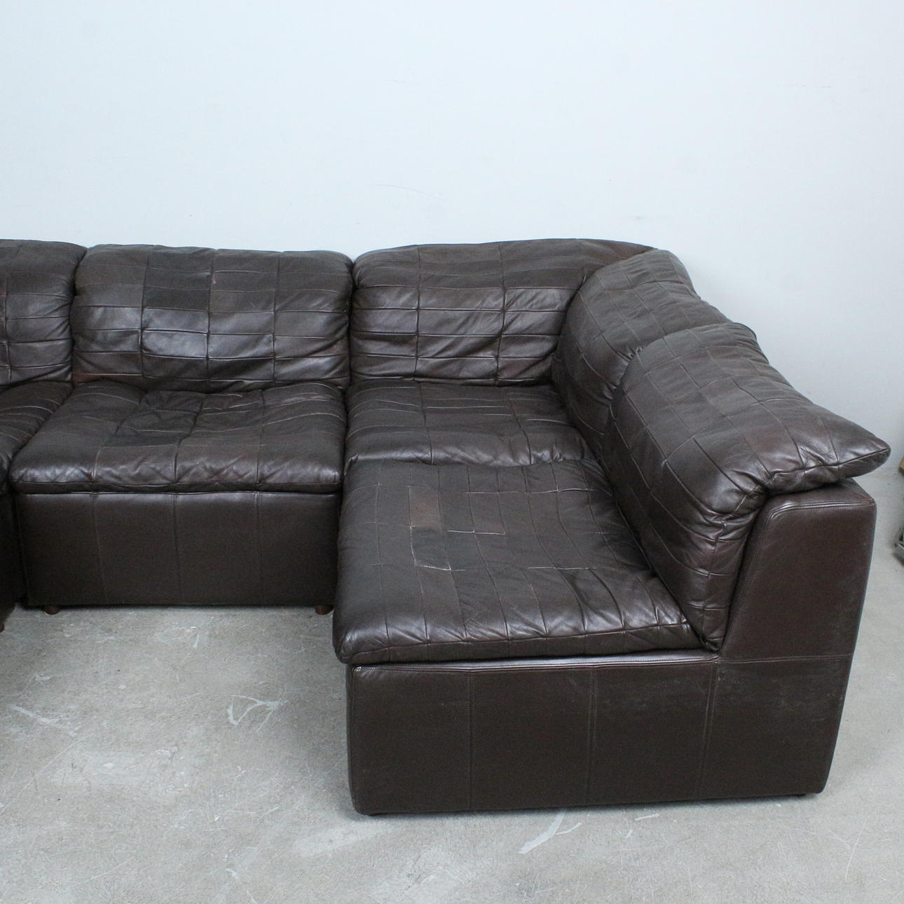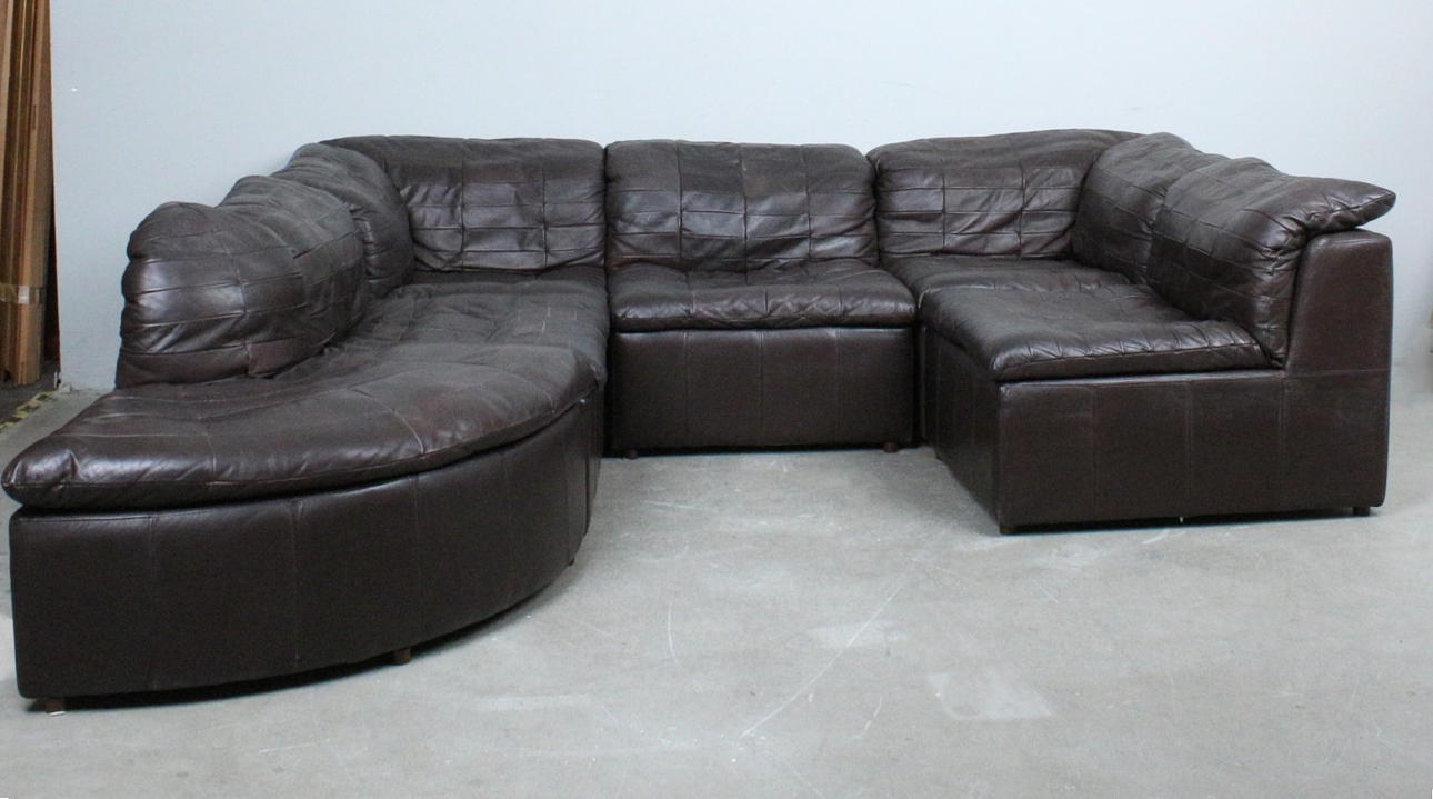 OLE CLEMMENSEN, Laauser International, six-piece modular sofa/ seating area, patchwork leather, wood, 1970s, Germany (6). Each with an upholstered wooden construction with a brown leather cover.