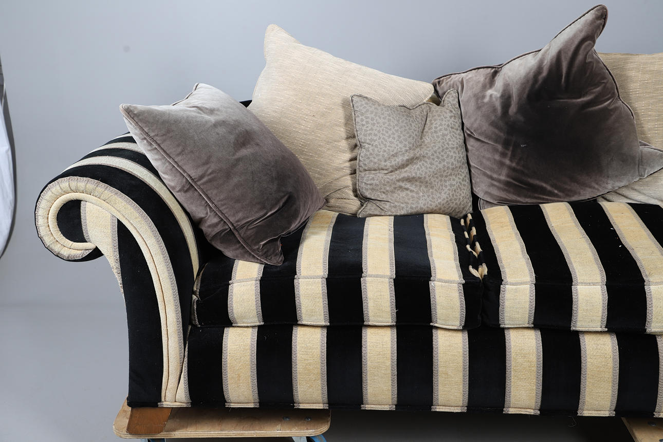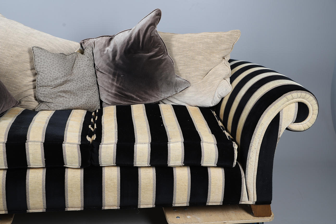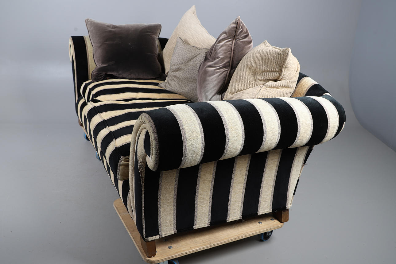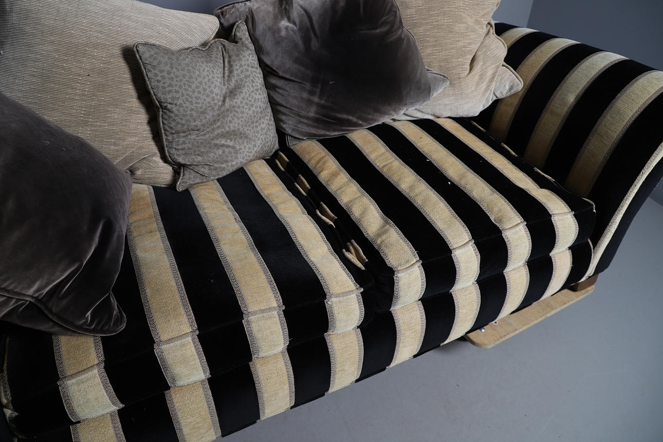 with striped upholstery, scroll armrests and removable seat cushions, all raised on shaped supports, approximately 226cm long x 100cm deep x 78cm high.