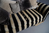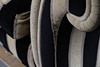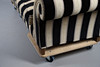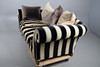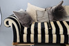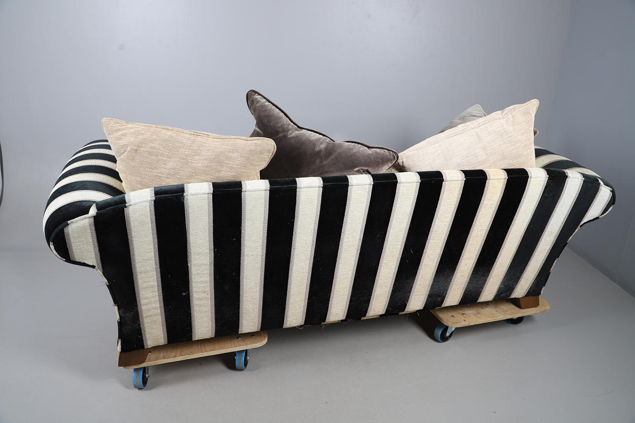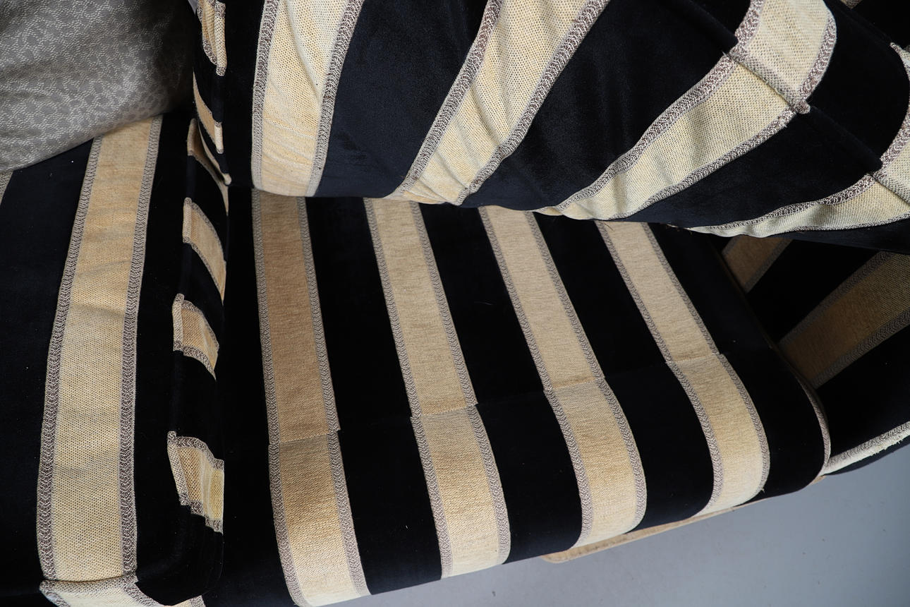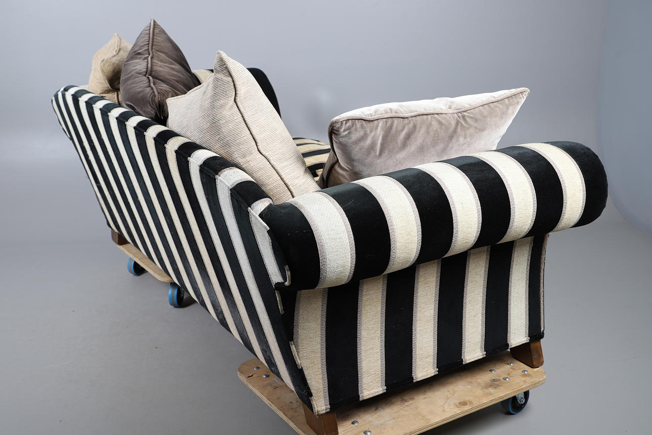 with striped upholstery, scroll armrests and removable seat cushions, all raised on shaped supports, approximately 226cm long x 100cm deep x 78cm high.