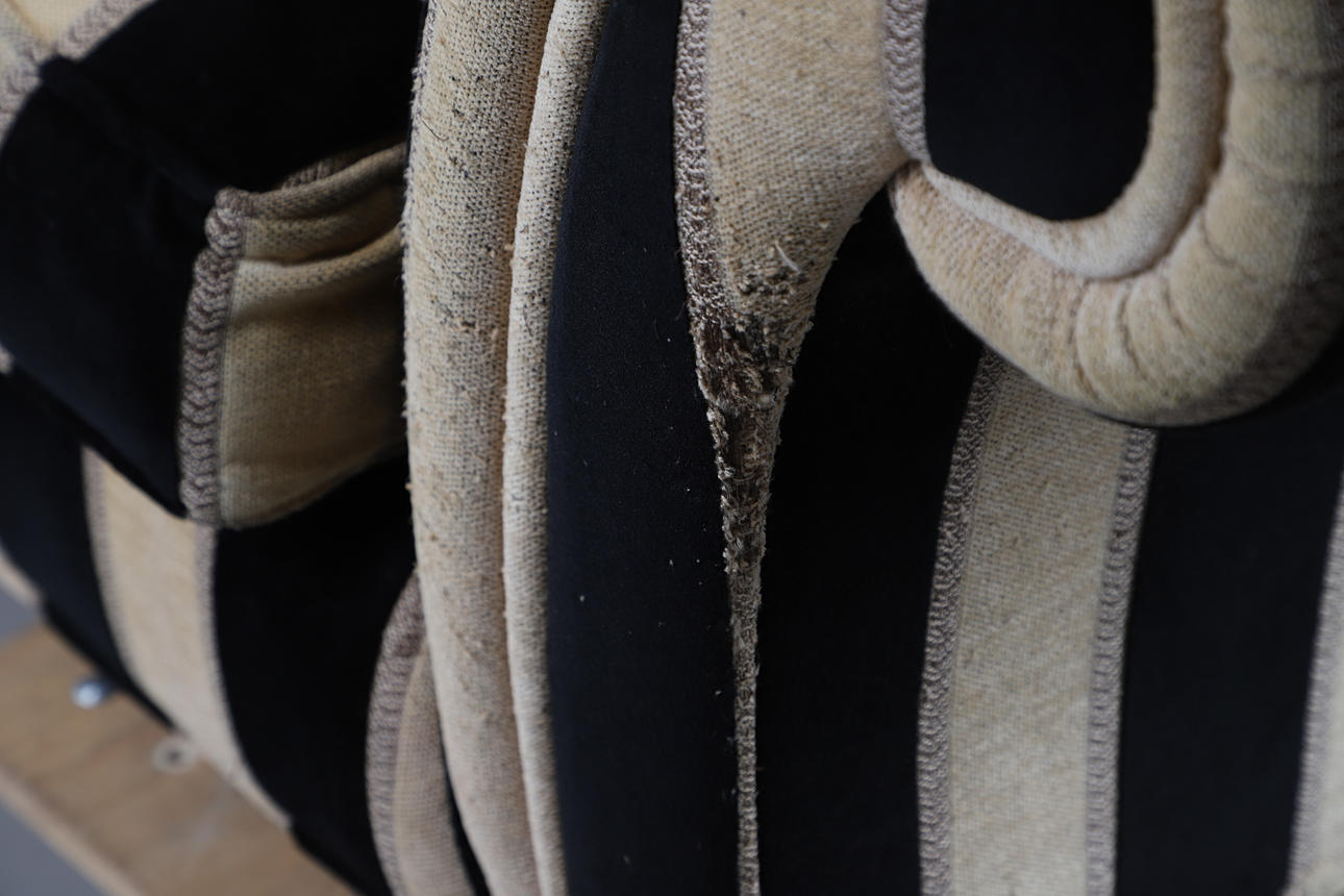 In need of reupholstery with upholstery heavily marked and faded. Frame structurally sound.. Other imperfections. See online images.