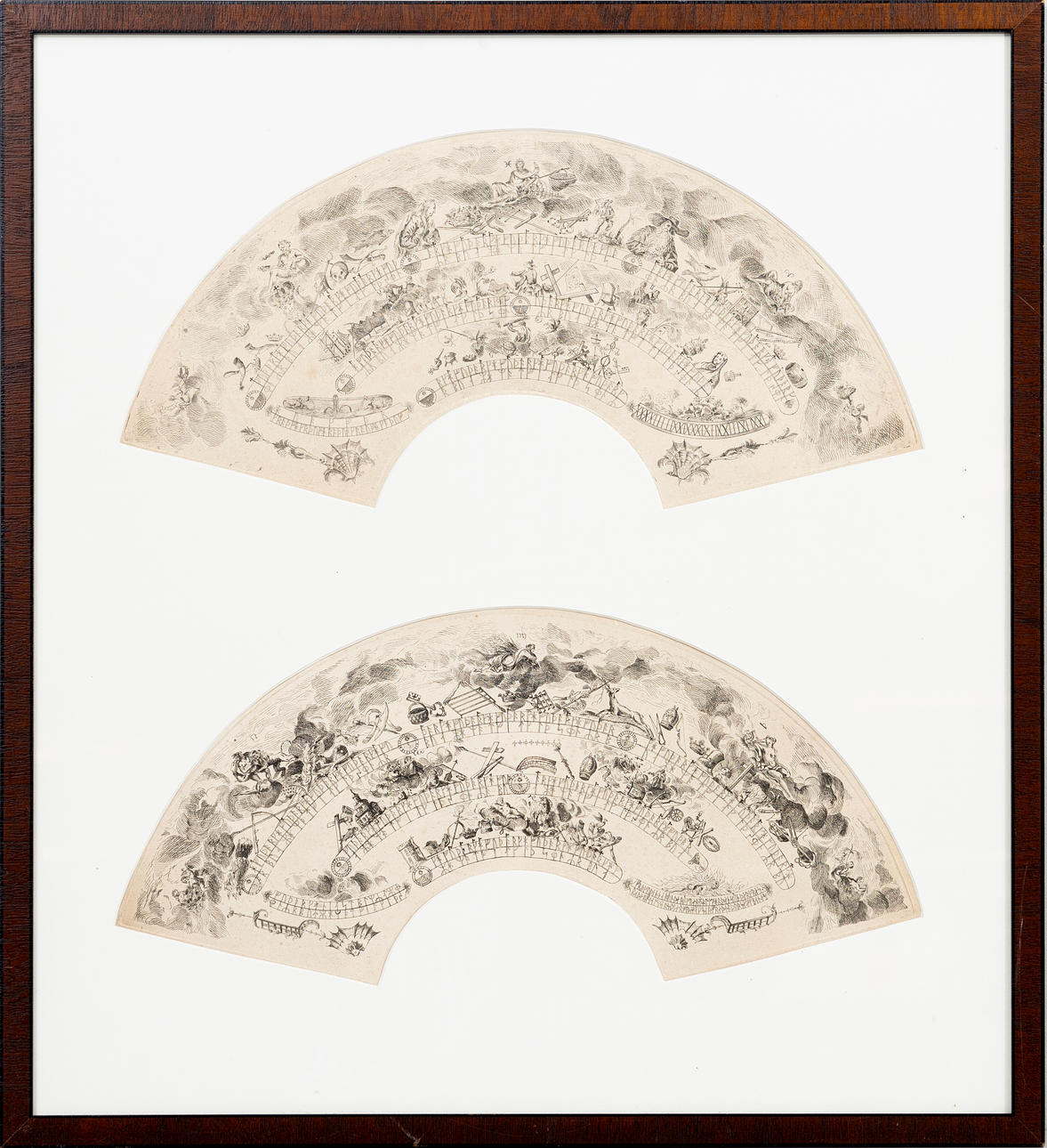 TWO ENGRAVINGS, FAN-SHAPED, MYTHOLOGICAL MOTIFS, COMMON FRAME.