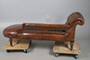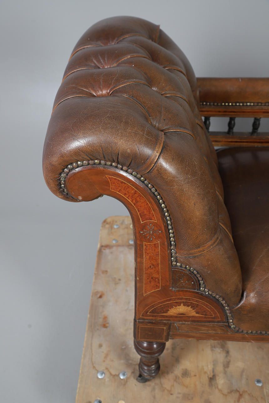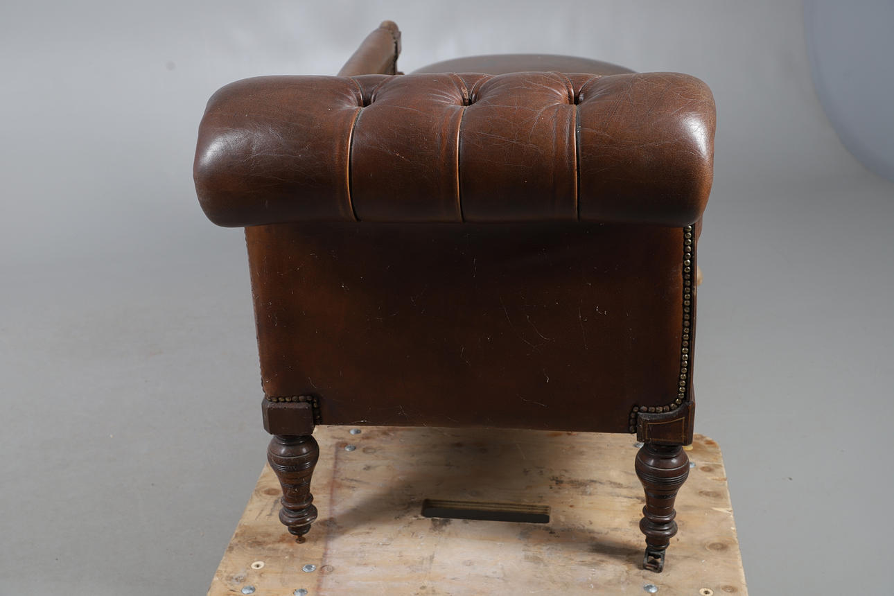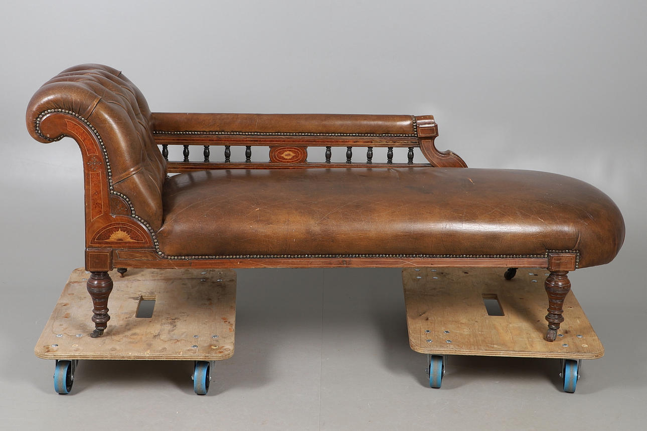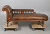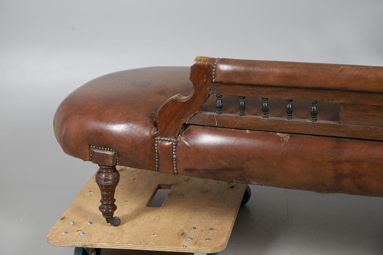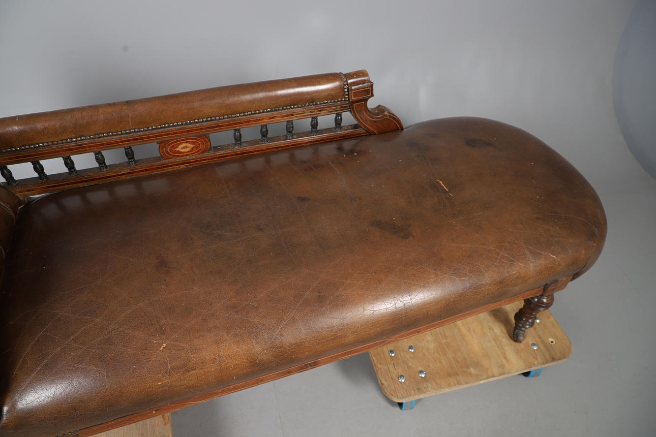An Edwardian leather button back chaise longue, with stringing and raised on turned supports and casters. 76cm (h) x 188cm (approx. length) x 66cm (w).