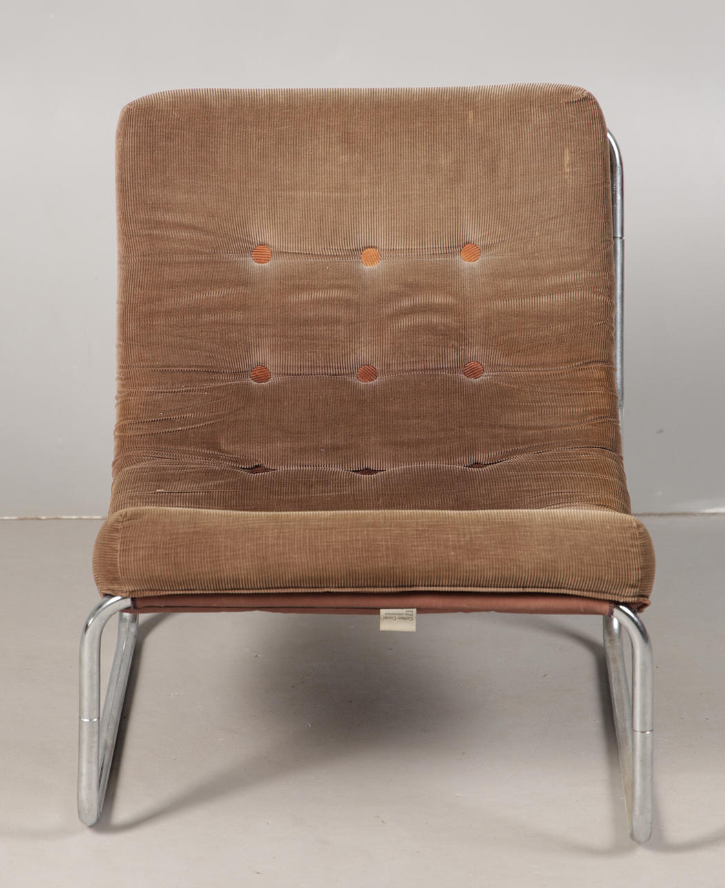 The 1960's tubular metal and brown upholstered lounge chair, measuring 70cm height, 59cm width, 70cm depth.