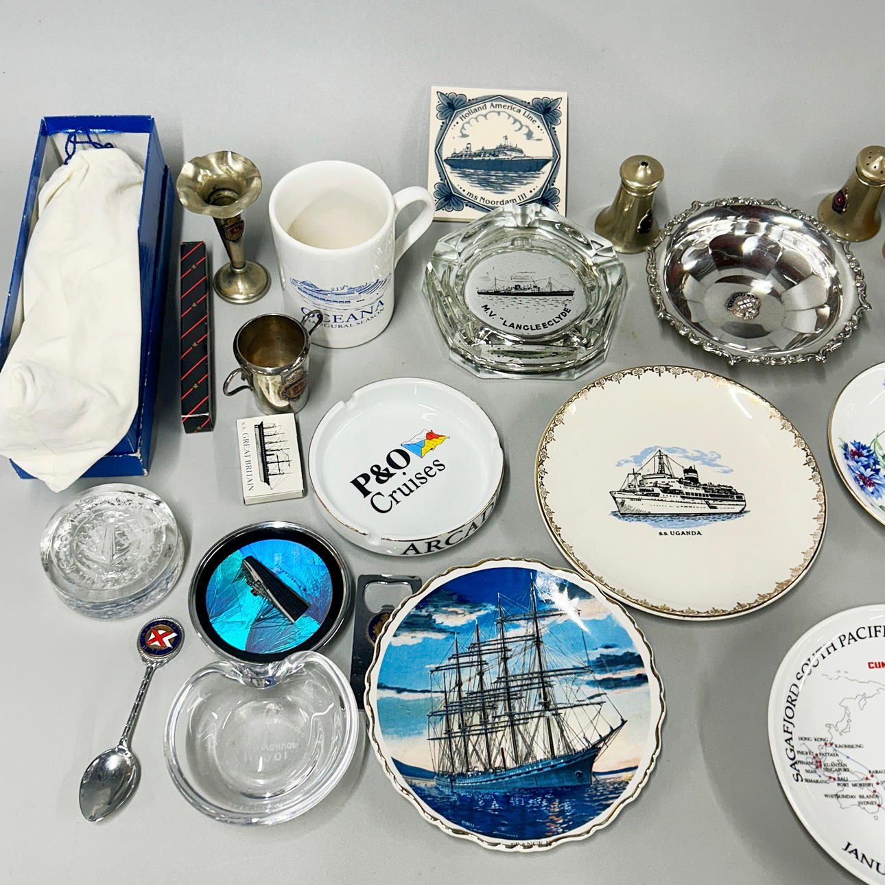 A quantity of mixed shipping company liner items such as porcelain, stamps, souvenirs and other related items, approximate volume 48 x 20 x 20cm.