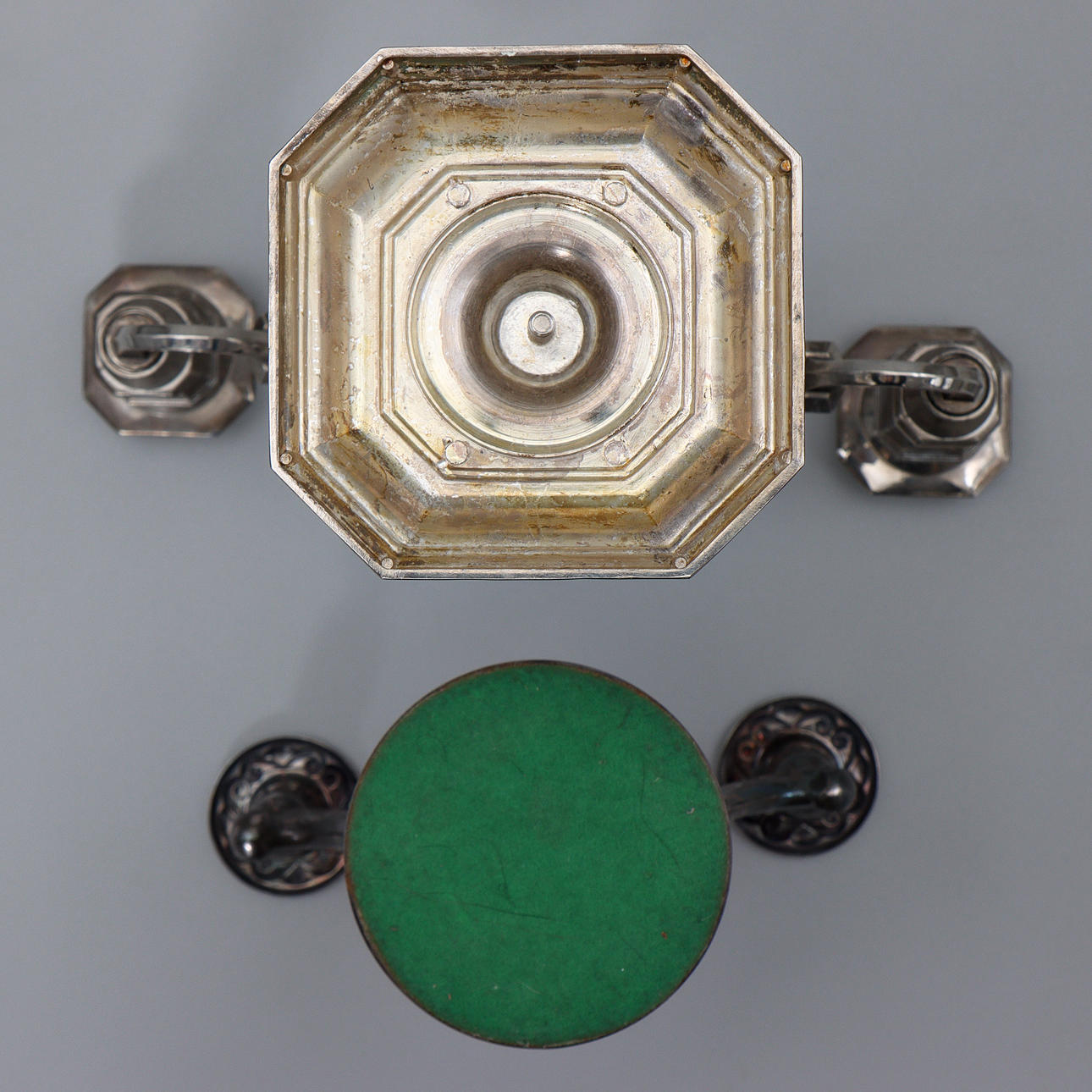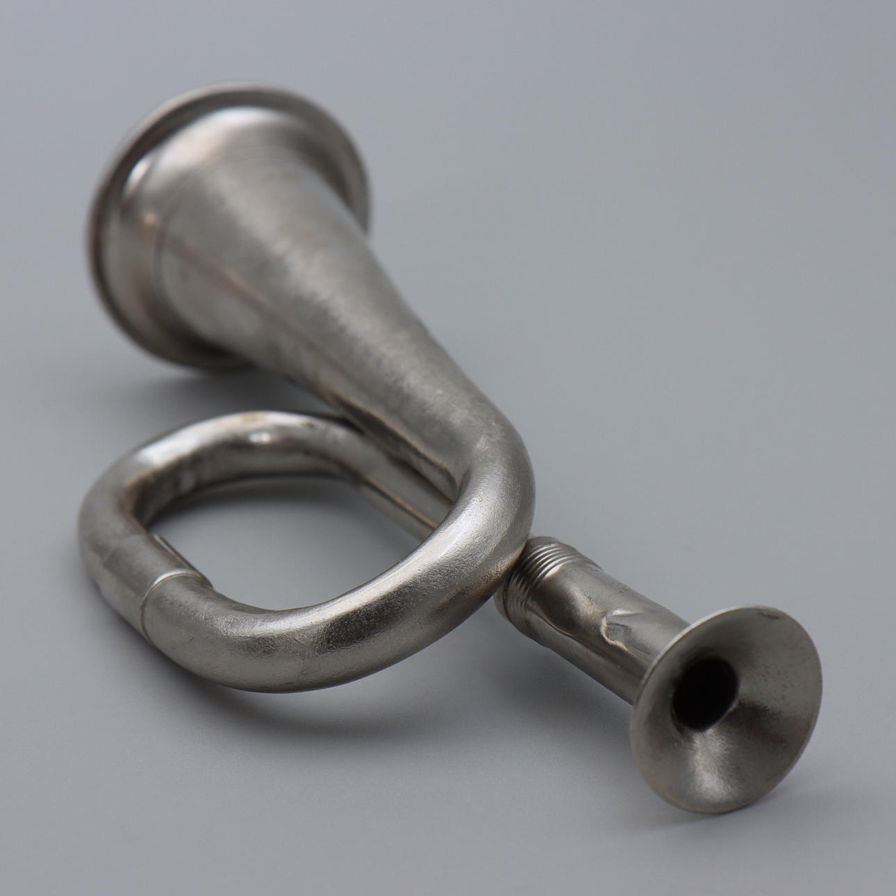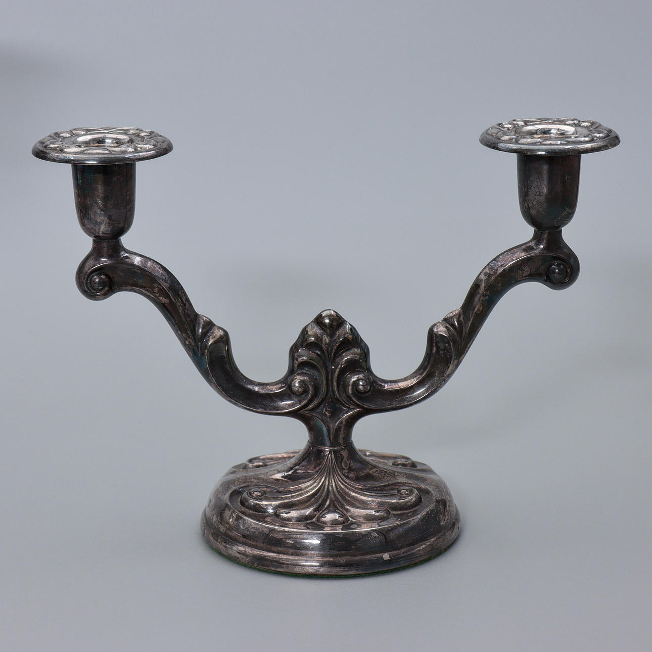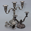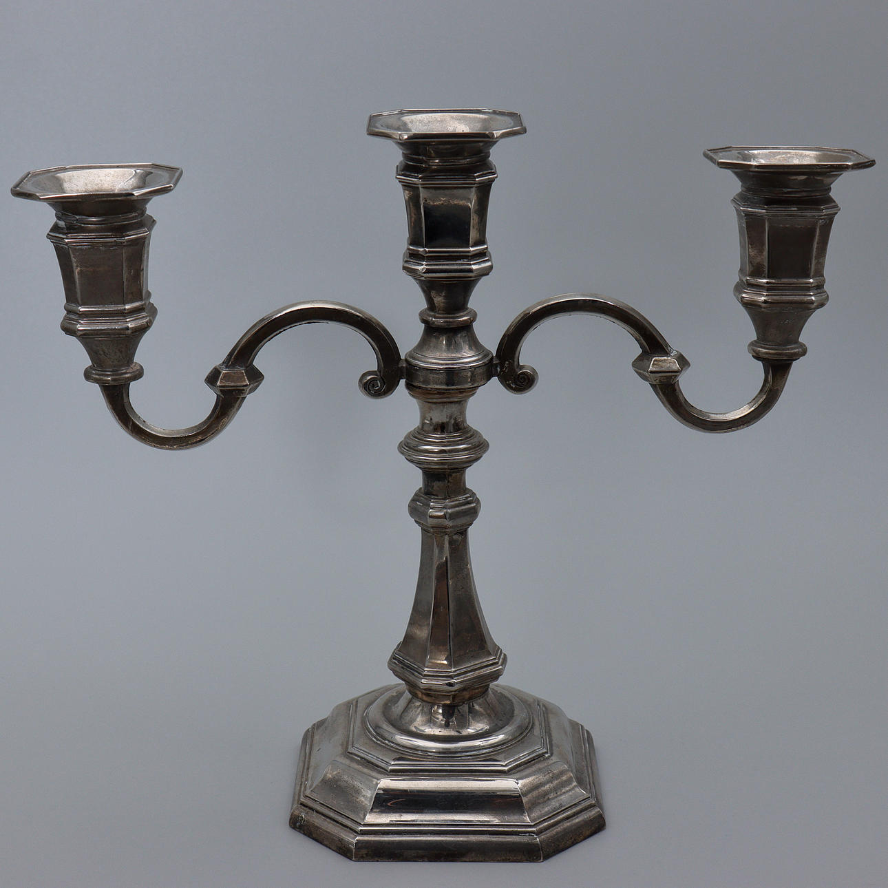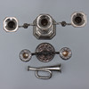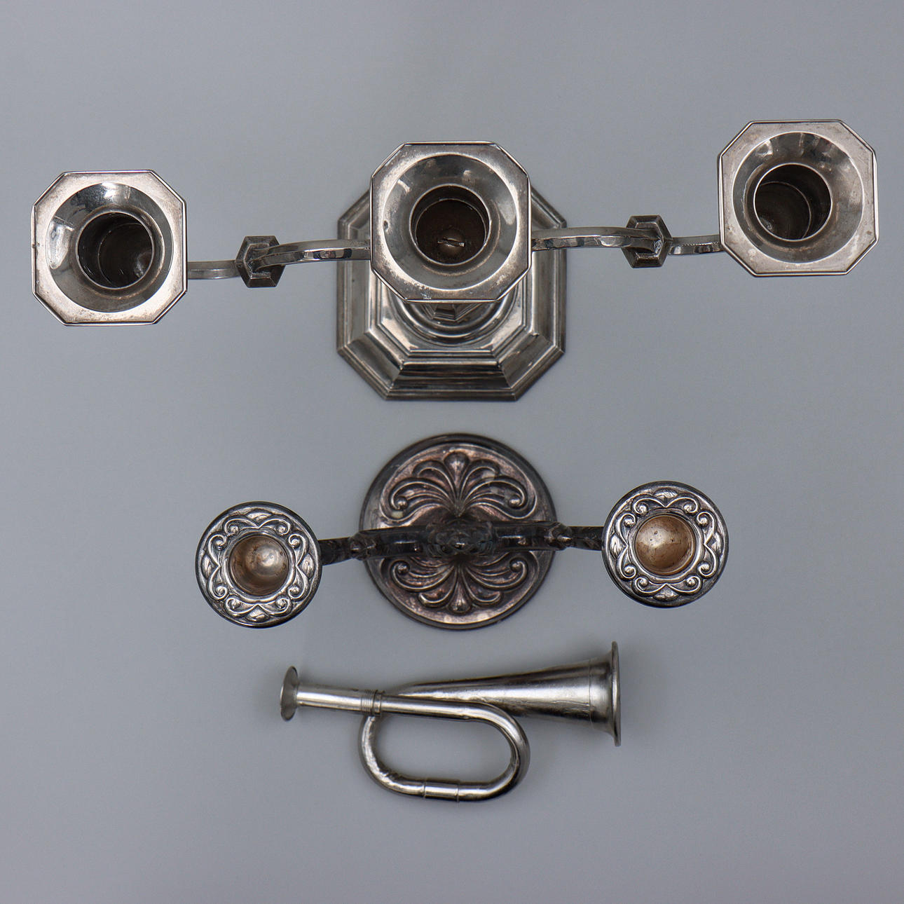 Candelabra height 24,5, width 28 cm Candelabra height 15, width 20,5 cm Trumpet length 15,5 cm.