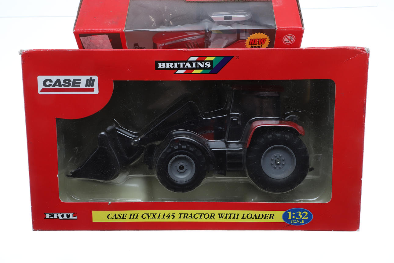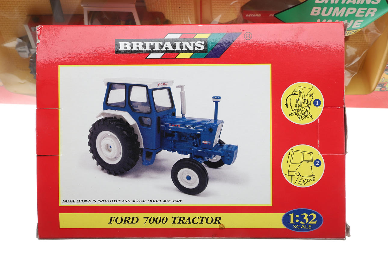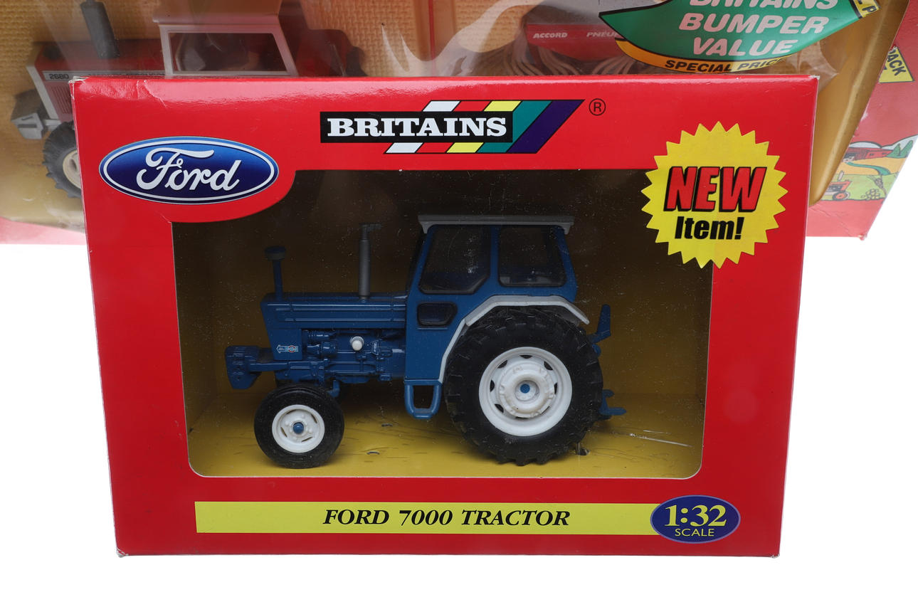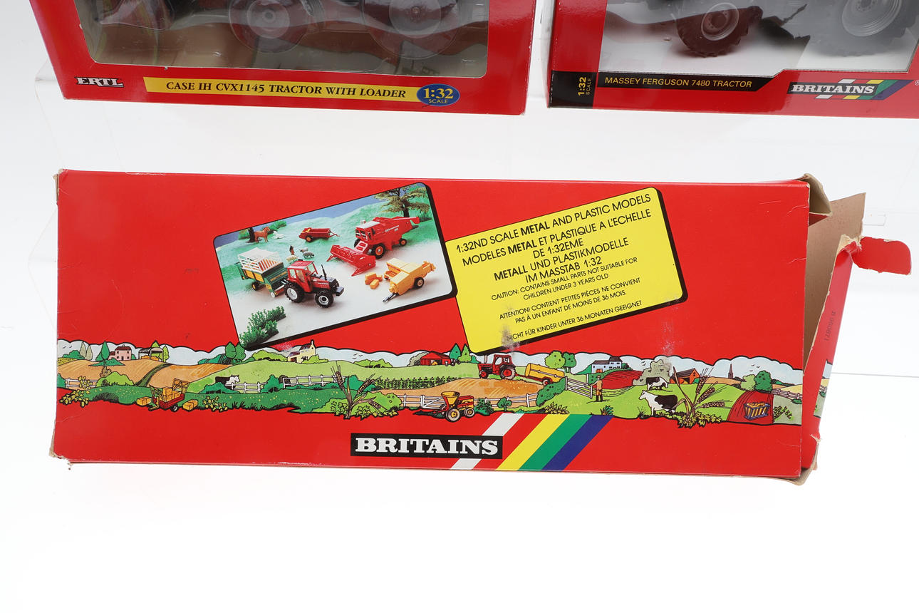 Four boxed 1:32 scale model tractors, including Ford 7000, Massey Ferguson 7480, Case 1145, and Massey Ferguson and Seed Drill. Largest box 41cms across by 15cms high. (4).