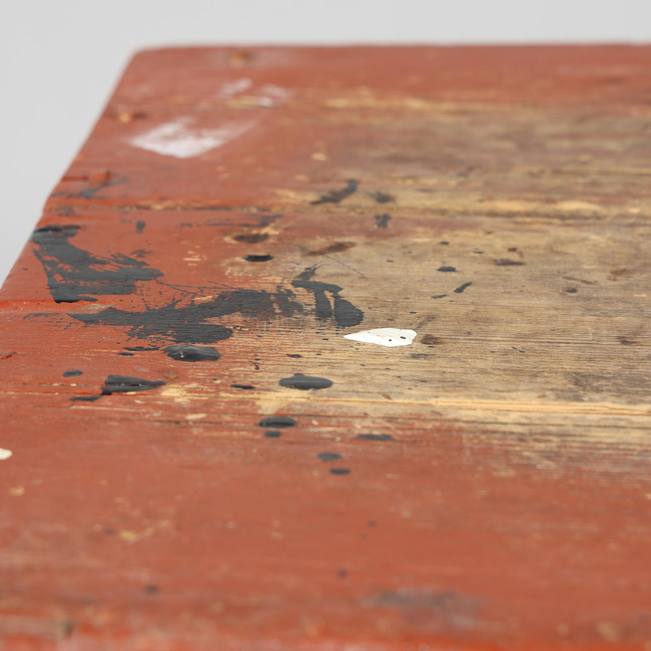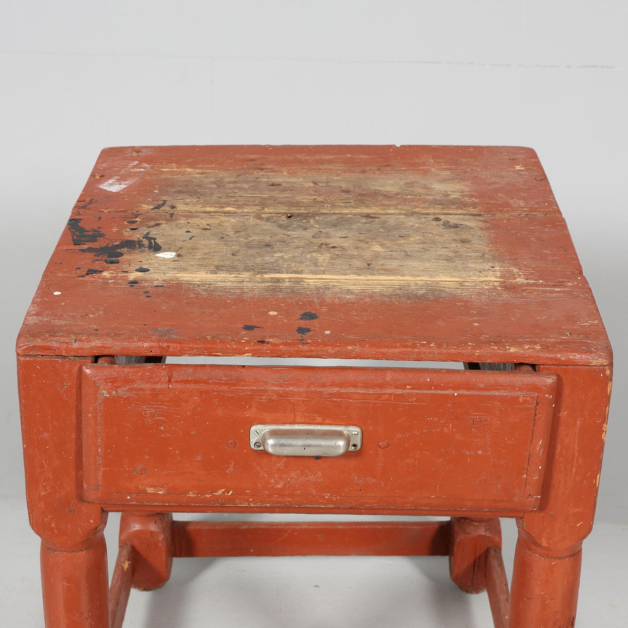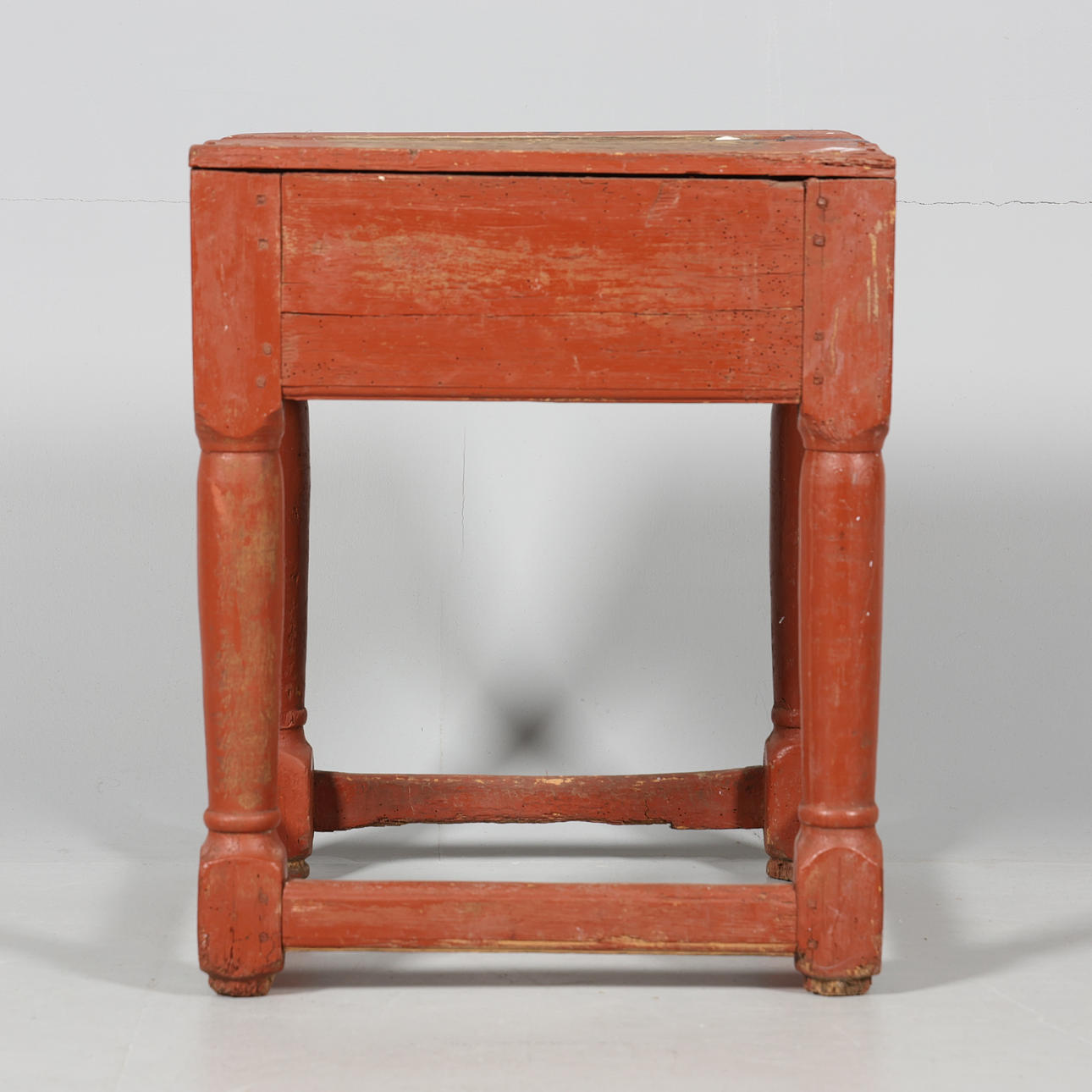 Usage and age-related wear. Handle not original. Wormholes. Stains of paint. 1 wooden board missing inside box.