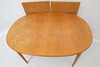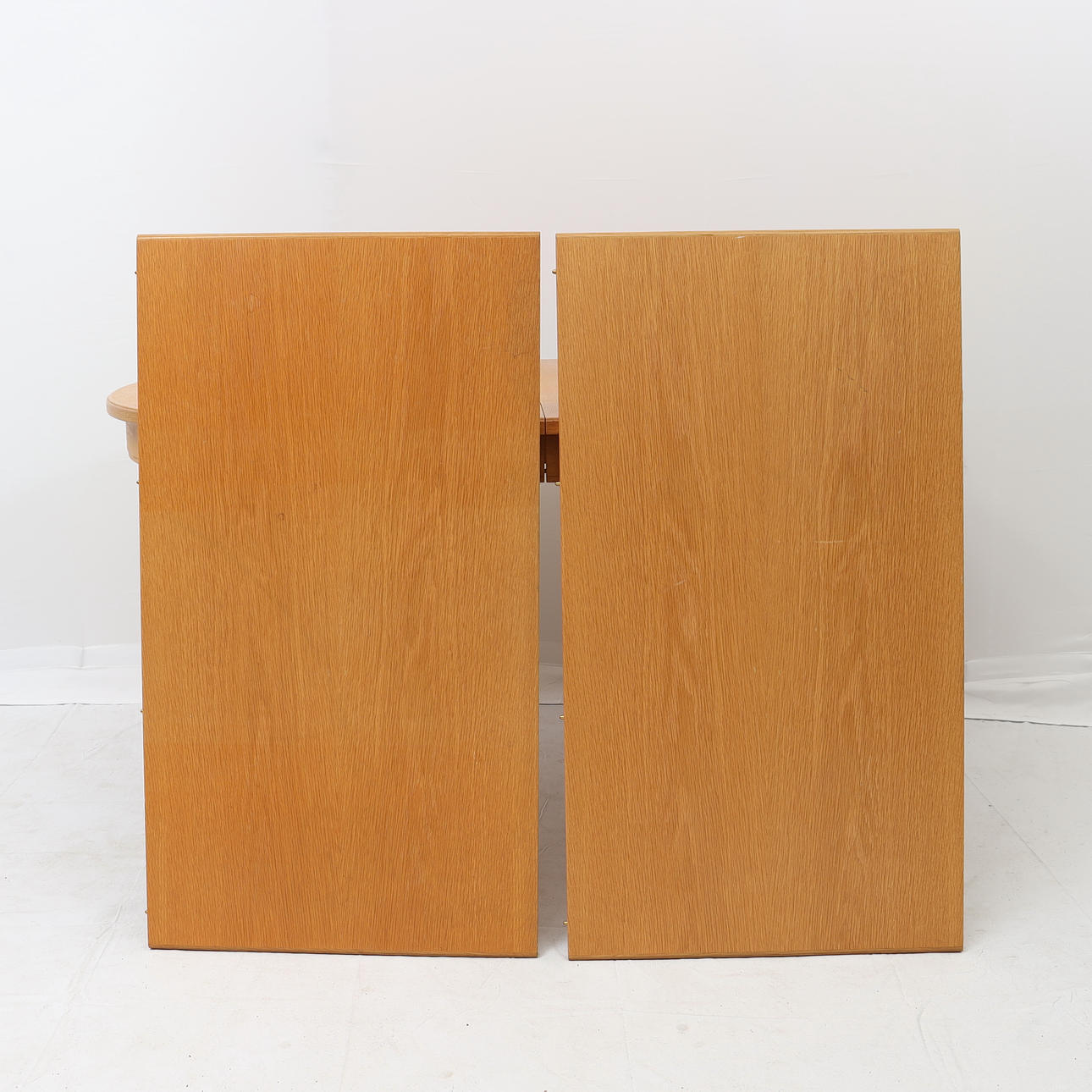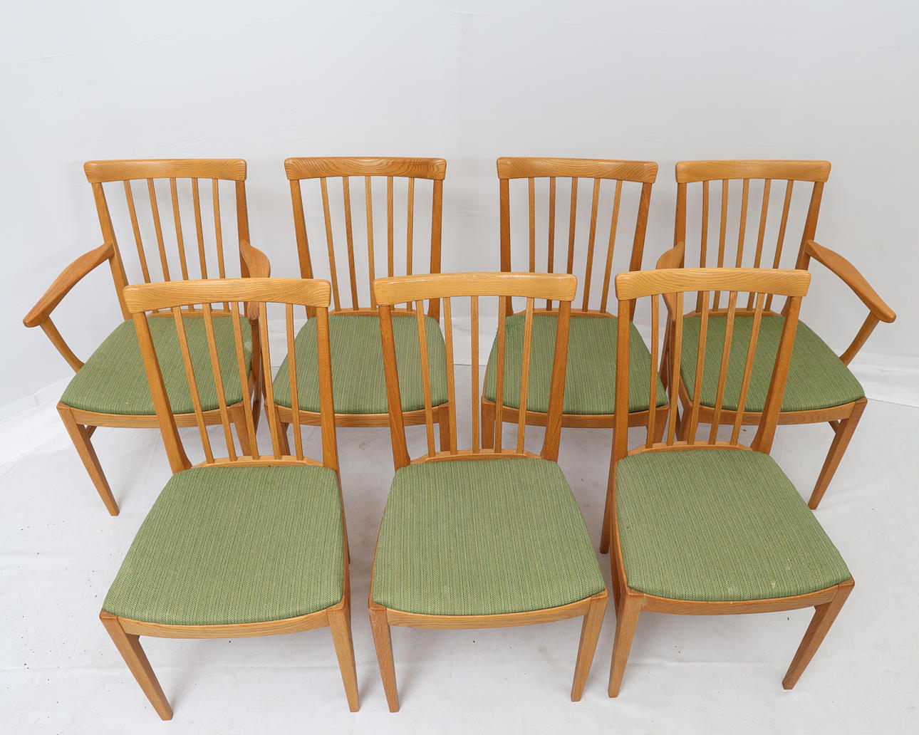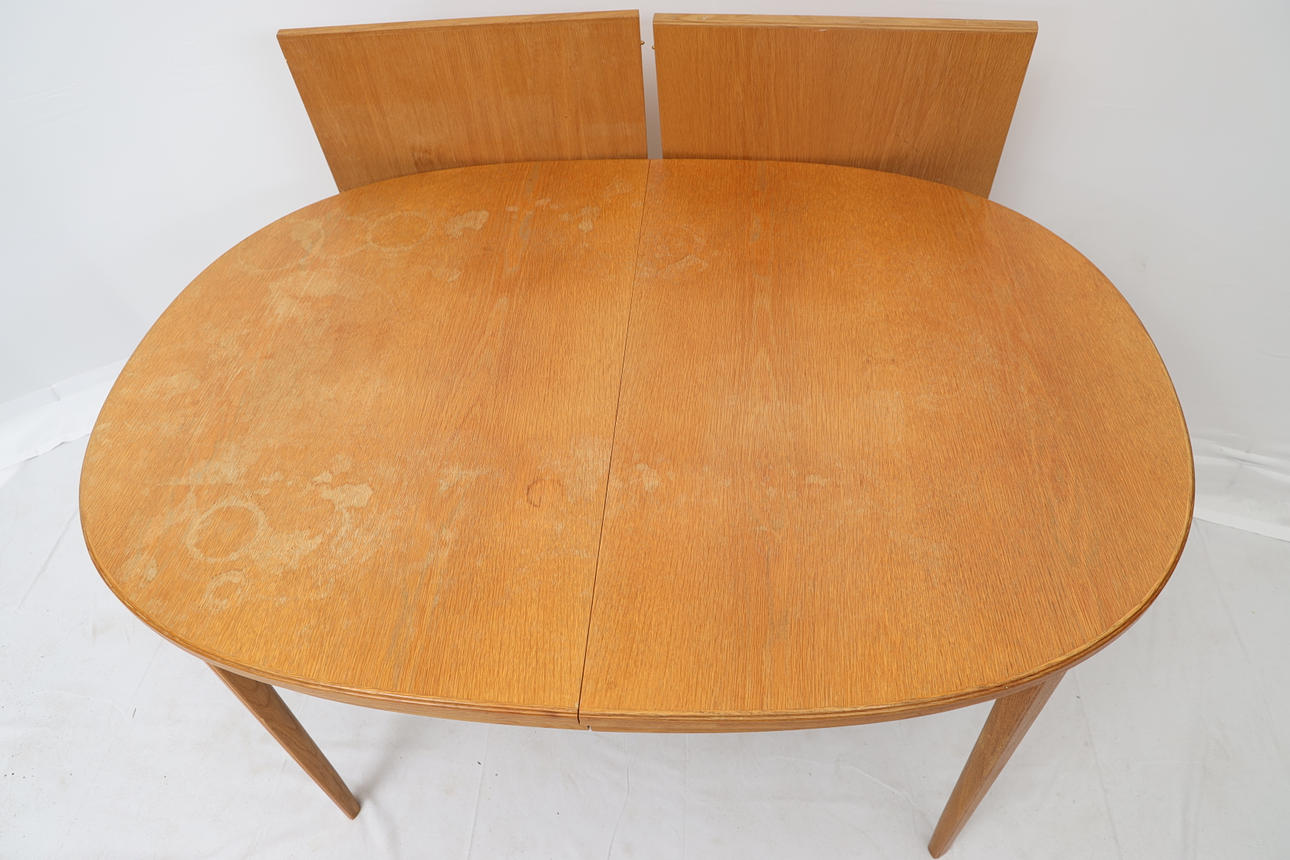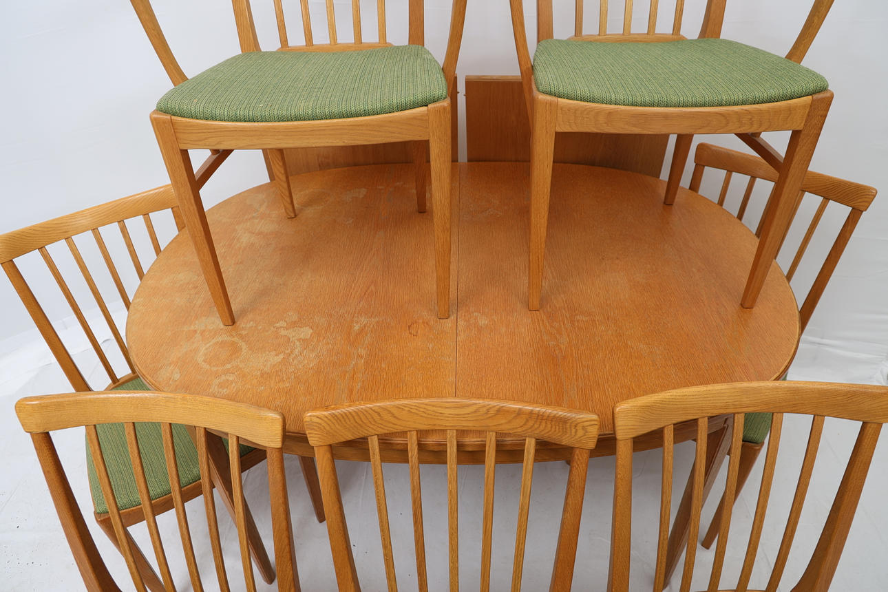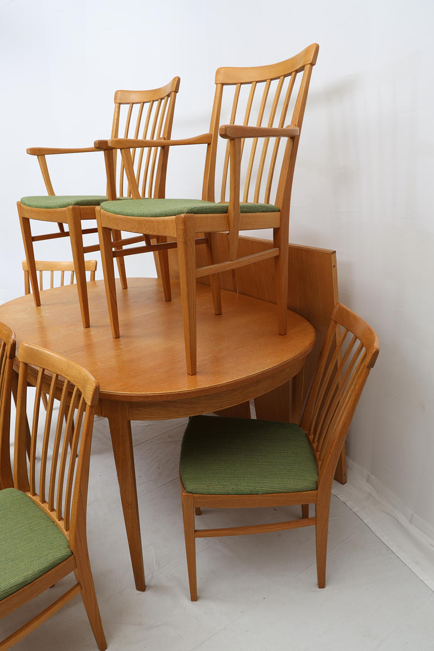 Oak. Comprising five chairs, two armchairs and a dining table with two extension leaves of 55 cm each.