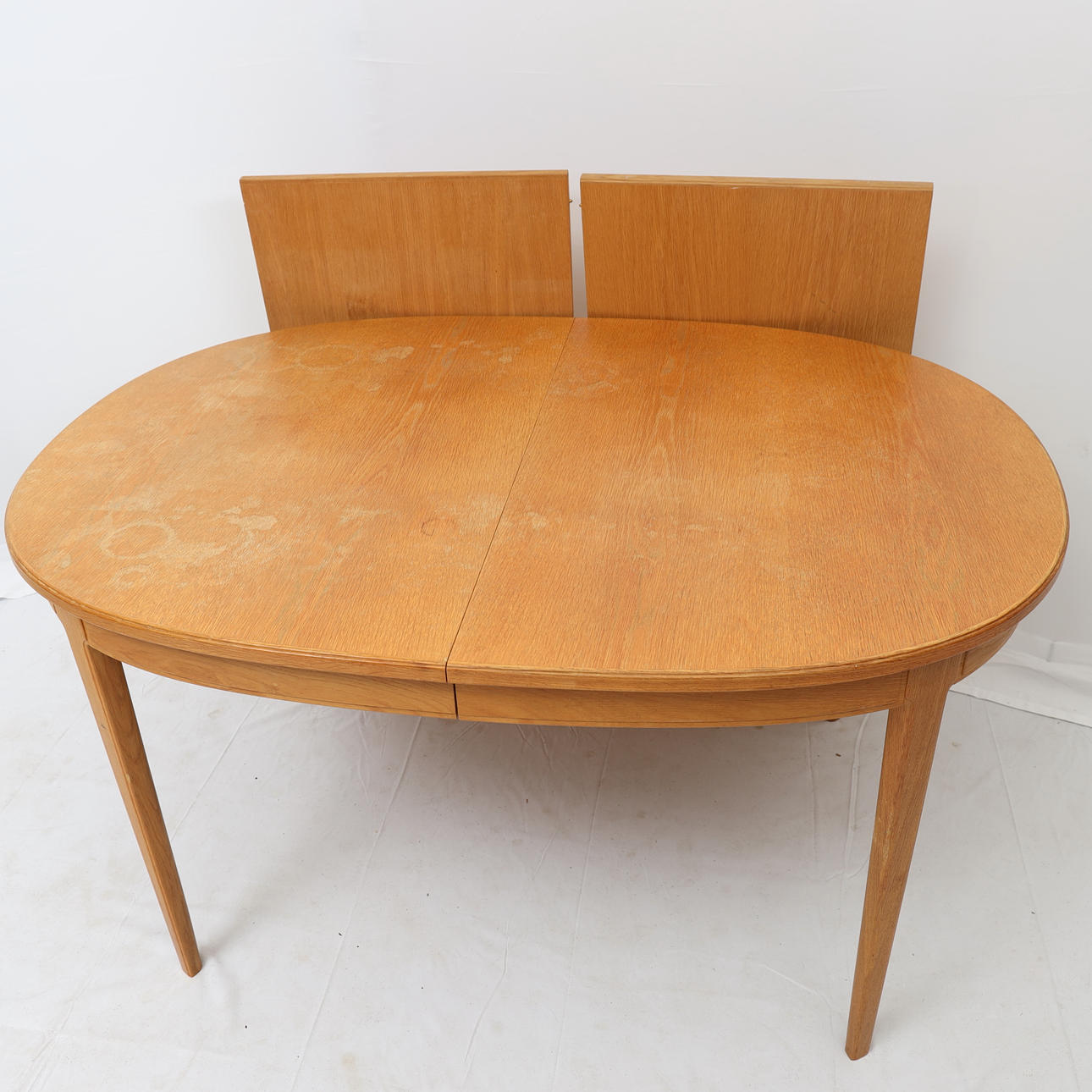 Wear, stains. Seats with dried padding. Table top slightly faded.