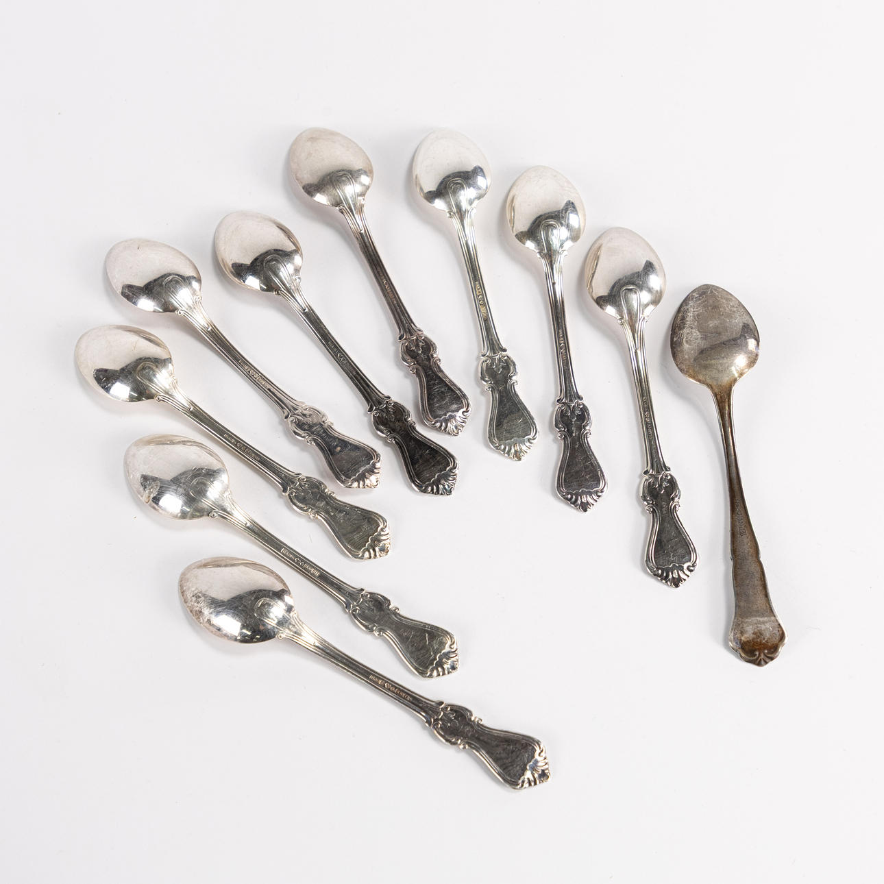 COFFEE SPOONS, 9+1 pcs, silver, length 11.5 cm, weight 136.6 grams.