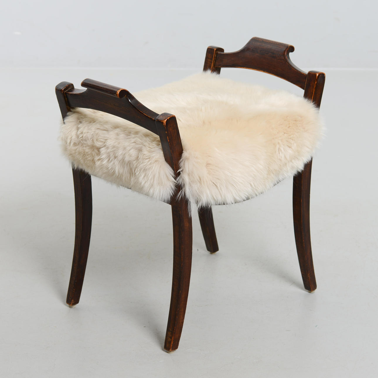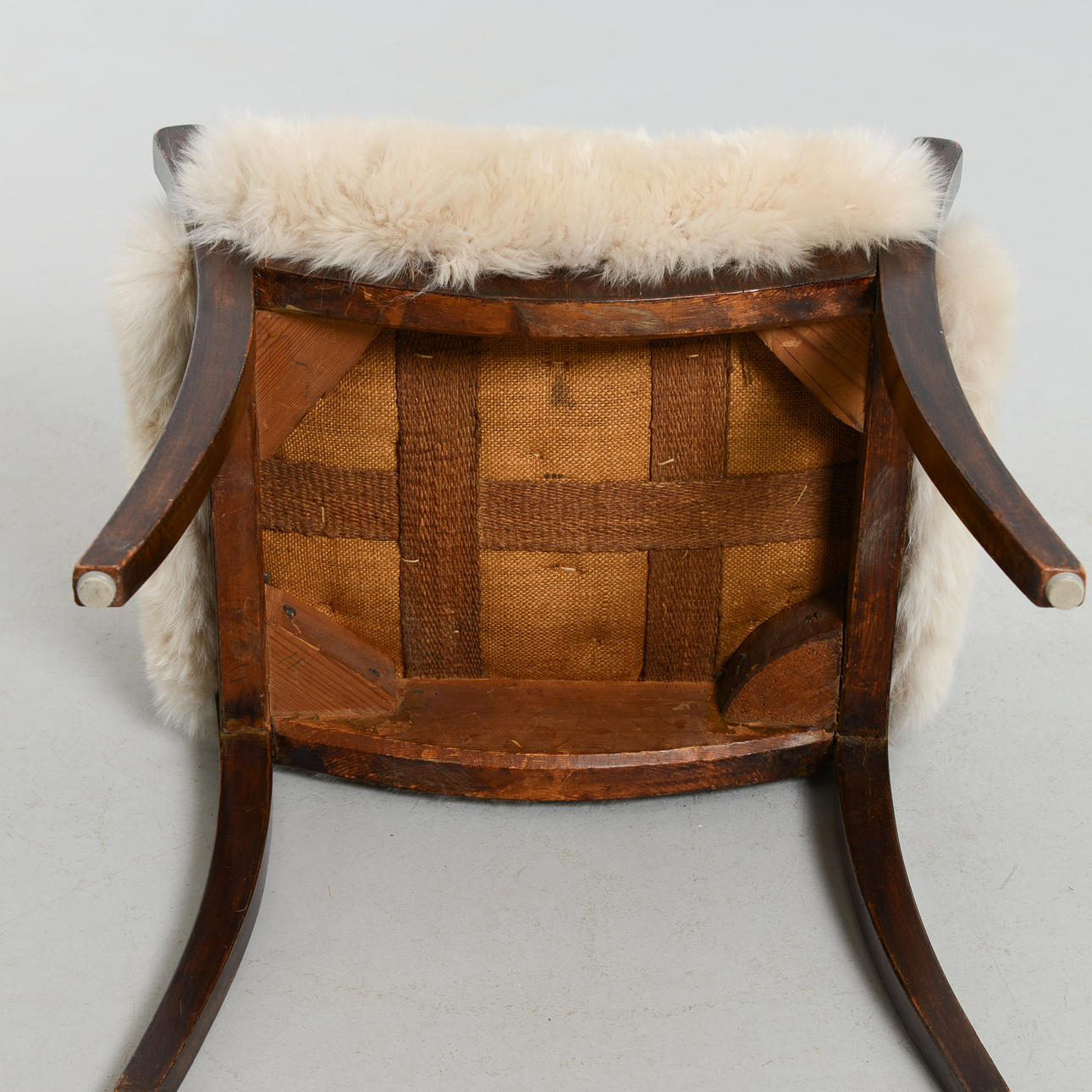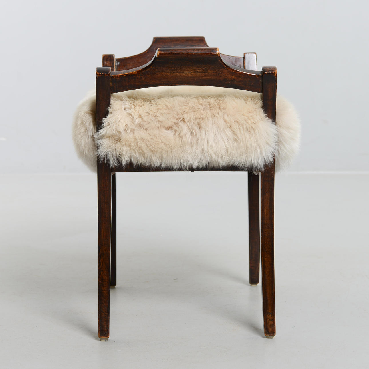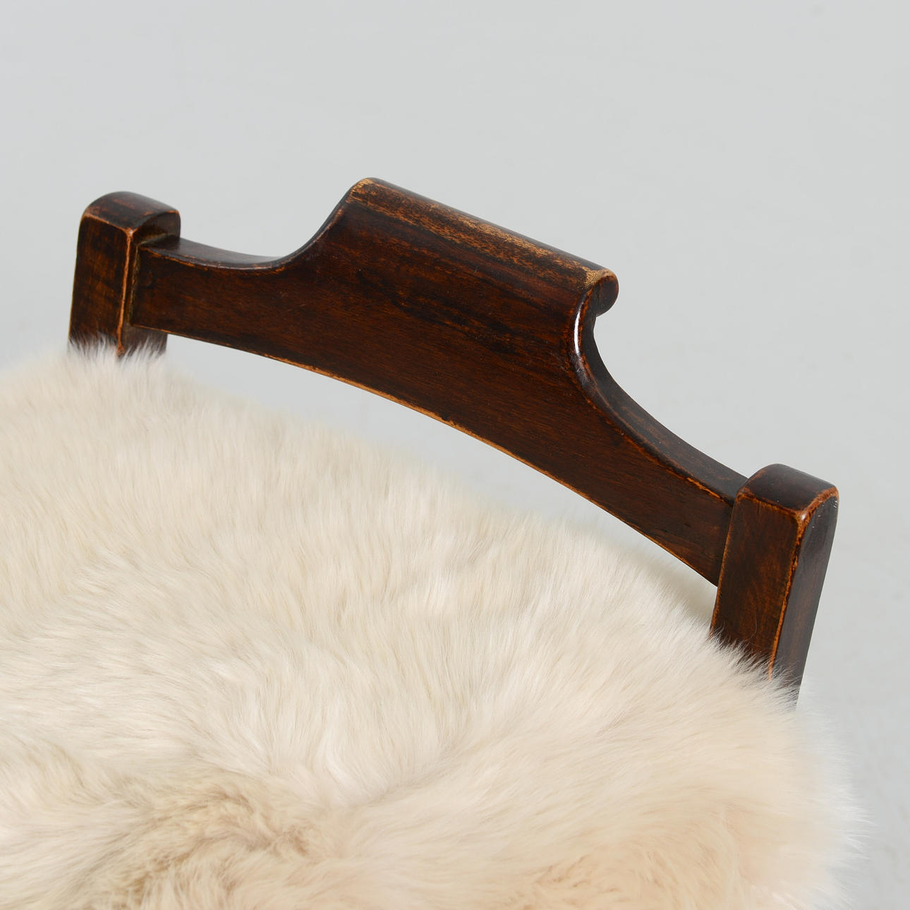 Stained wood. Recently reupholstered in sheepskin. Width 58 cm. Seat height approx. 48 cm.