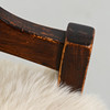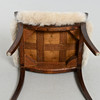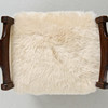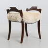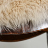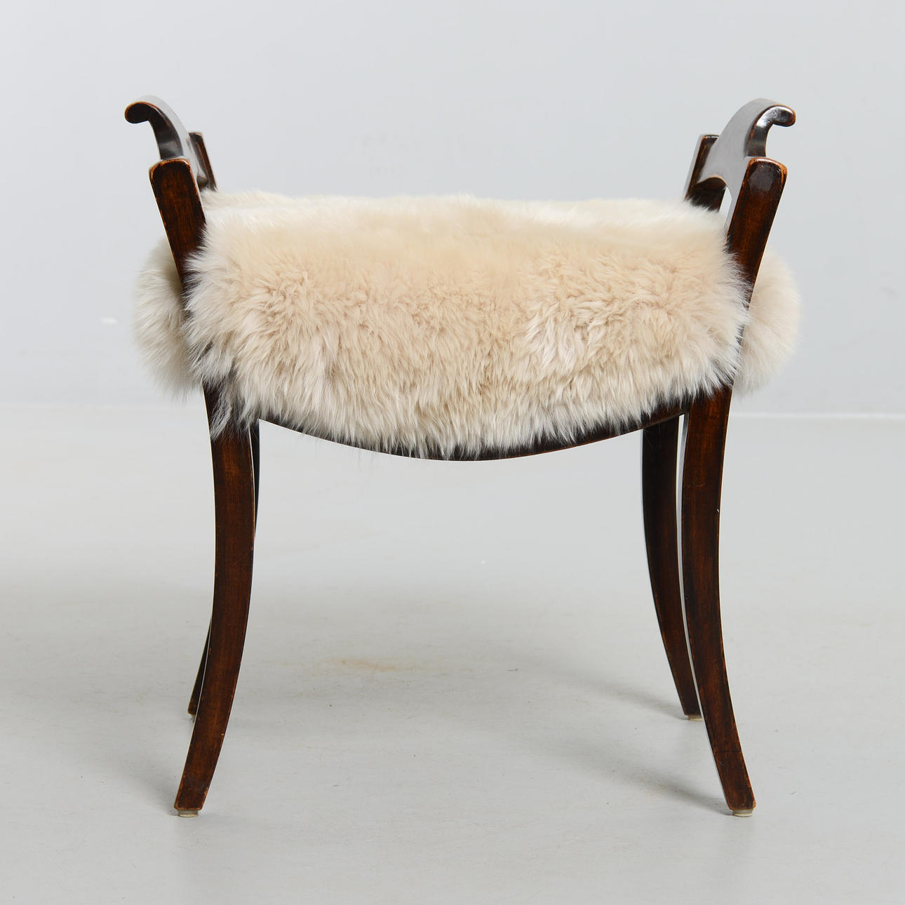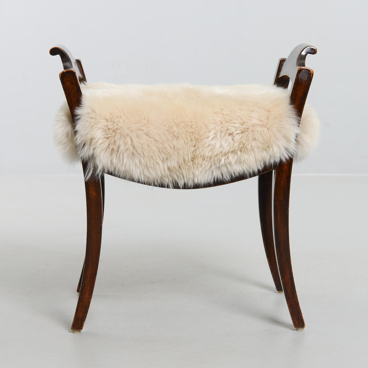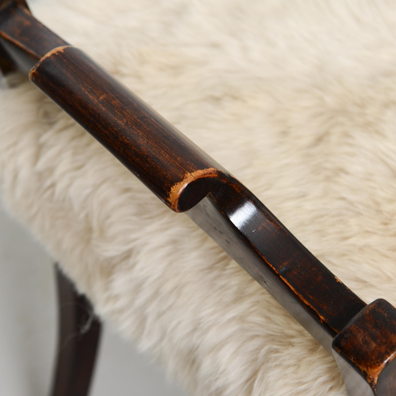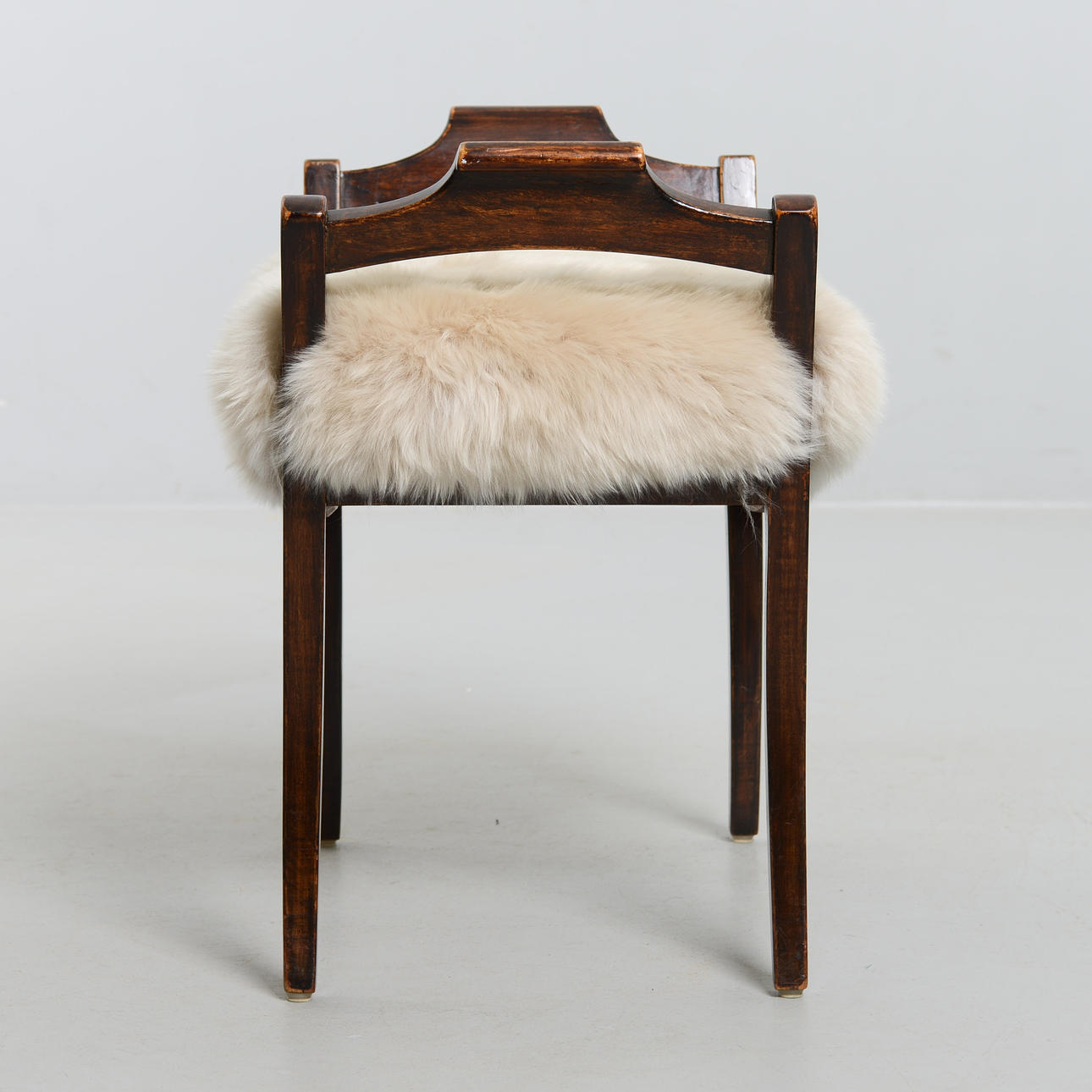 Stained wood. Recently reupholstered in sheepskin. Width 58 cm. Seat height approx. 48 cm.