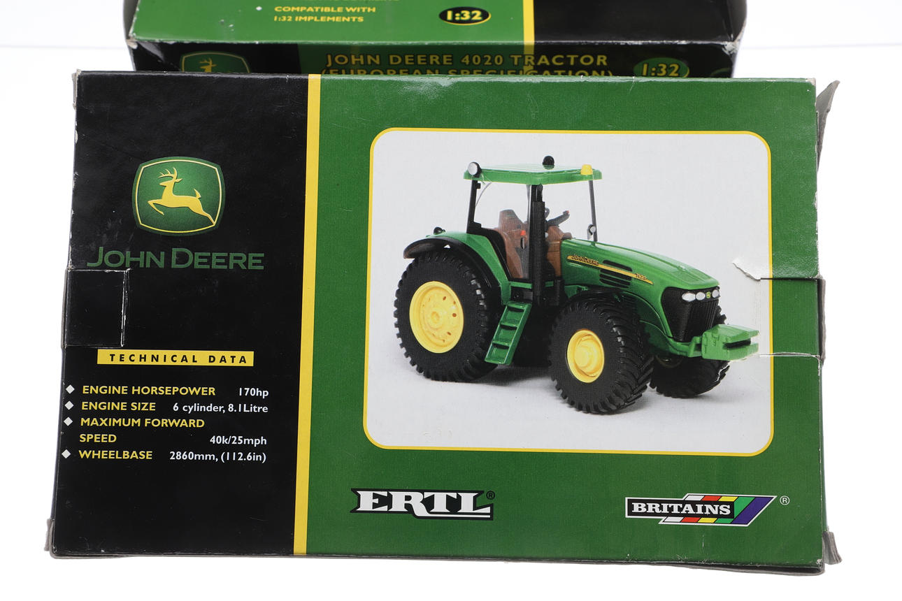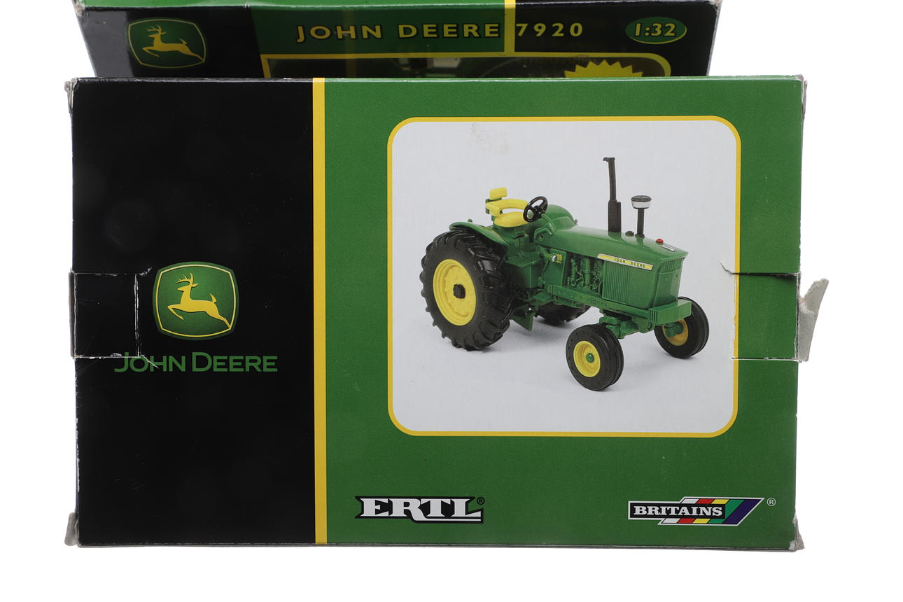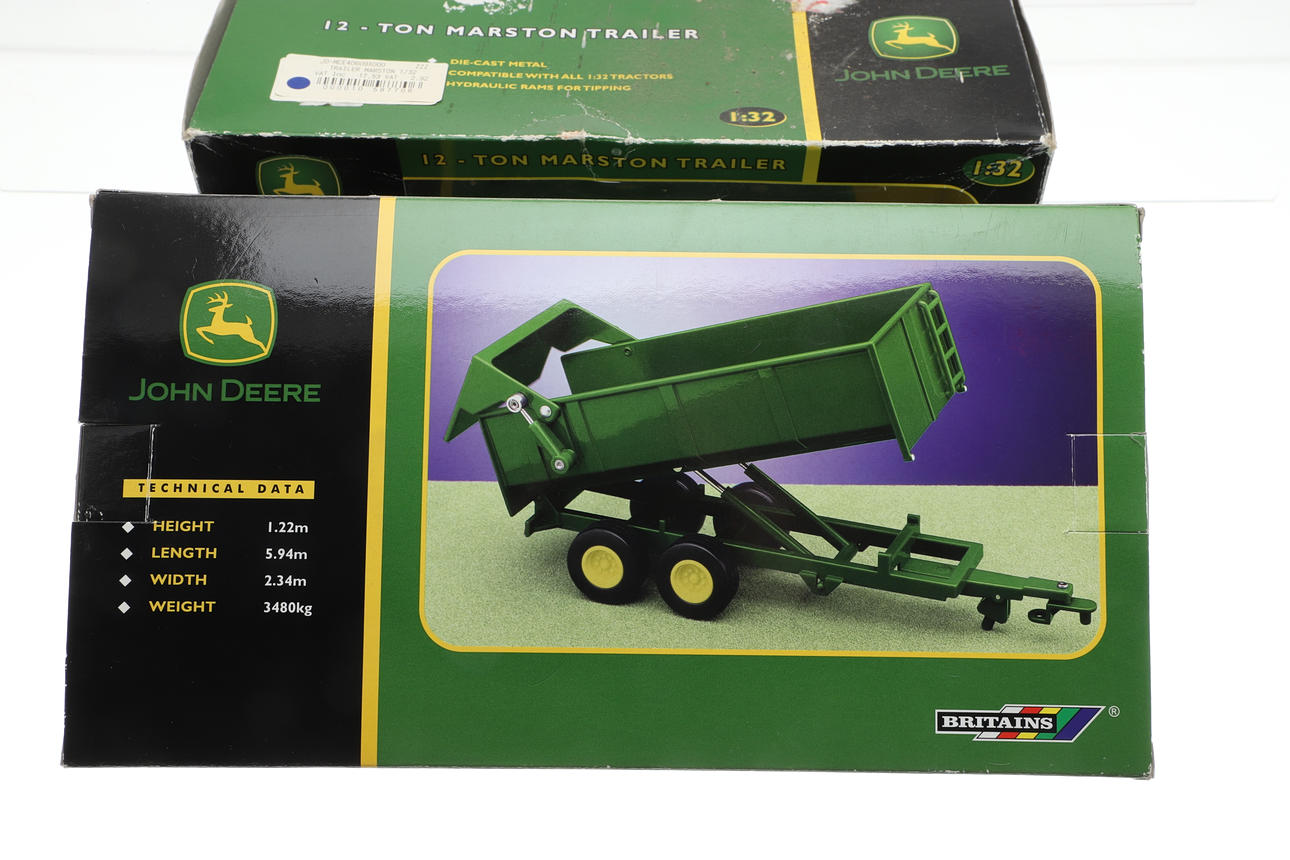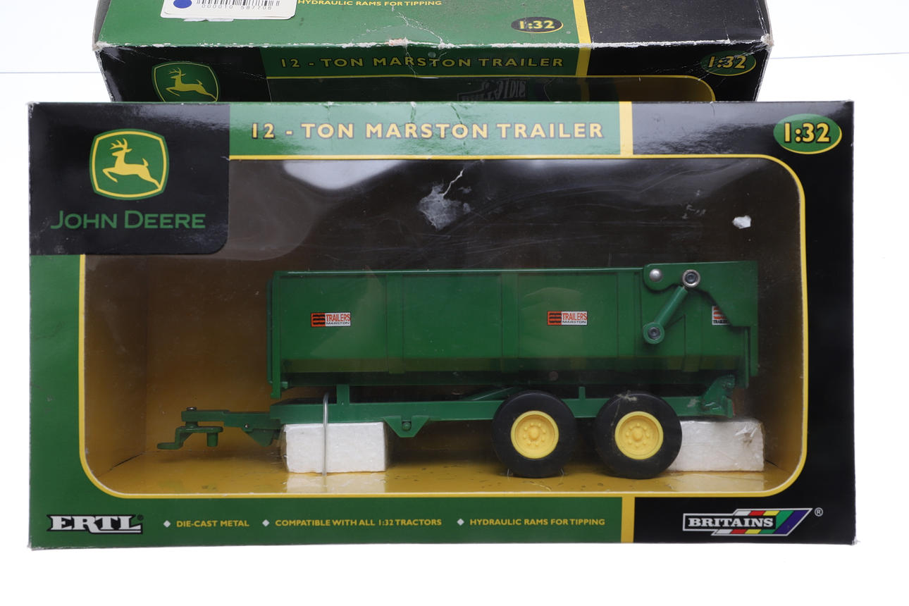1:32 scale, including John Deere 4020 Tractor, John Deere 7920 Tractor, 12 Ton Marston Trailer, and 12 Ton Marston Trailer. Largest box 28.5cms across by 15.5cms high. (4).