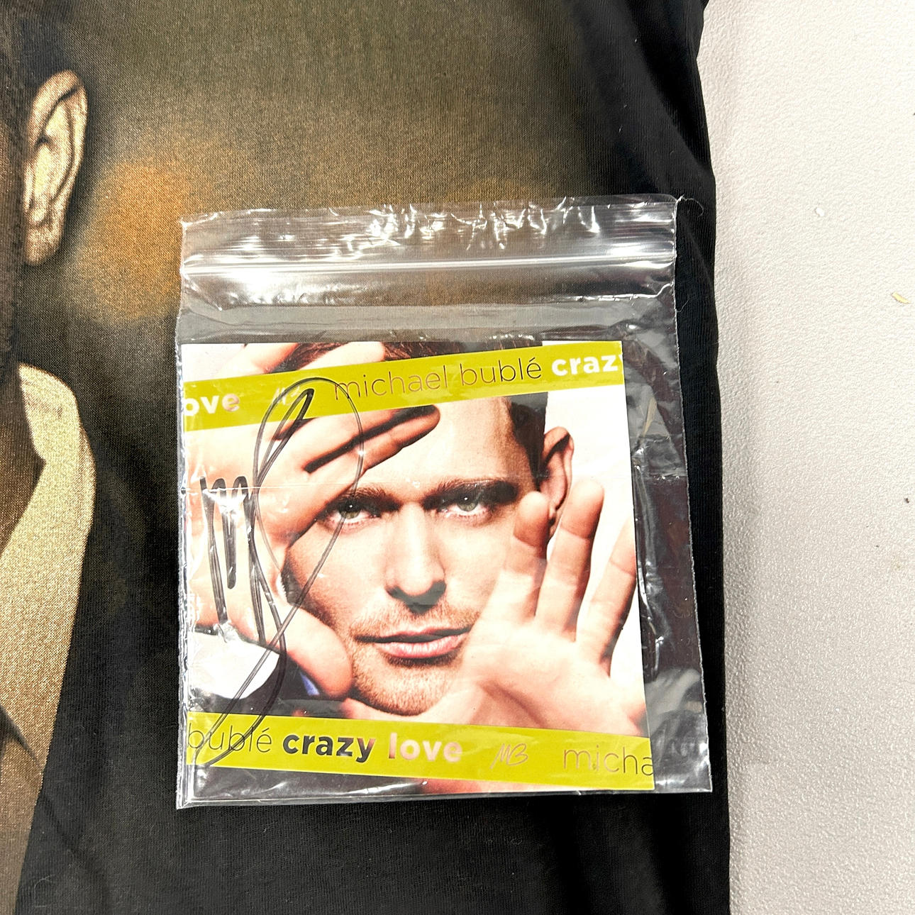 A Michael Buble signed booklet with a T-Shirt, size Medium. 23 x 29cm.