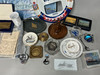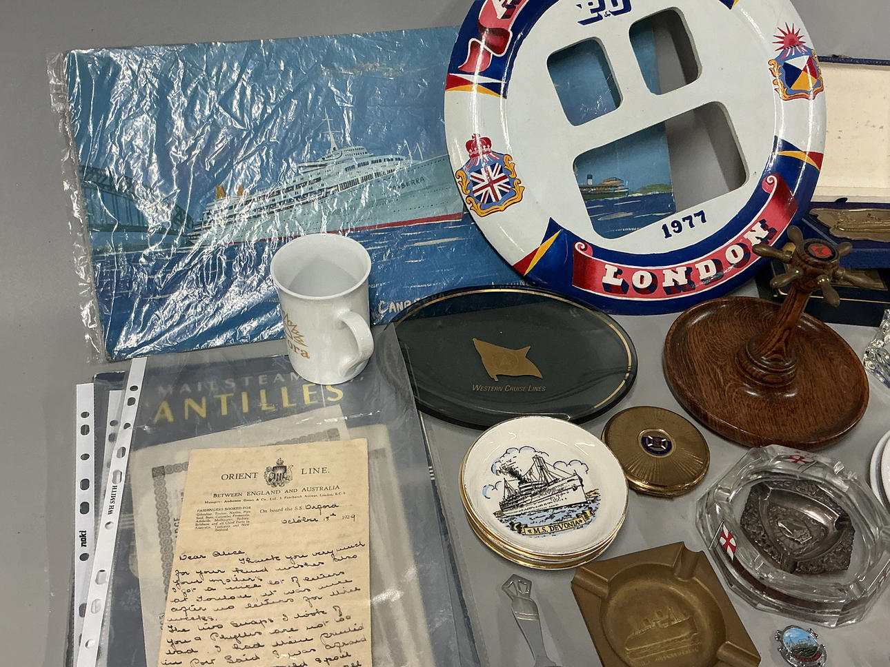 A quantity of mixed shipping company liner items such as dishes, ashtrays, and other related items, approximate volume 55 x 35 x 29cm.