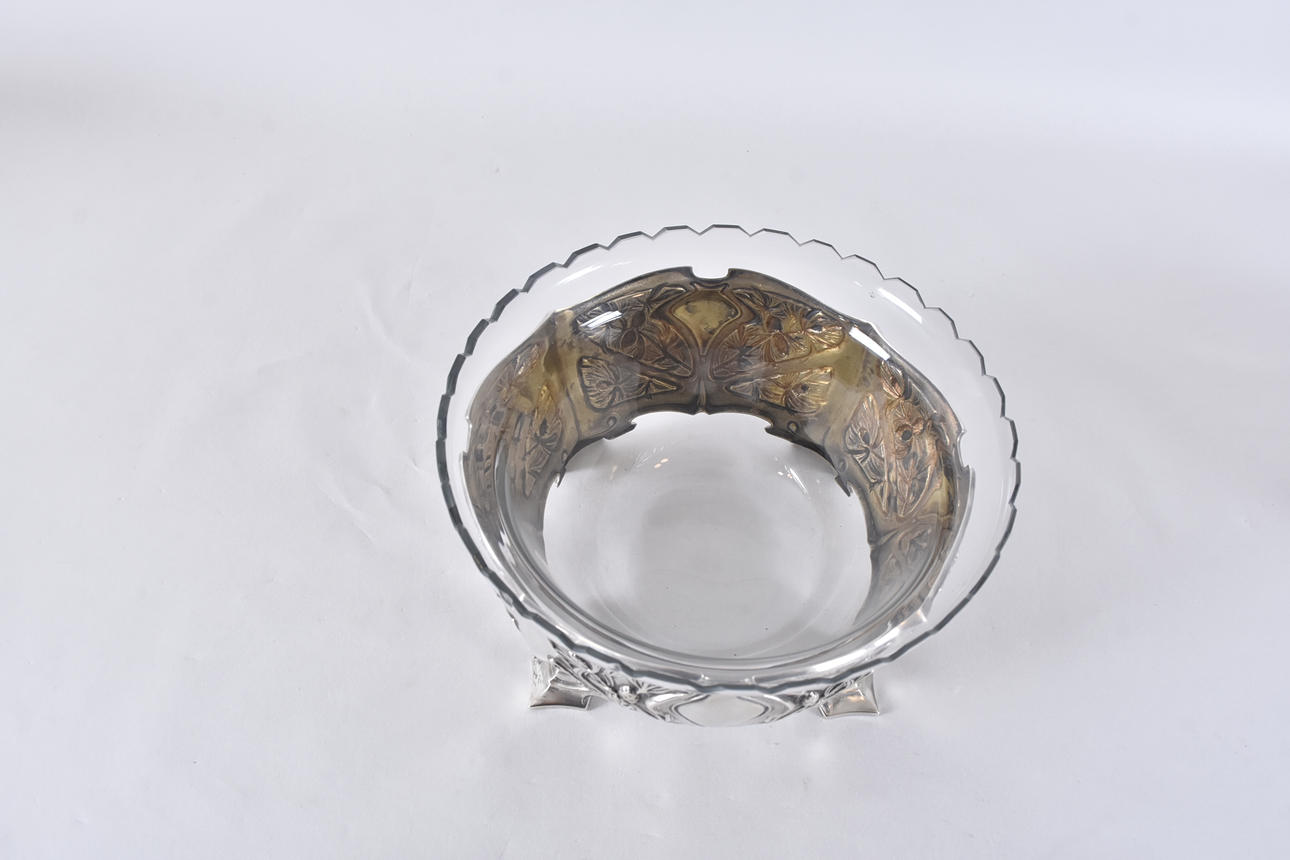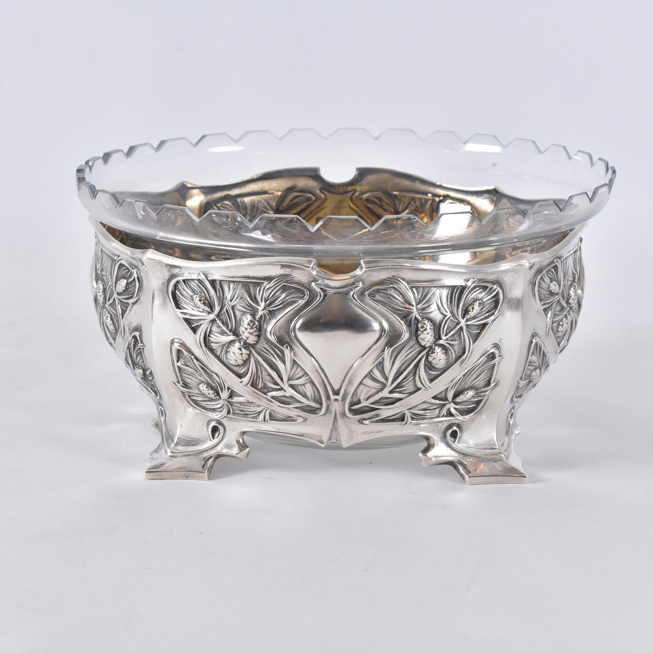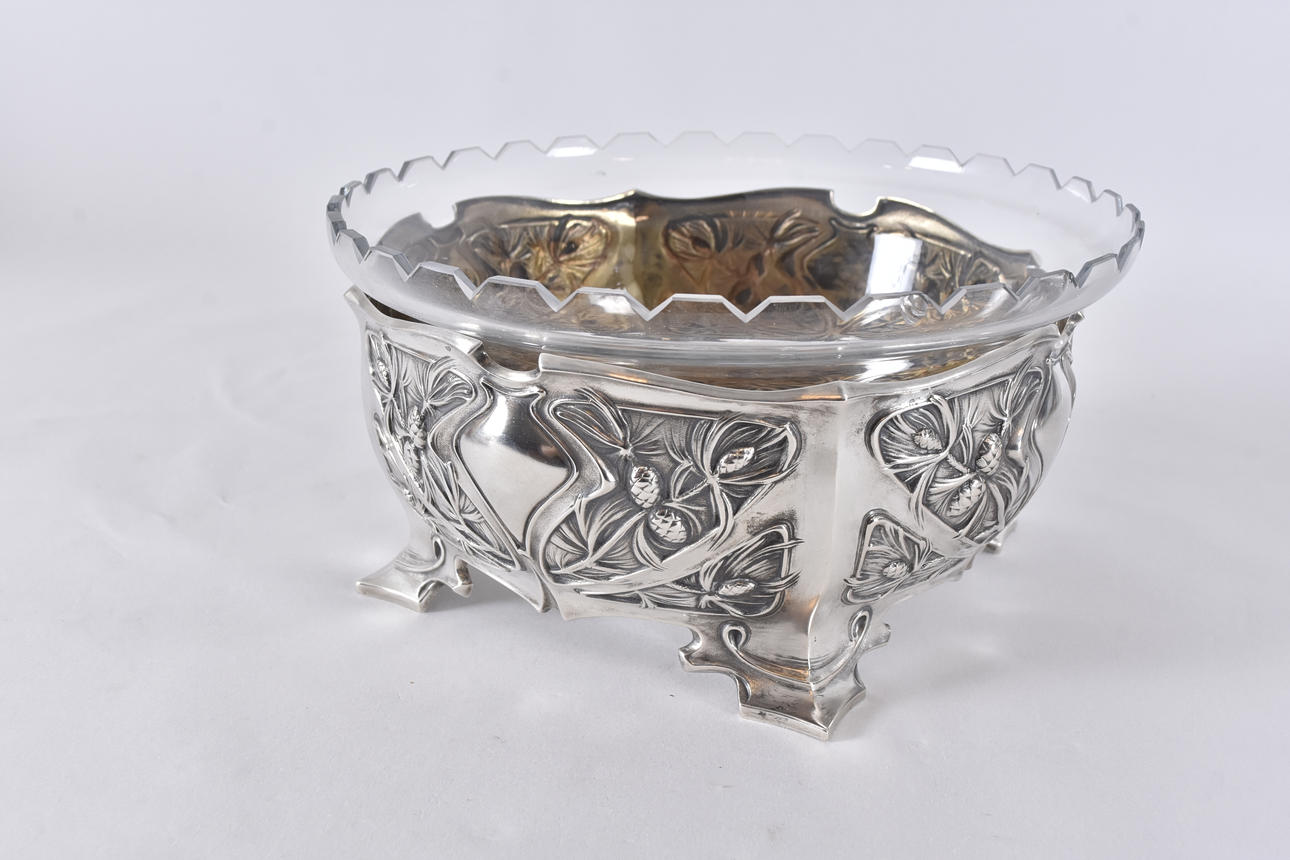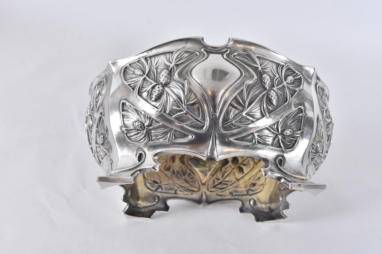 Art Nouveau, turn of the century 1900, decor of pine branches, etc., Swedish import stamp before 1912, dia 23, h 12 cm silver weight 442 grams.
