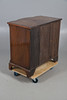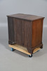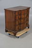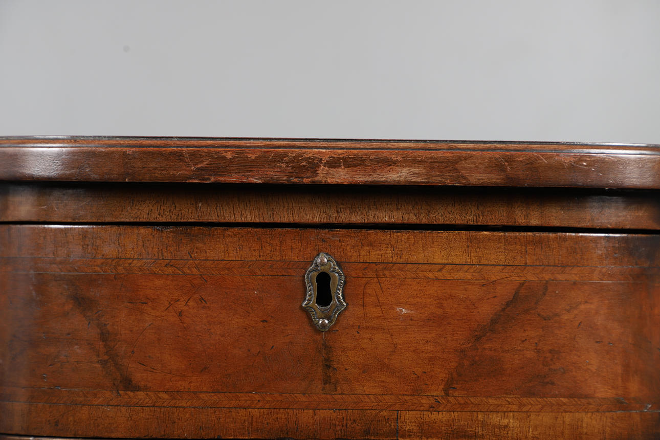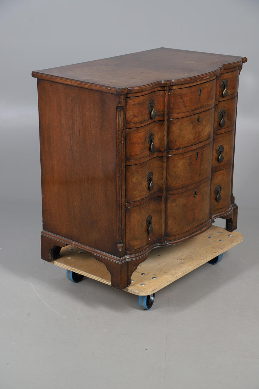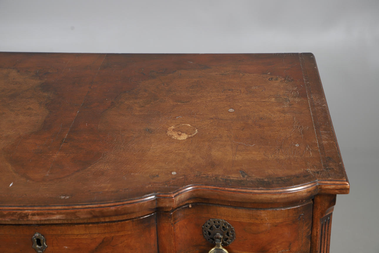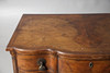 the featherbanded breakfront top over four drawers, reeded canted corners and bracket feet, 83cm high 86cm wide x 54cm deep.